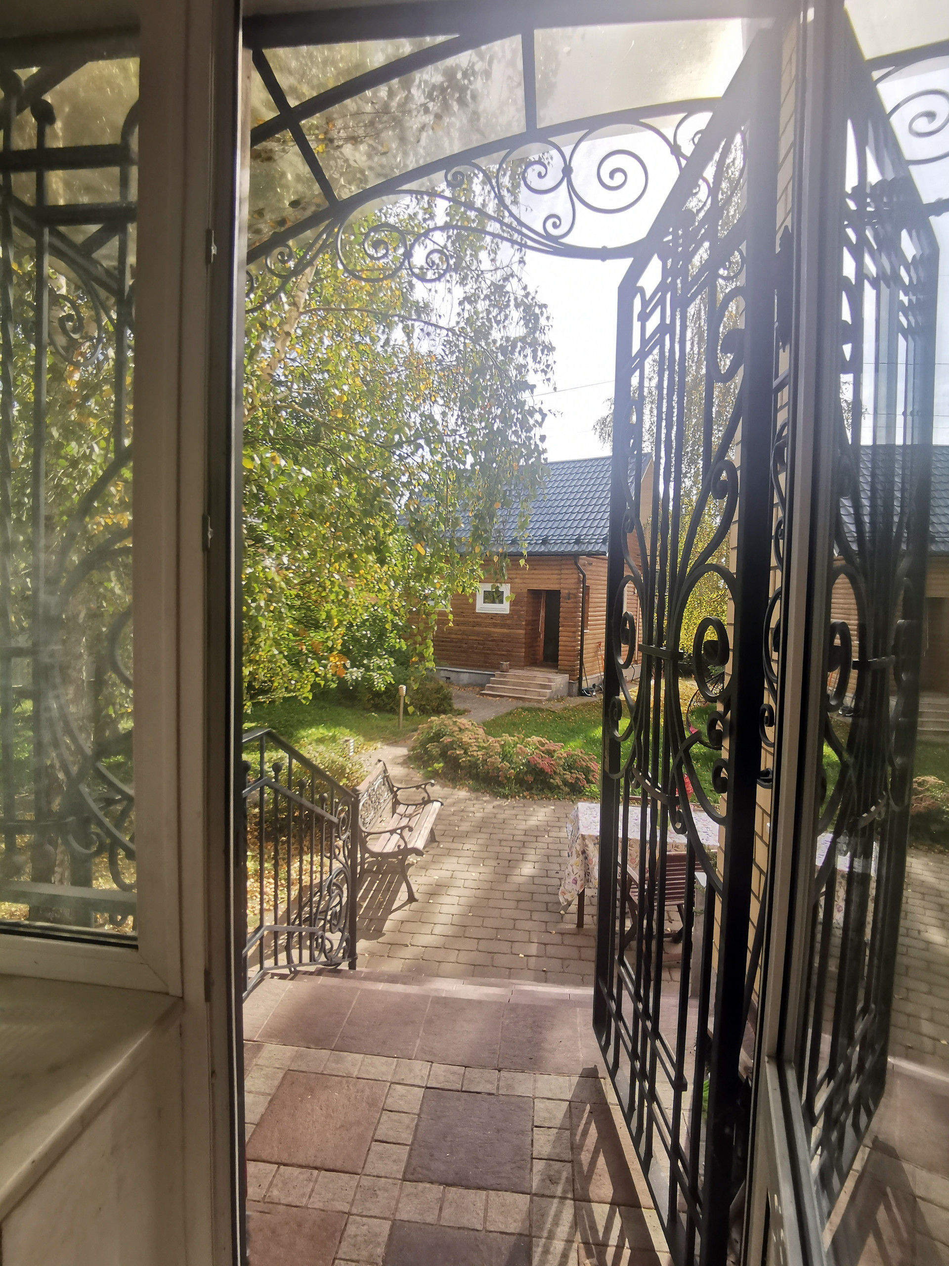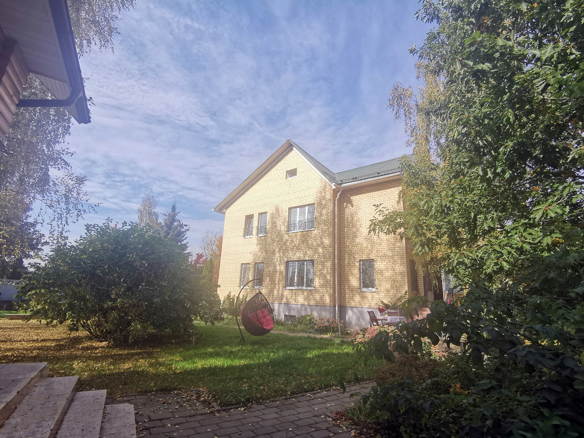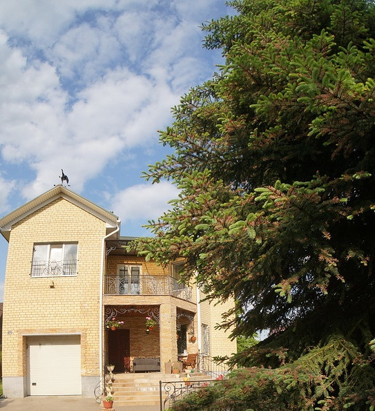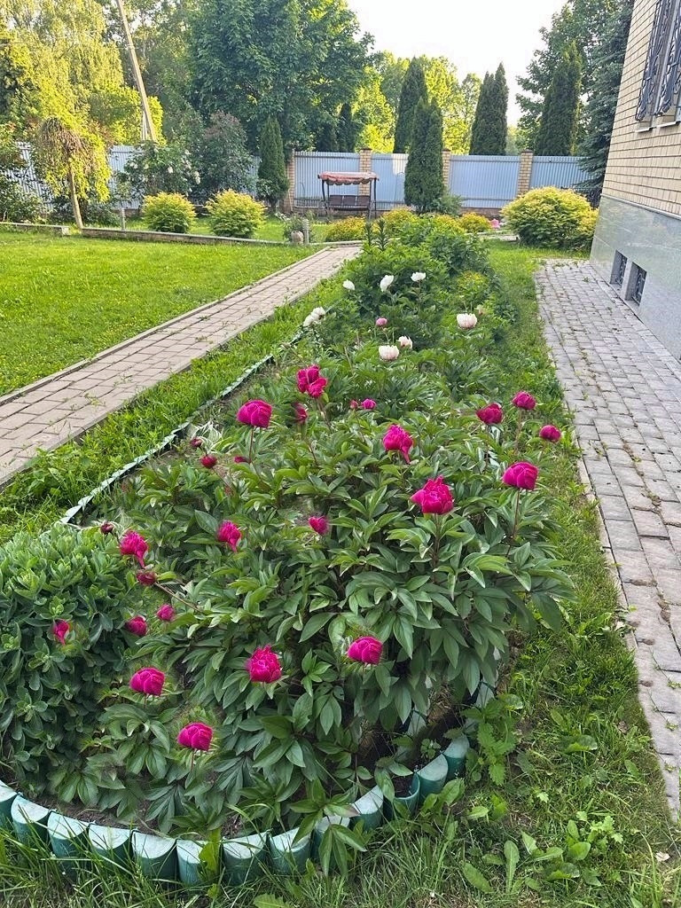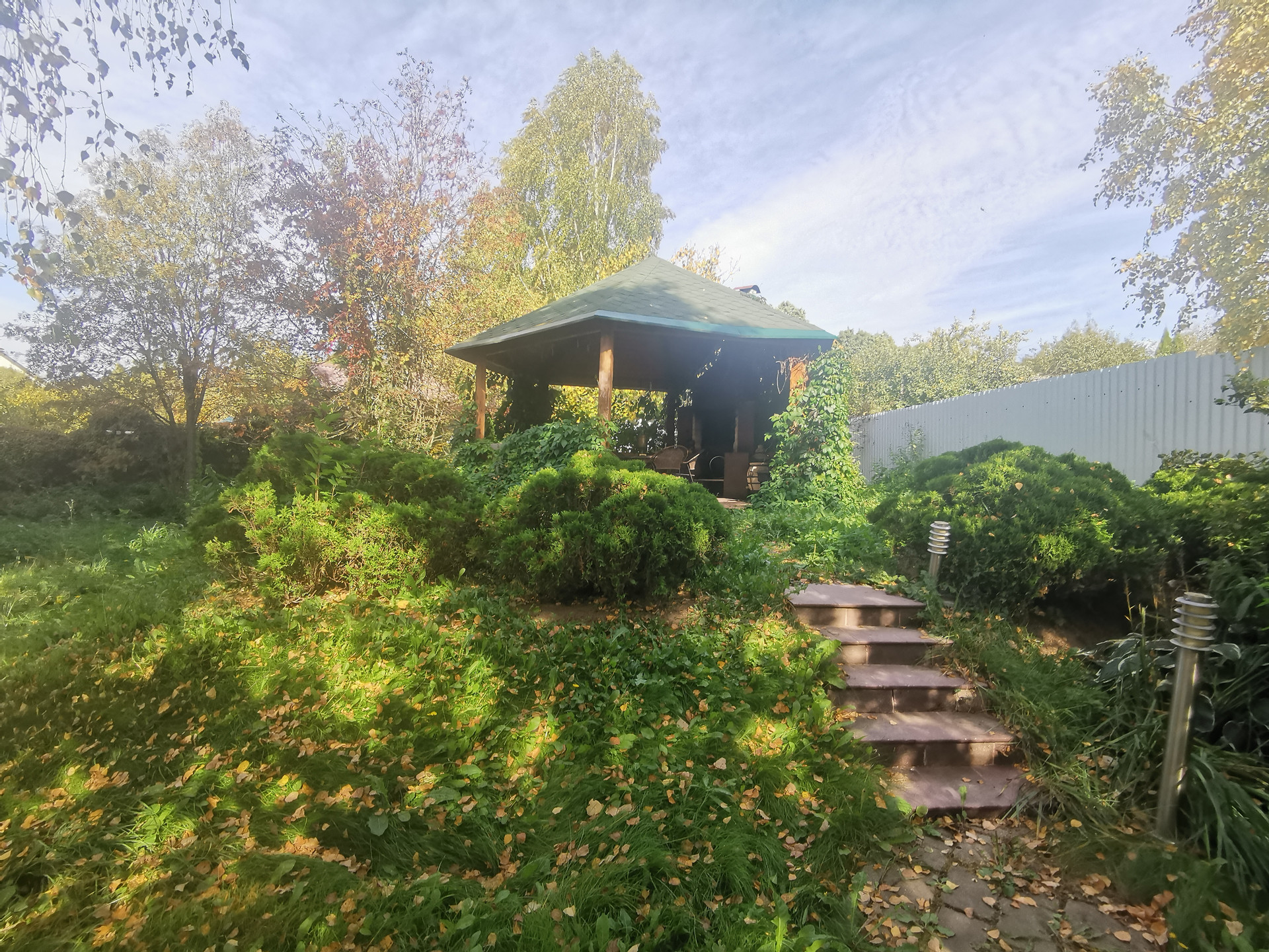 Участок полностью облагорожен: газон, туи, плодовые деревья и кустарники, клумбы-цветники, рабатки, дикий-виноград.