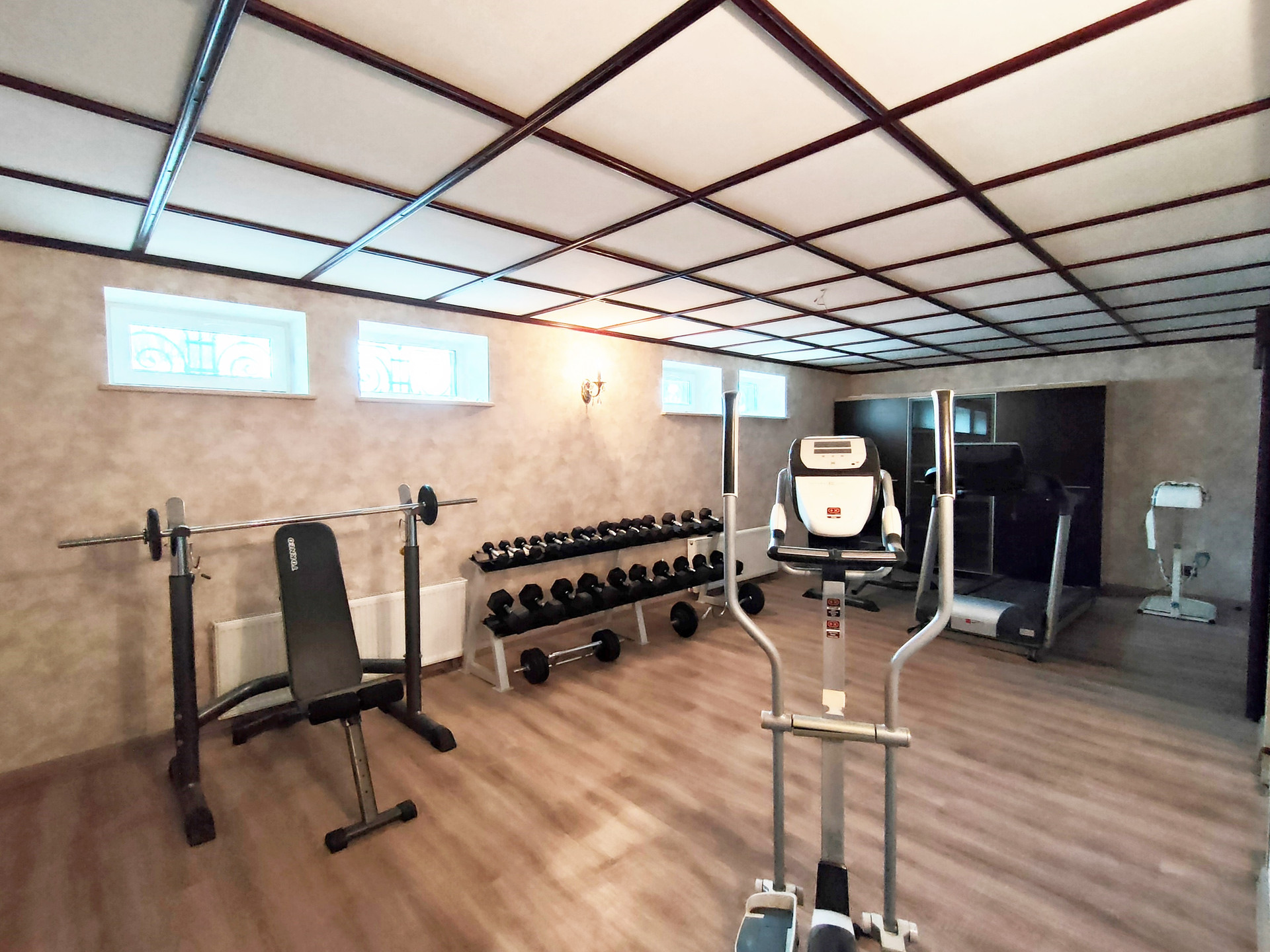 Цокольный этаж - котельная, санузел, постирочная с душевой, помещения для хранения, спорт зал, винный погреб.