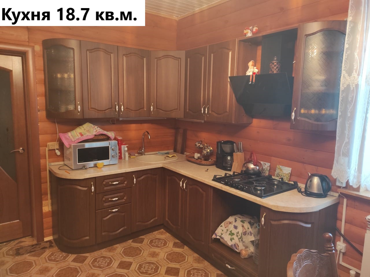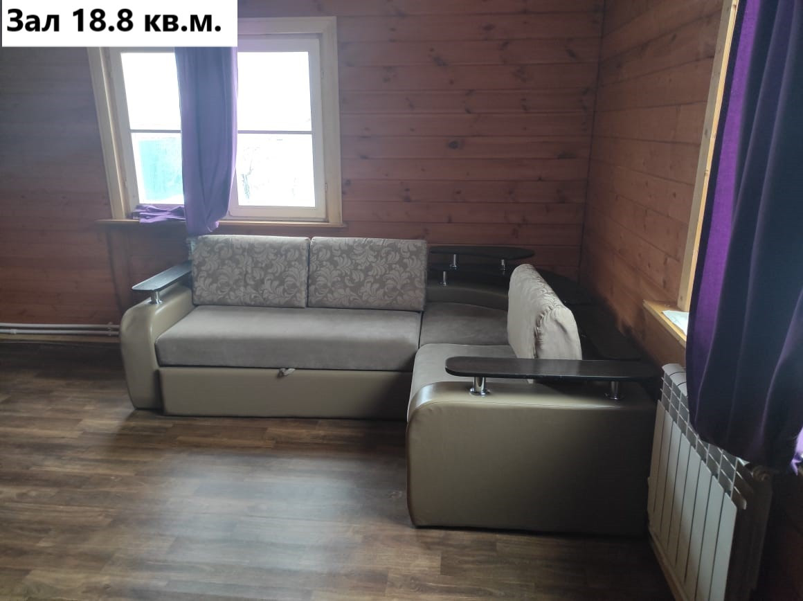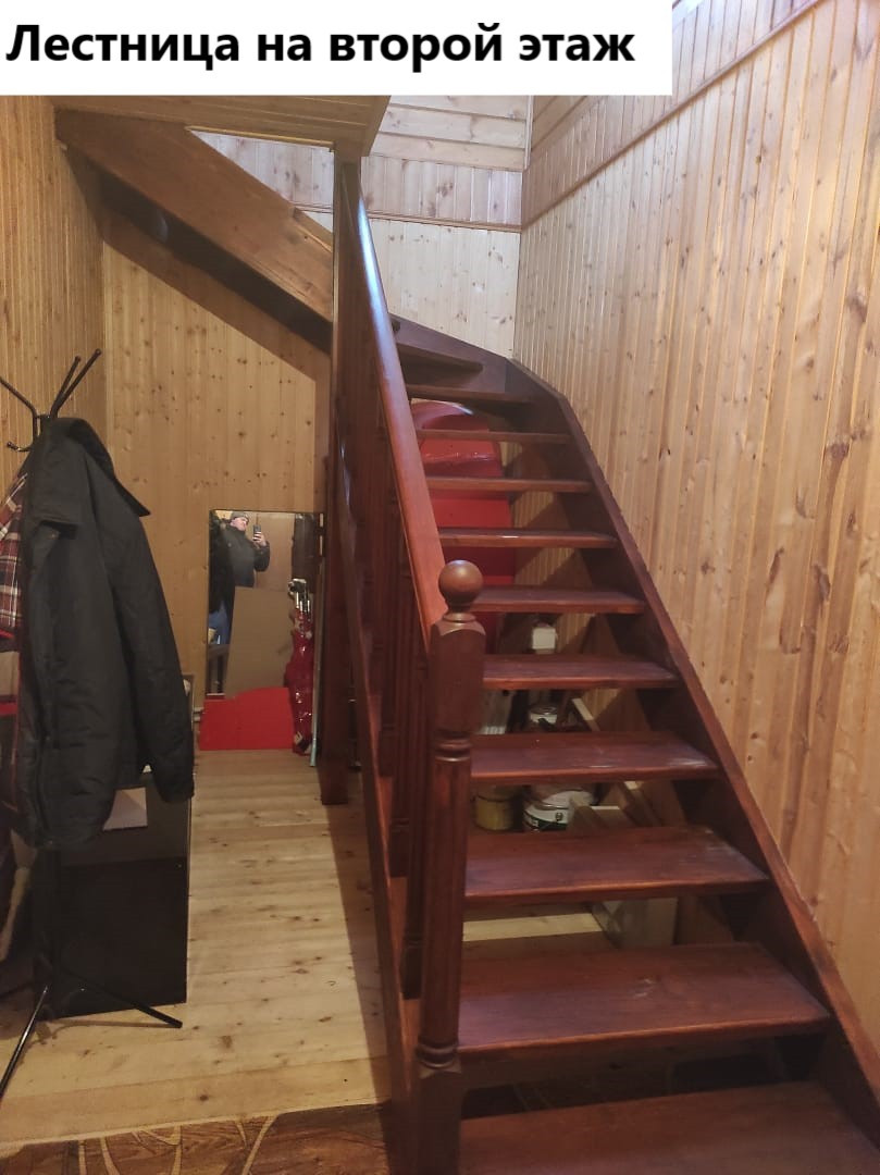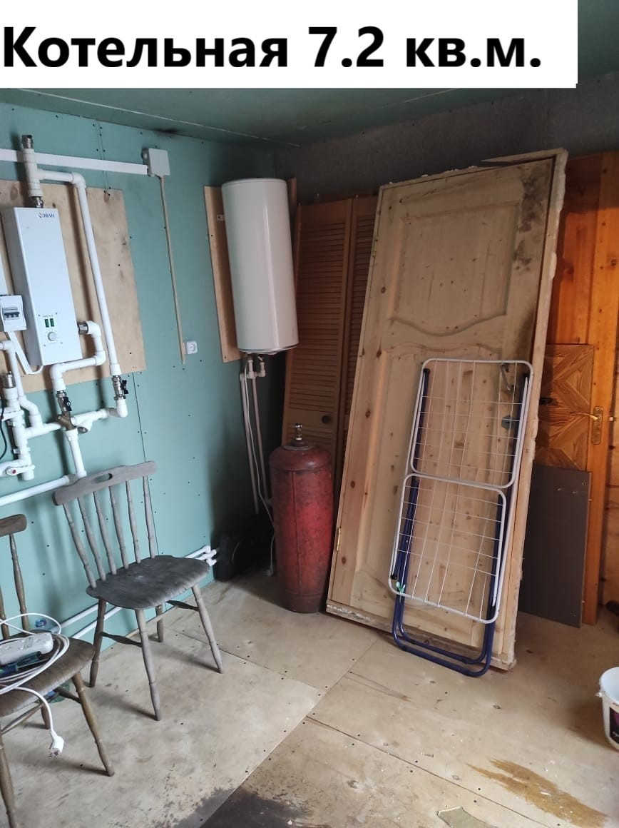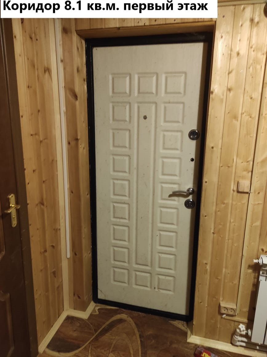 Первый этаж: коридор 8.1 кв.м, котельная 7.2 кв.м. (водонагреватель, котёл электрический 14 квт, газовый баллон), зал 18.8 кв.м.(угловой диван, двустворчатый шкаф с антресолью), кухня 18.7 кв.м. ( кухонная стенка с вытяжкой и газплитой, раскладной диван, обеденный стол), санузел 7.7 кв.м. (раковина с тумбой и зеркалом, пенал для белья, ванное корыто, унитаз), коридор 10.6 кв.м. Лестница деревянная 4.5 кв.м.