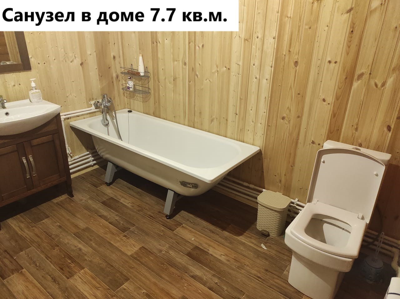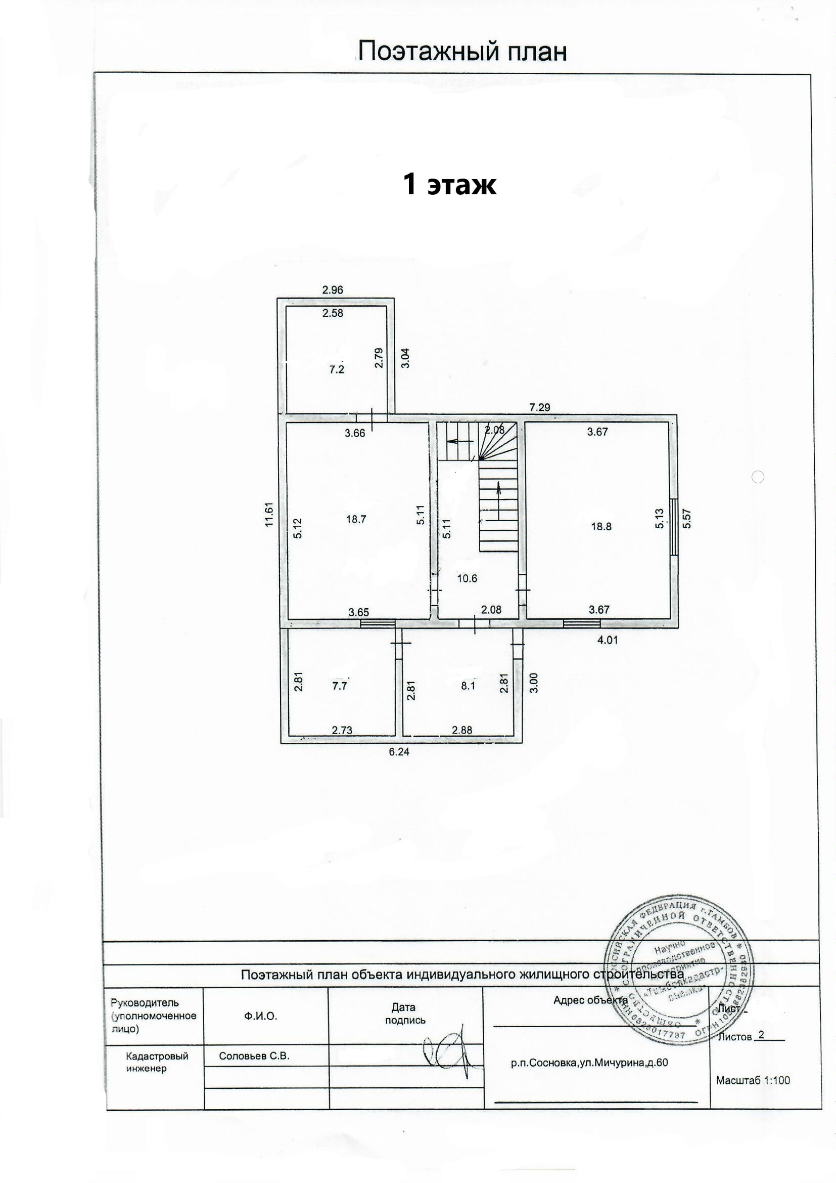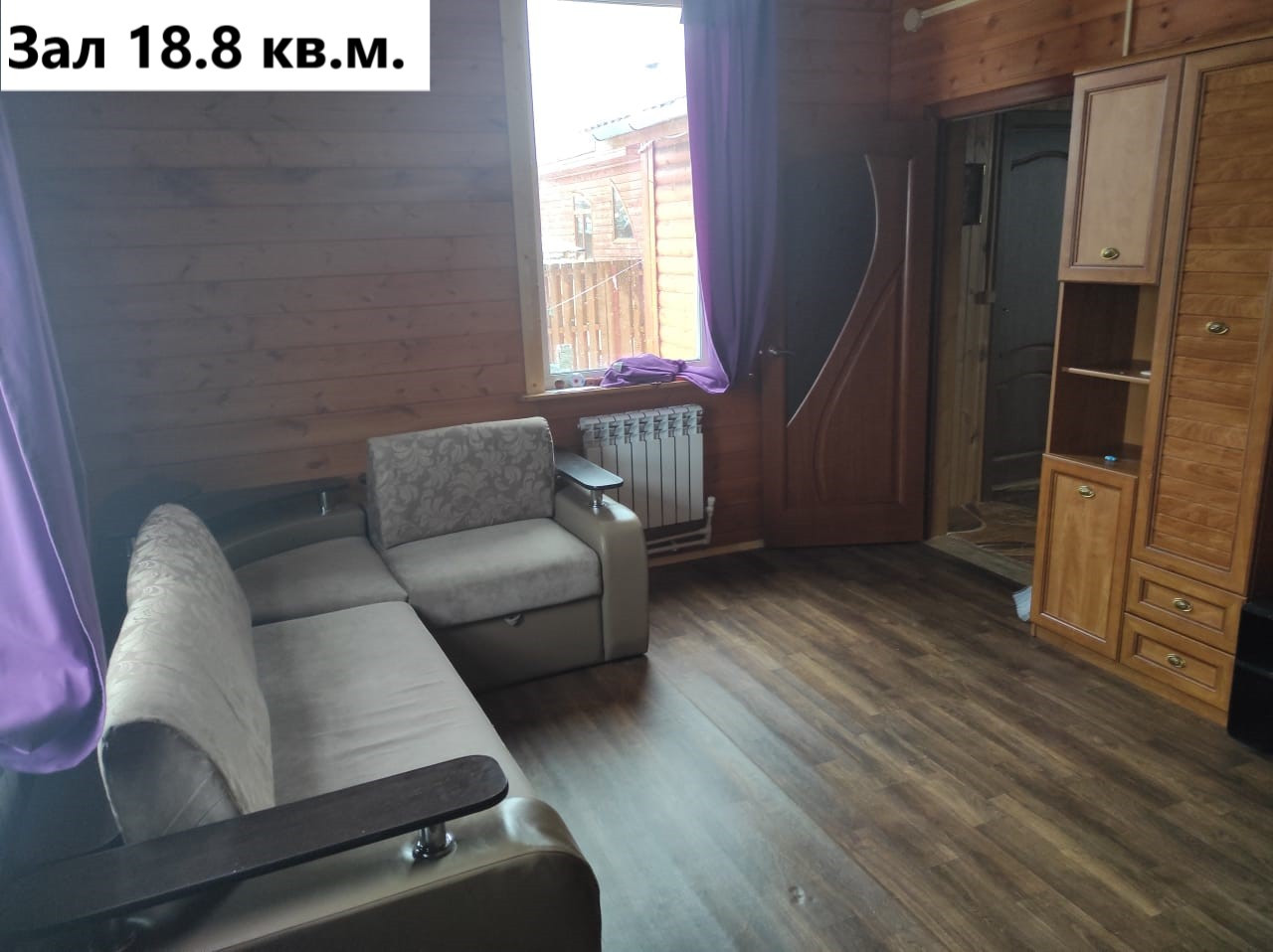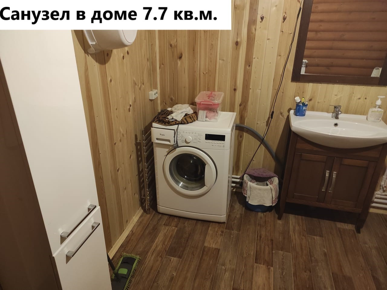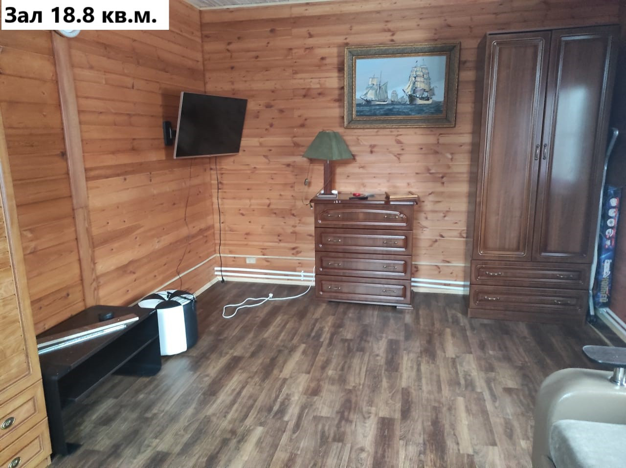 Первый этаж: коридор 8.1 кв.м, котельная 7.2 кв.м. (водонагреватель, котёл электрический 14 квт, газовый баллон), зал 18.8 кв.м.(угловой диван, двустворчатый шкаф с антресолью), кухня 18.7 кв.м. ( кухонная стенка с вытяжкой и газплитой, раскладной диван, обеденный стол), санузел 7.7 кв.м. (раковина с тумбой и зеркалом, пенал для белья, ванное корыто, унитаз), коридор 10.6 кв.м. Лестница деревянная 4.5 кв.м.