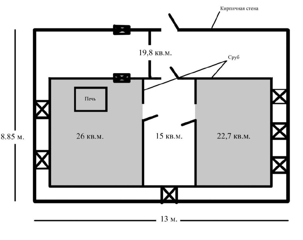 Общая площадь дома 115 кв. м. Дом представляет собой 2 бревенчатых сруба, объединенных под одной крышей и обнесенной кирпичной стеной.