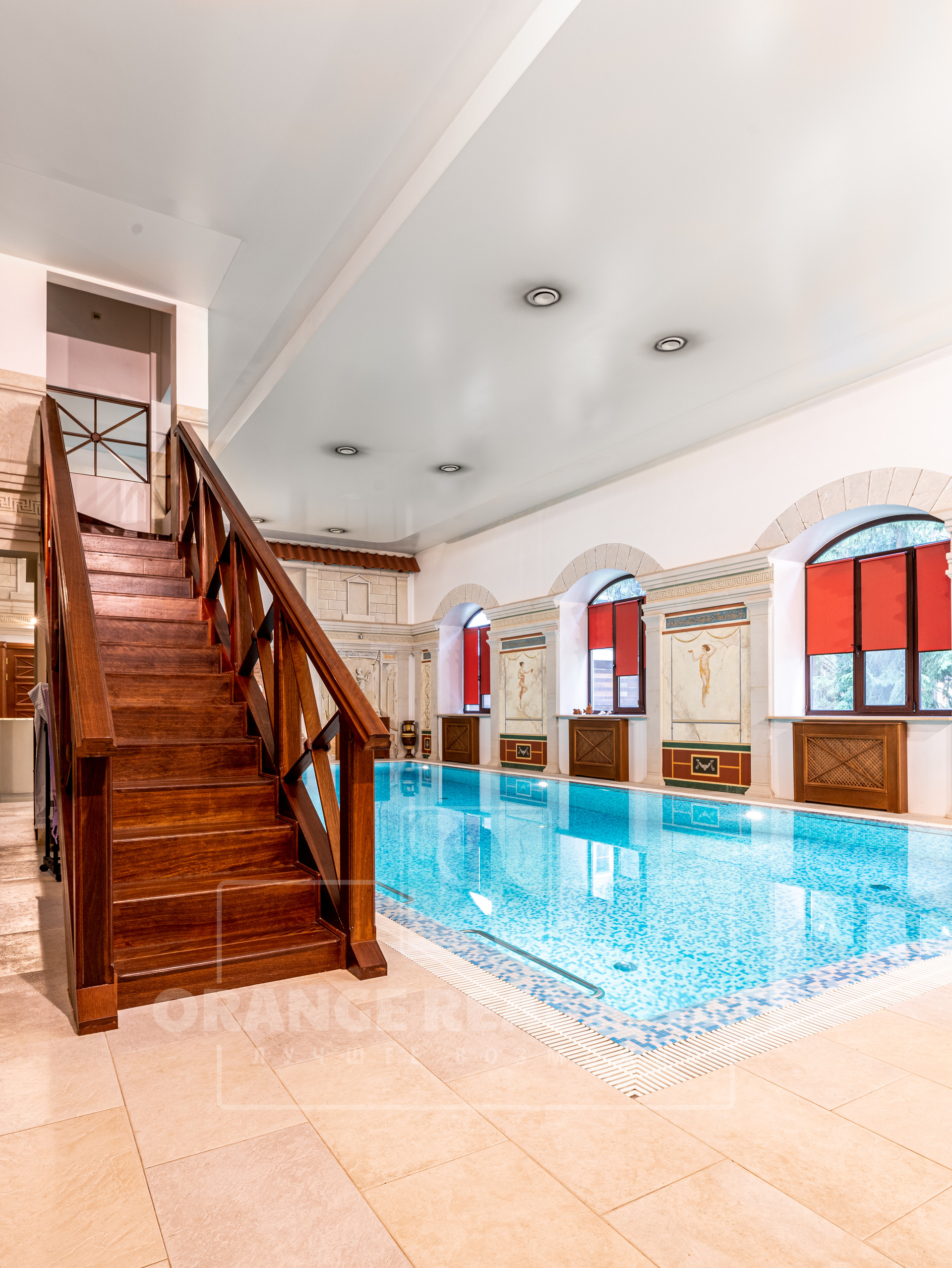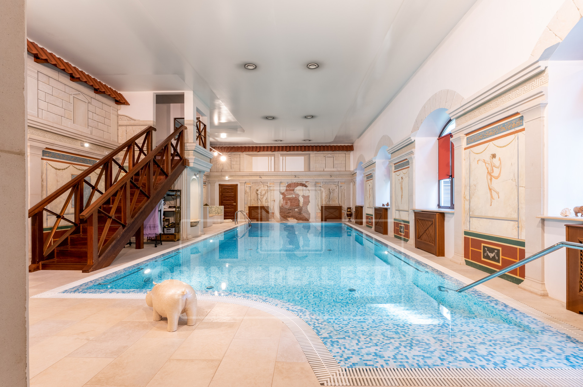 Бассейн 12,5 м на 5 м, глубина 3 м, объем 100 м.куб. с противотоком и гидромассажем. На стенах фрески ручной работы. Система вентиляции с фильтрацией подогревом и рекуперацией воздуха.