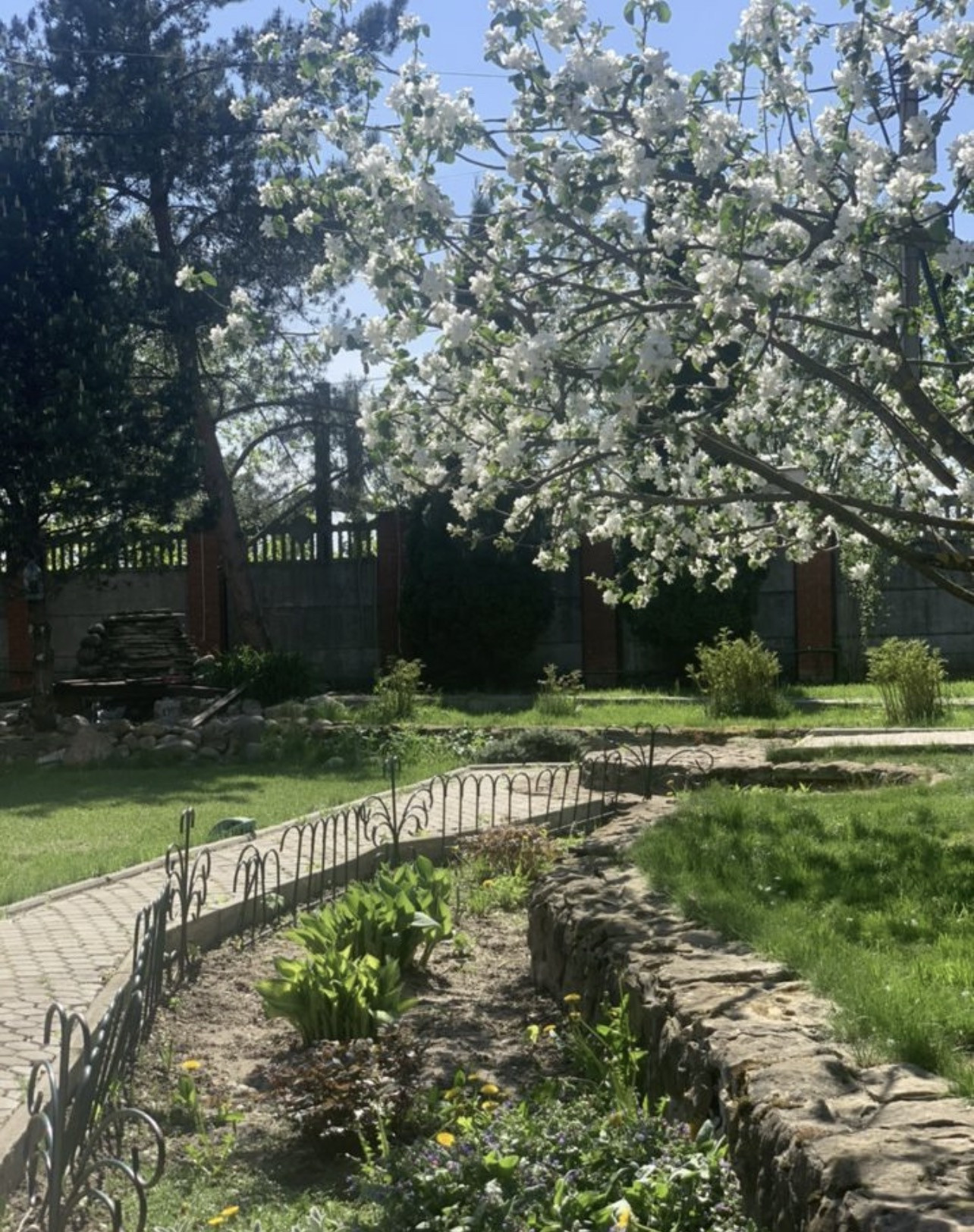 ~Зона отдыха с качелями, окруженная высокими туями, сиренью и жасмином.