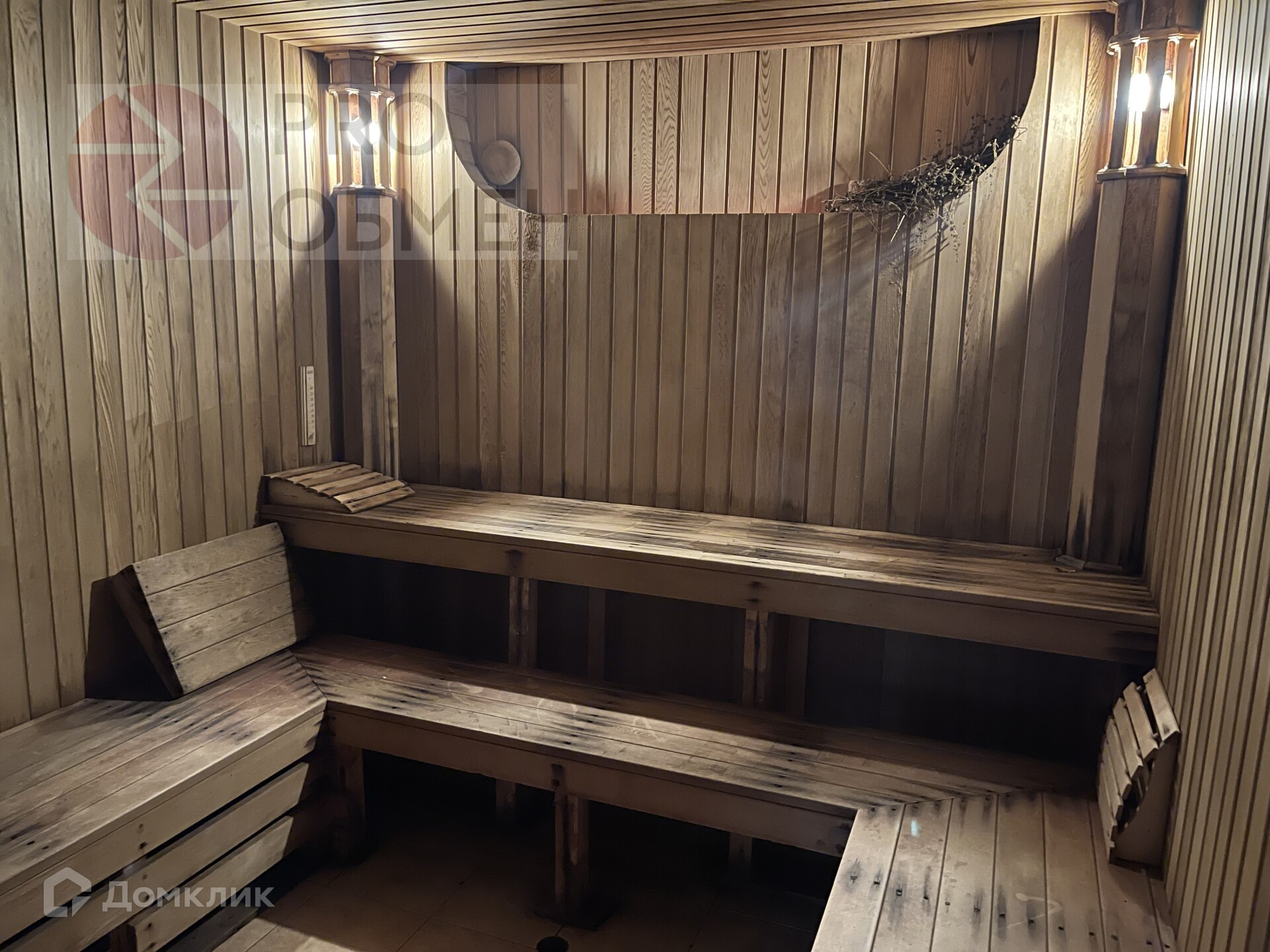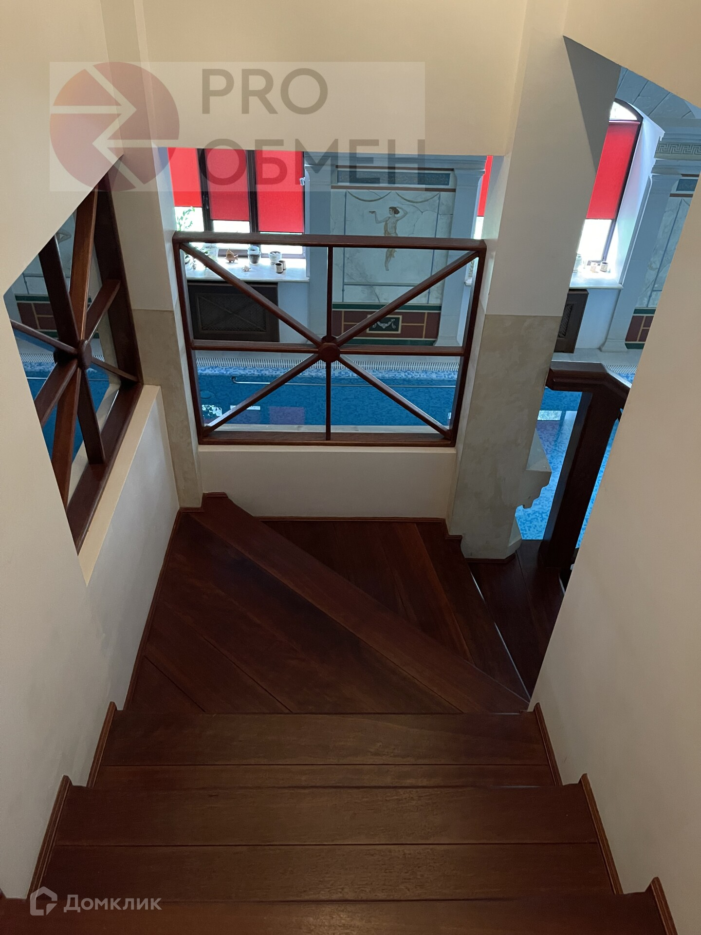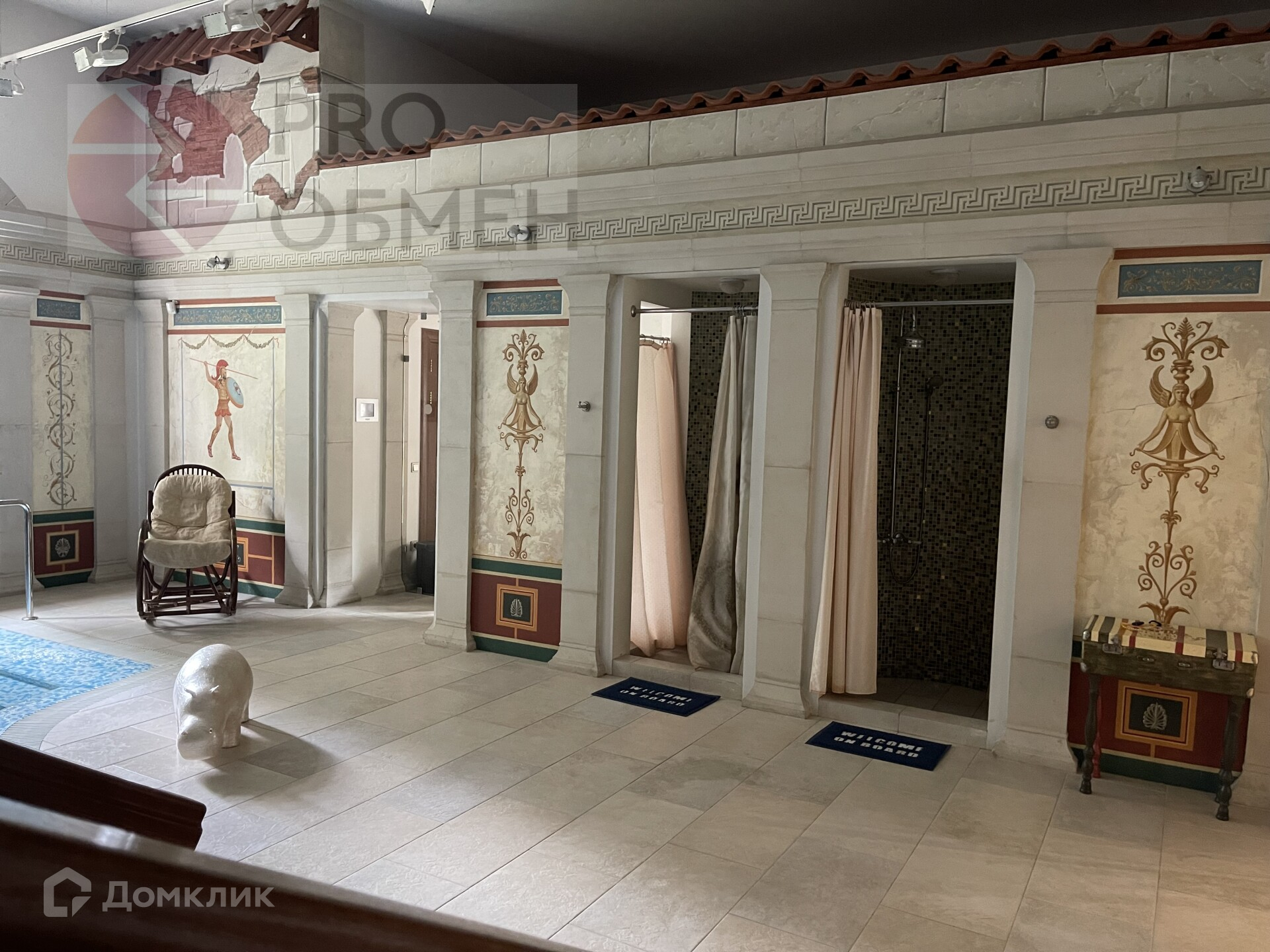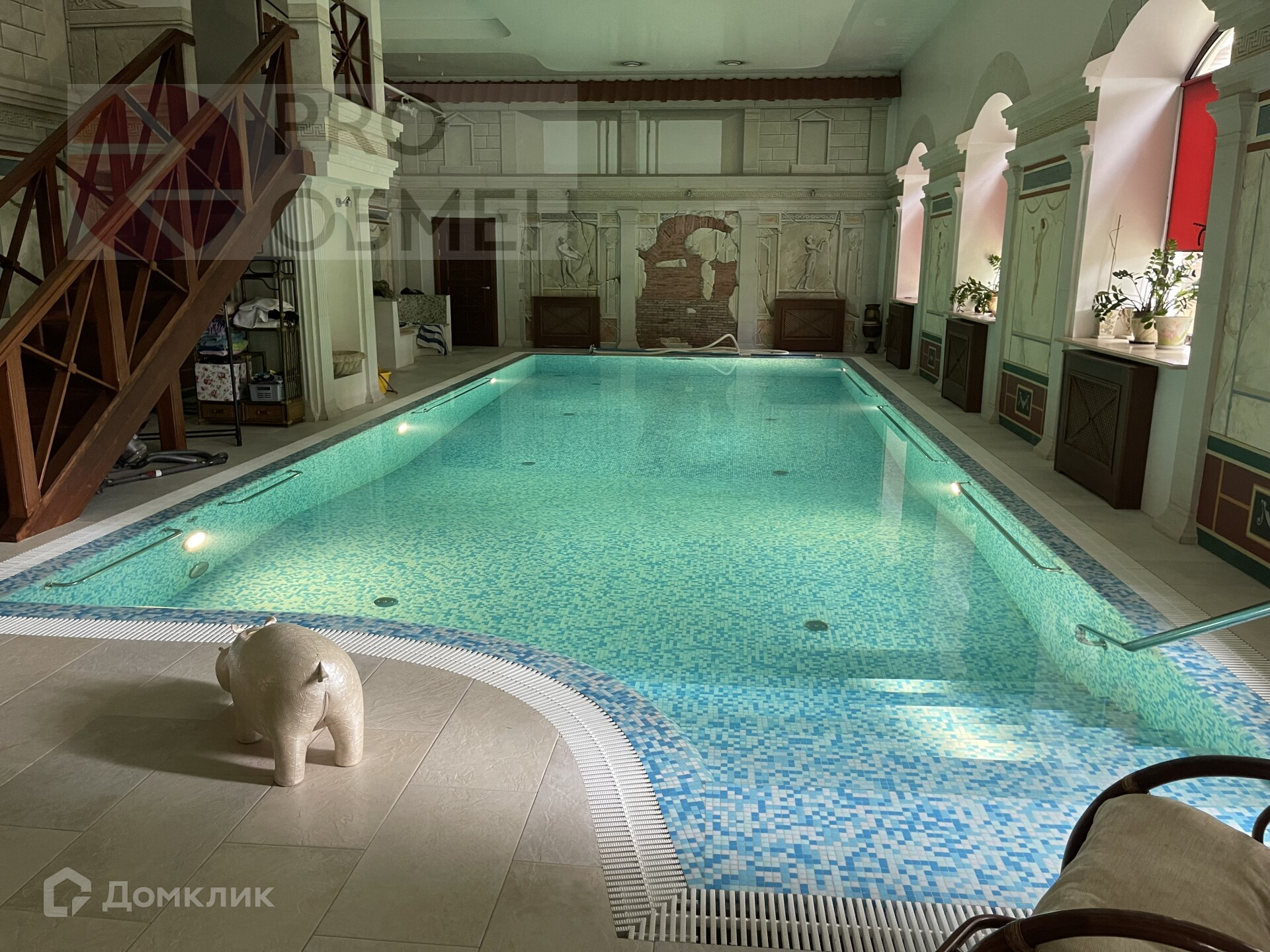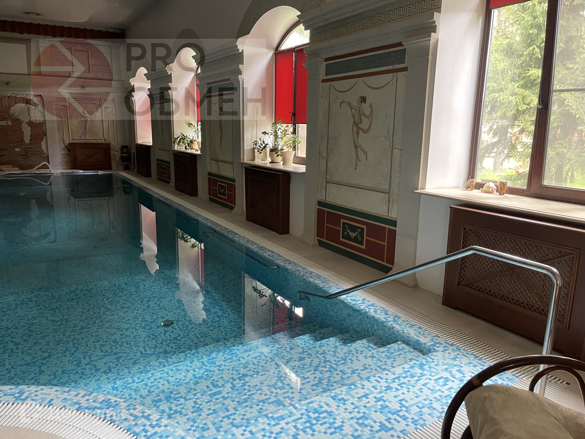 Бассейн 12,5 м на 5 м, глубина 3 м объем 100 м.куб с противотоком и гидромассажем . Система вентиляции с фильтрацией подогревом и рекуперацией воздуха,  2 душевые с раздевалками , сауна с печью Наrviа. Стены - фрески ручной работы .