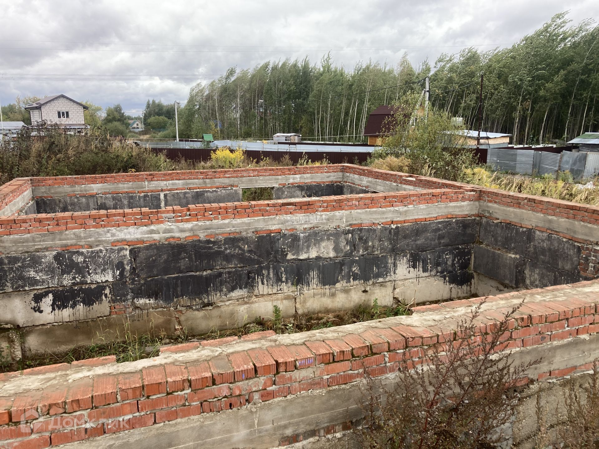 На участке есть капитальный фундамент 10х13 метров из ж/б блоков, все подготовлено для продолжения строительства.