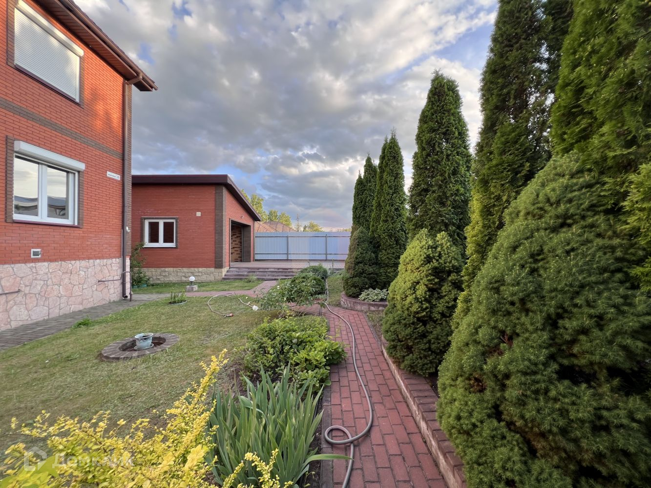 Безупречный ландшафтный дизайн участка, эстетичные и продуманные дорожки, освещение в сочетании с красившими туями, фонтаном, плодовыми деревьями и сортовыми кустарниками.