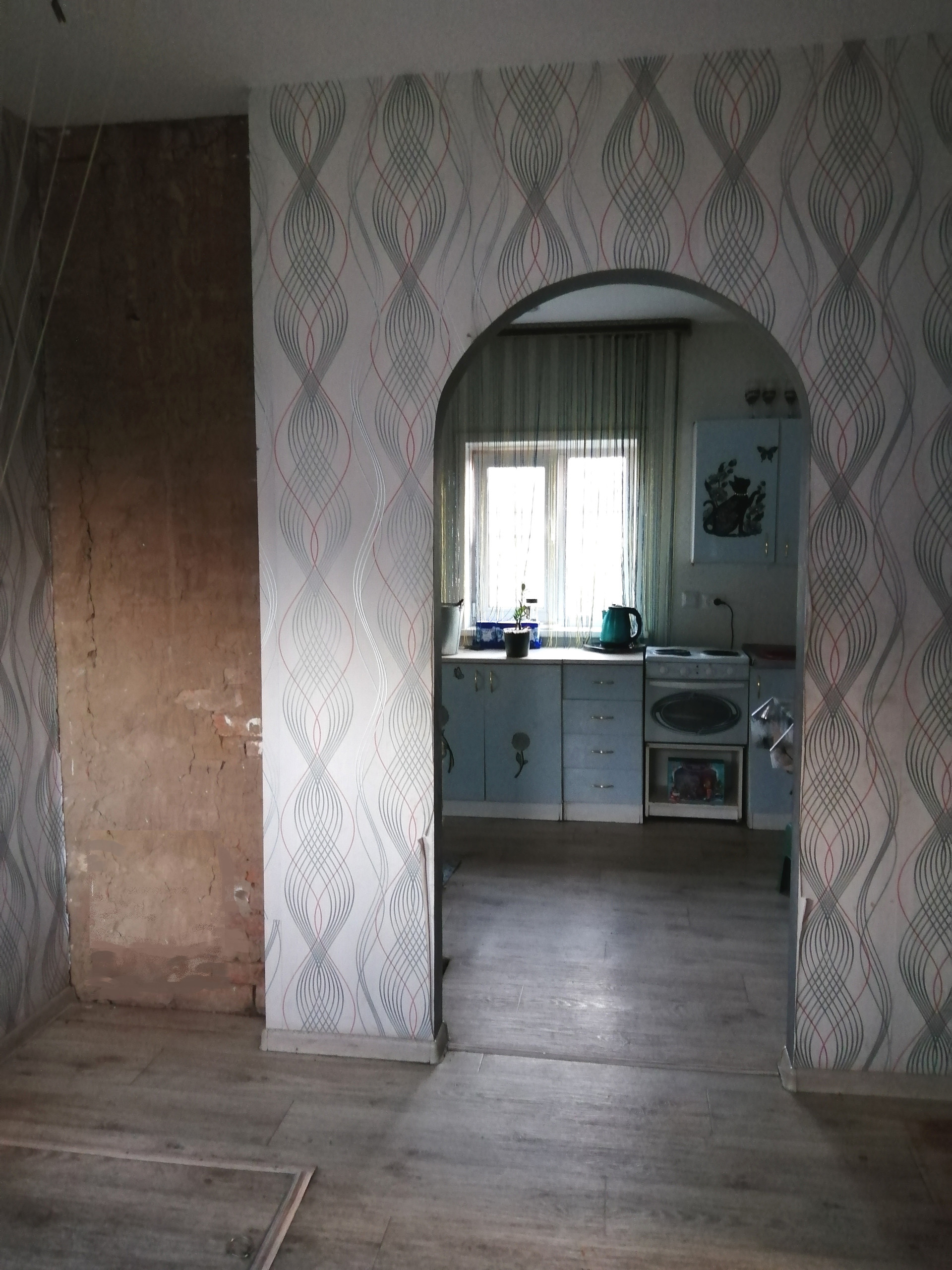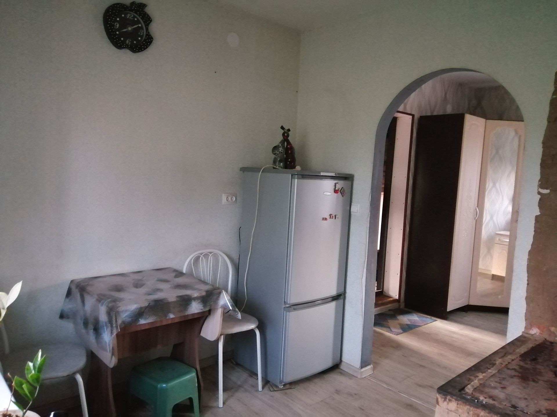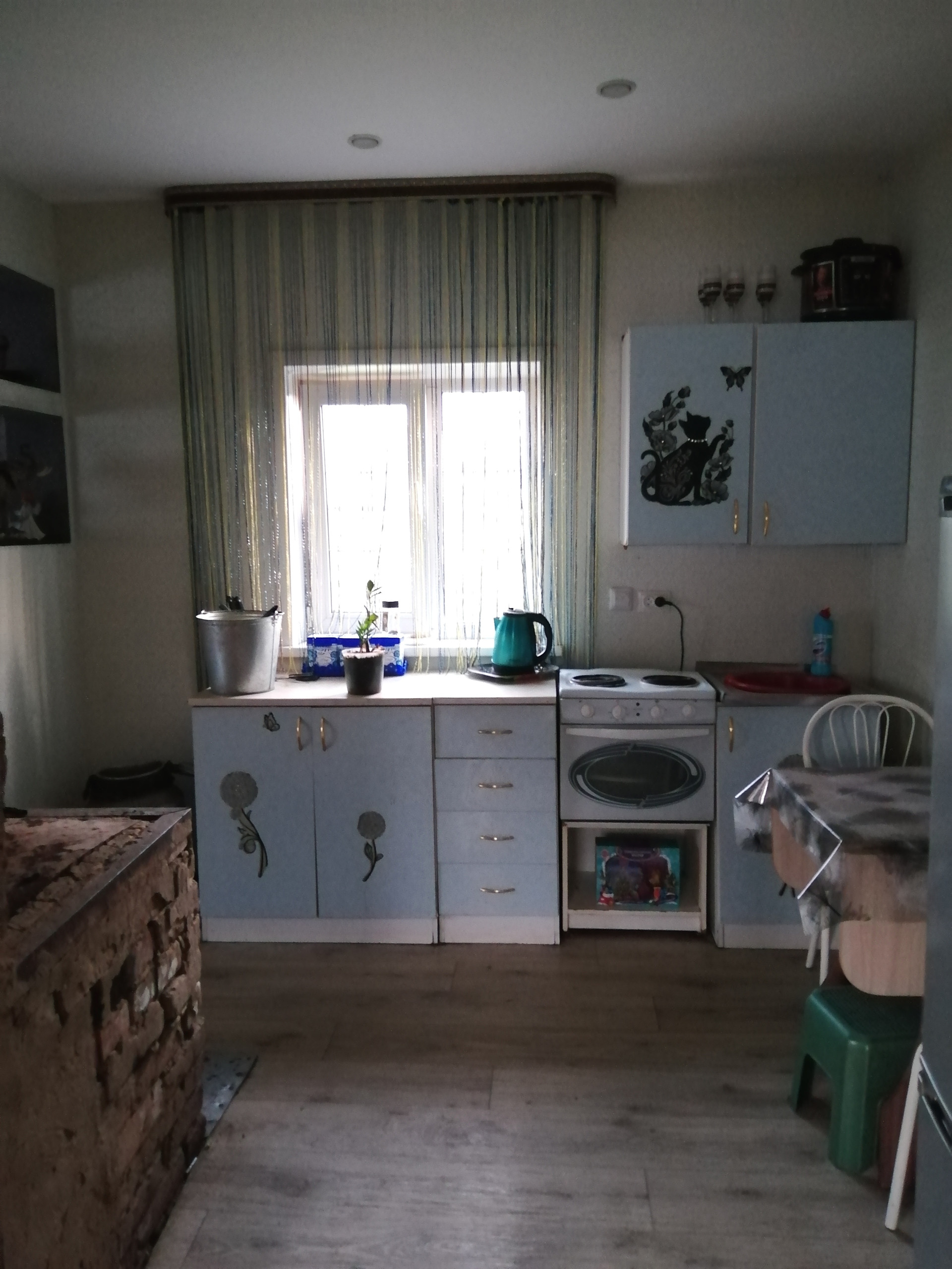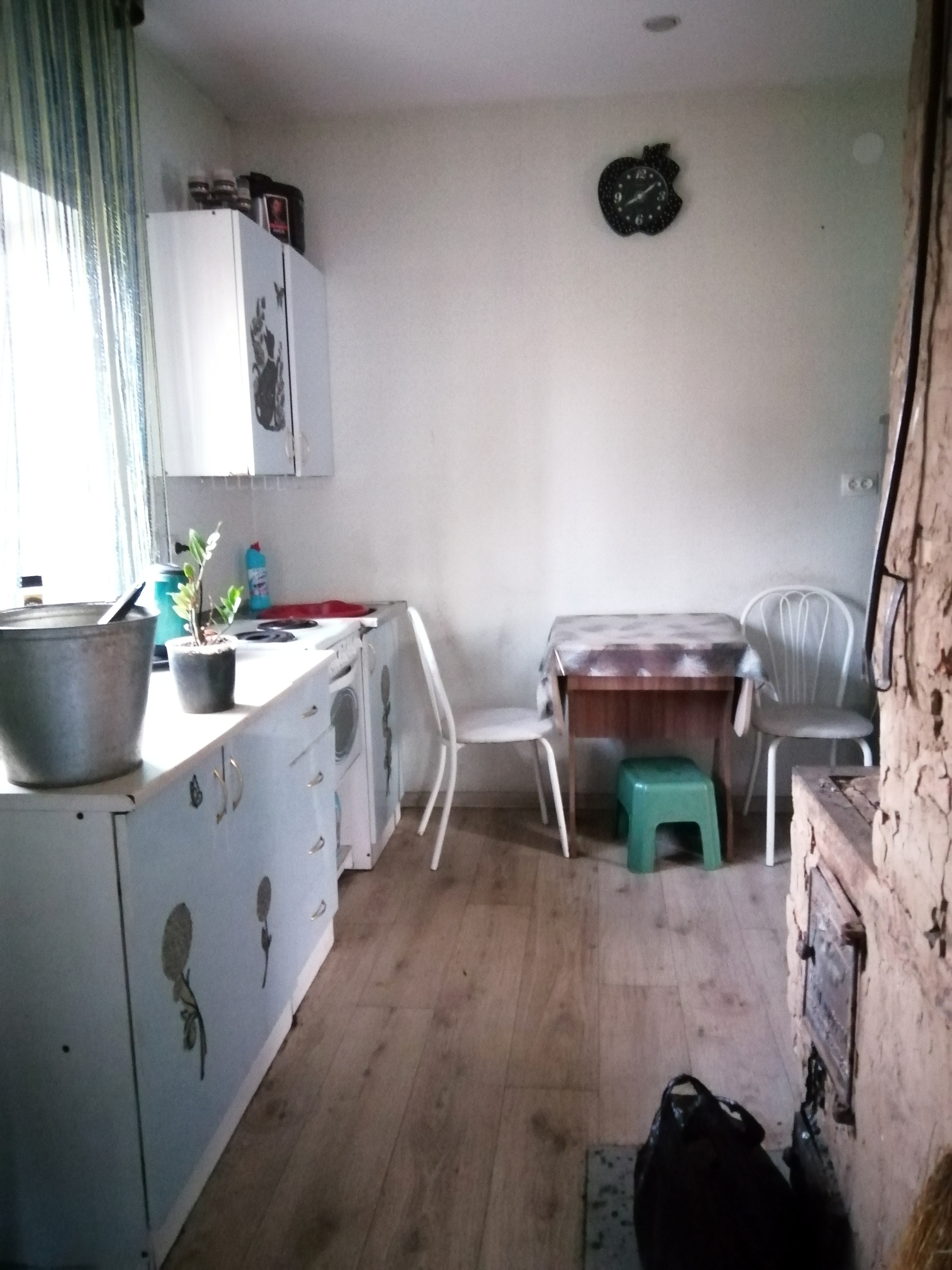 Оставляем кухонный гарнитур, электро печь, кухонный стол.