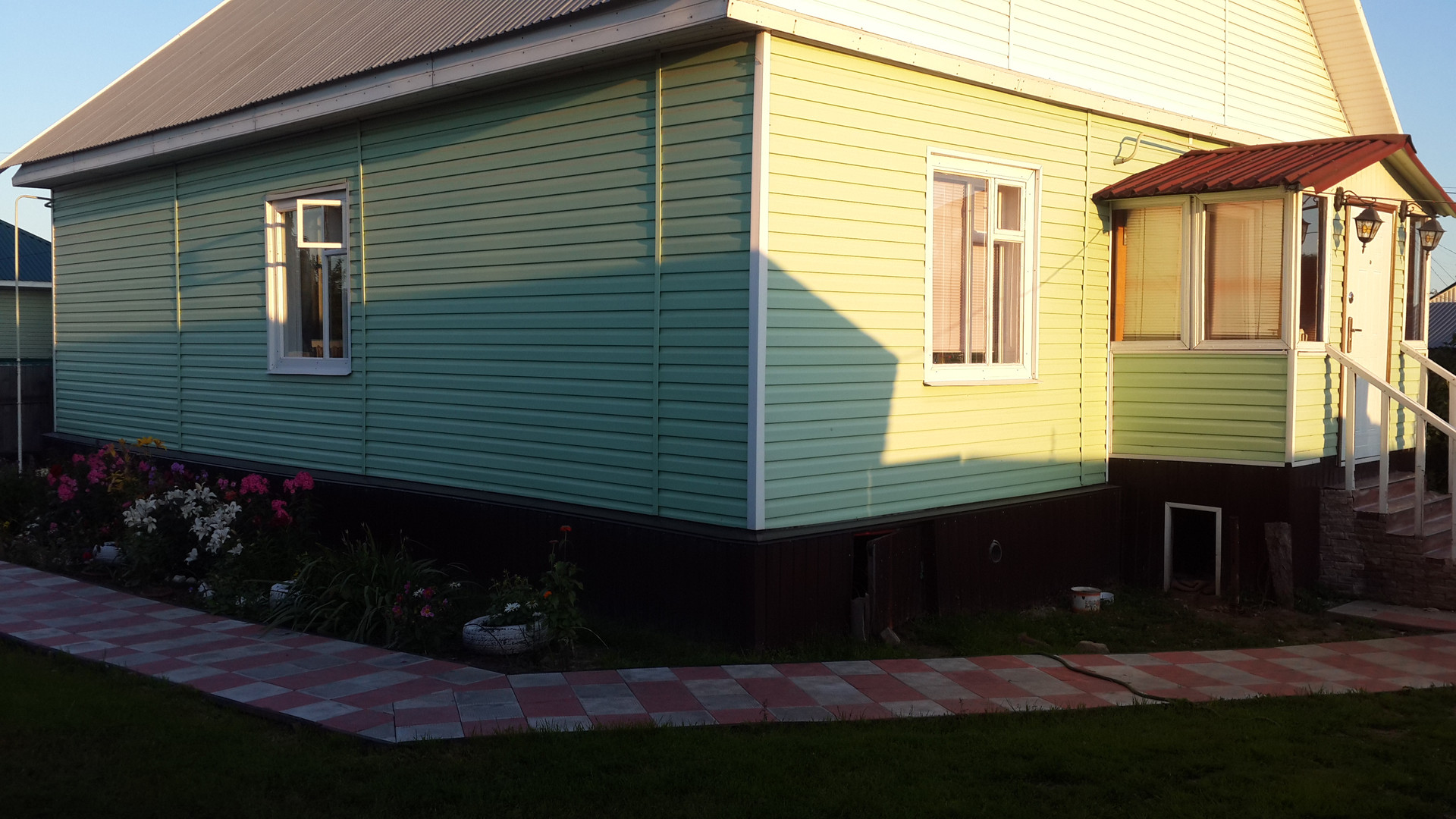 Дом из бруса. Фундамент состоит из блоков выложенных в три ряда. Обшит сайдингом. Крыша покрыта профнастилом. Полы деревянные настелен качественный линолеум.