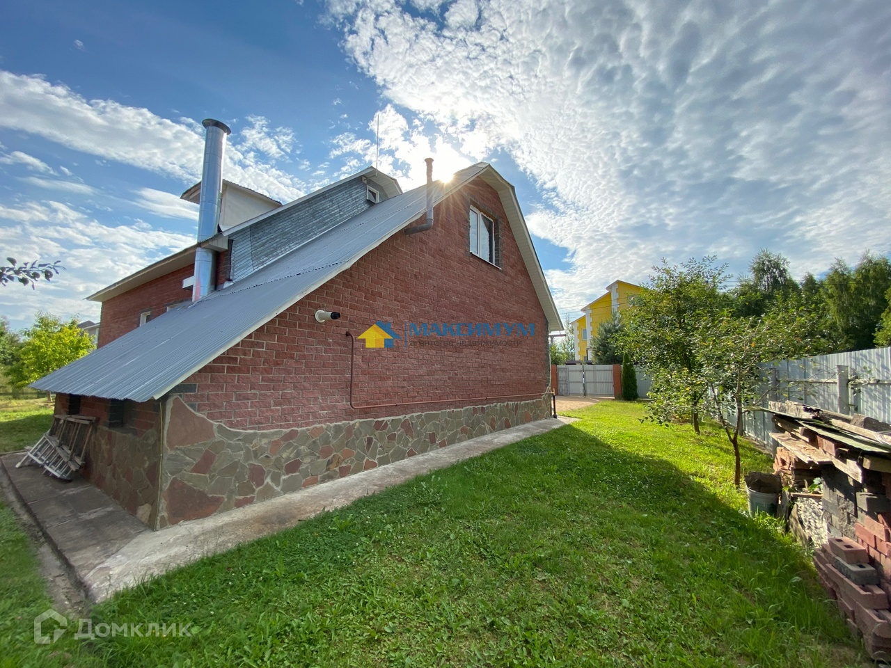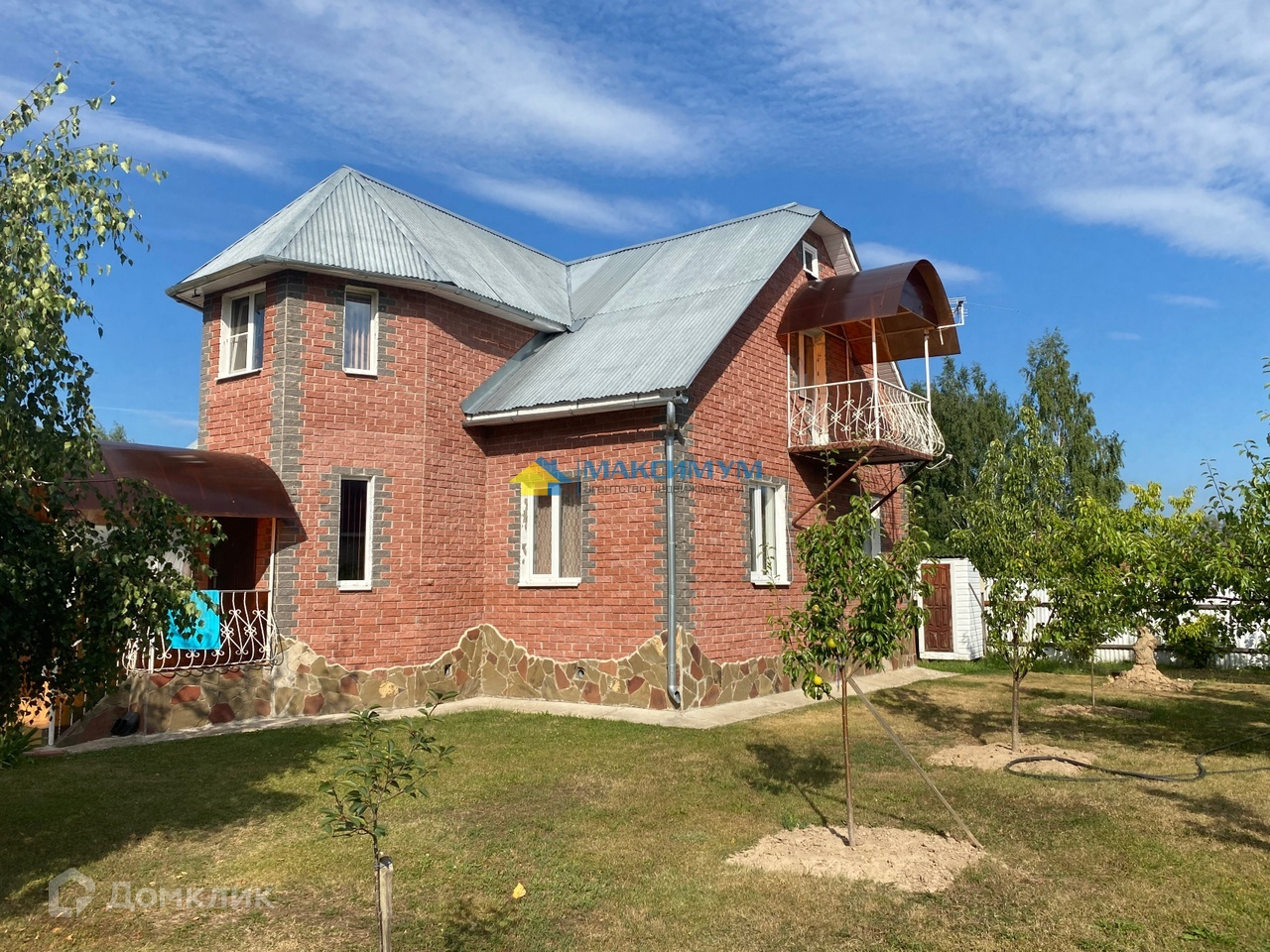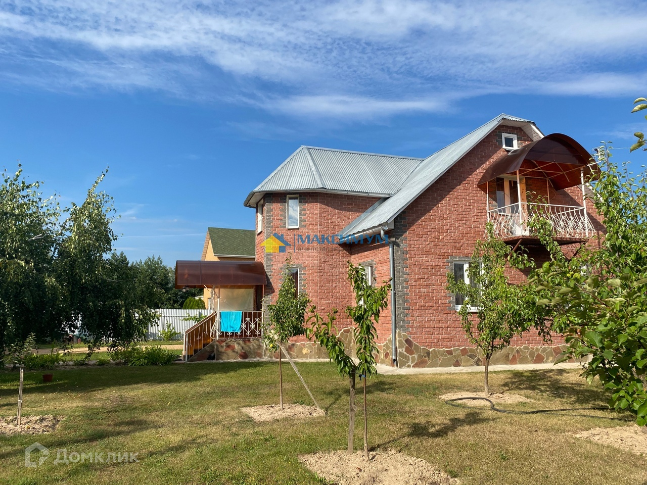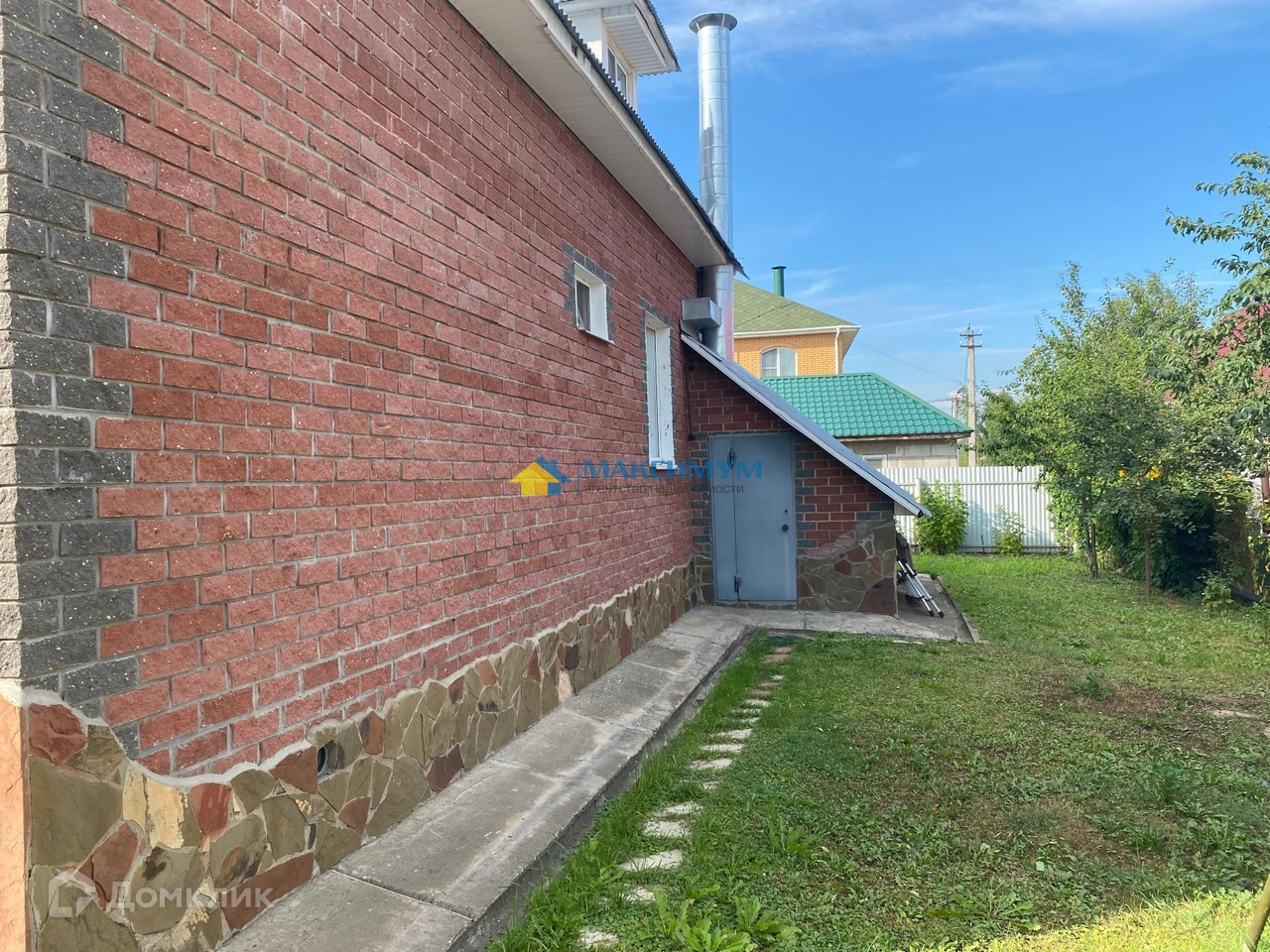 Двухэтажный дом из бруса построен на ленточном фундаменте. Дом полностью утеплен и фасад отделан кирпичом и декоративным камнем. Вокруг дома сделана бетонная отмостка.