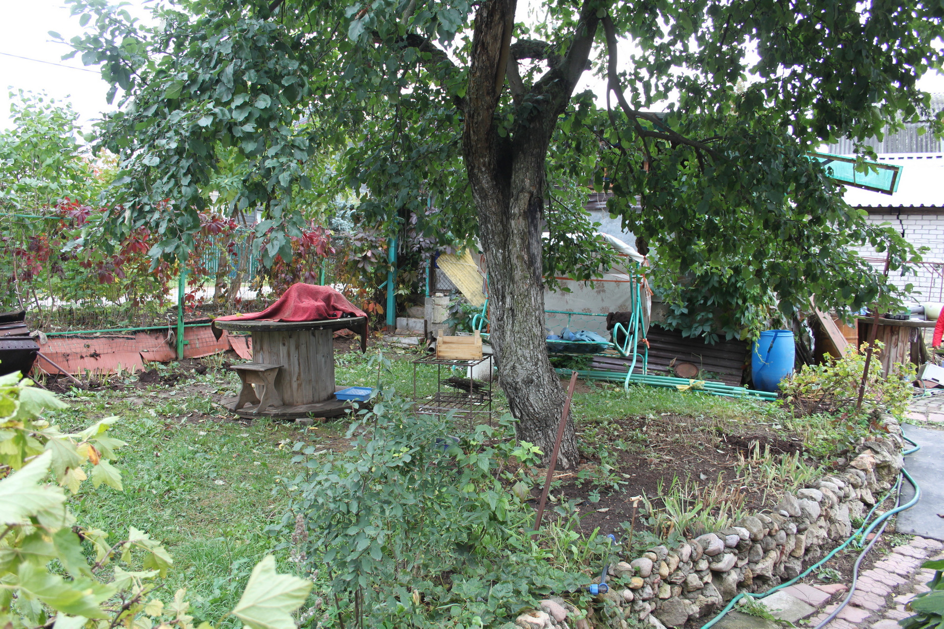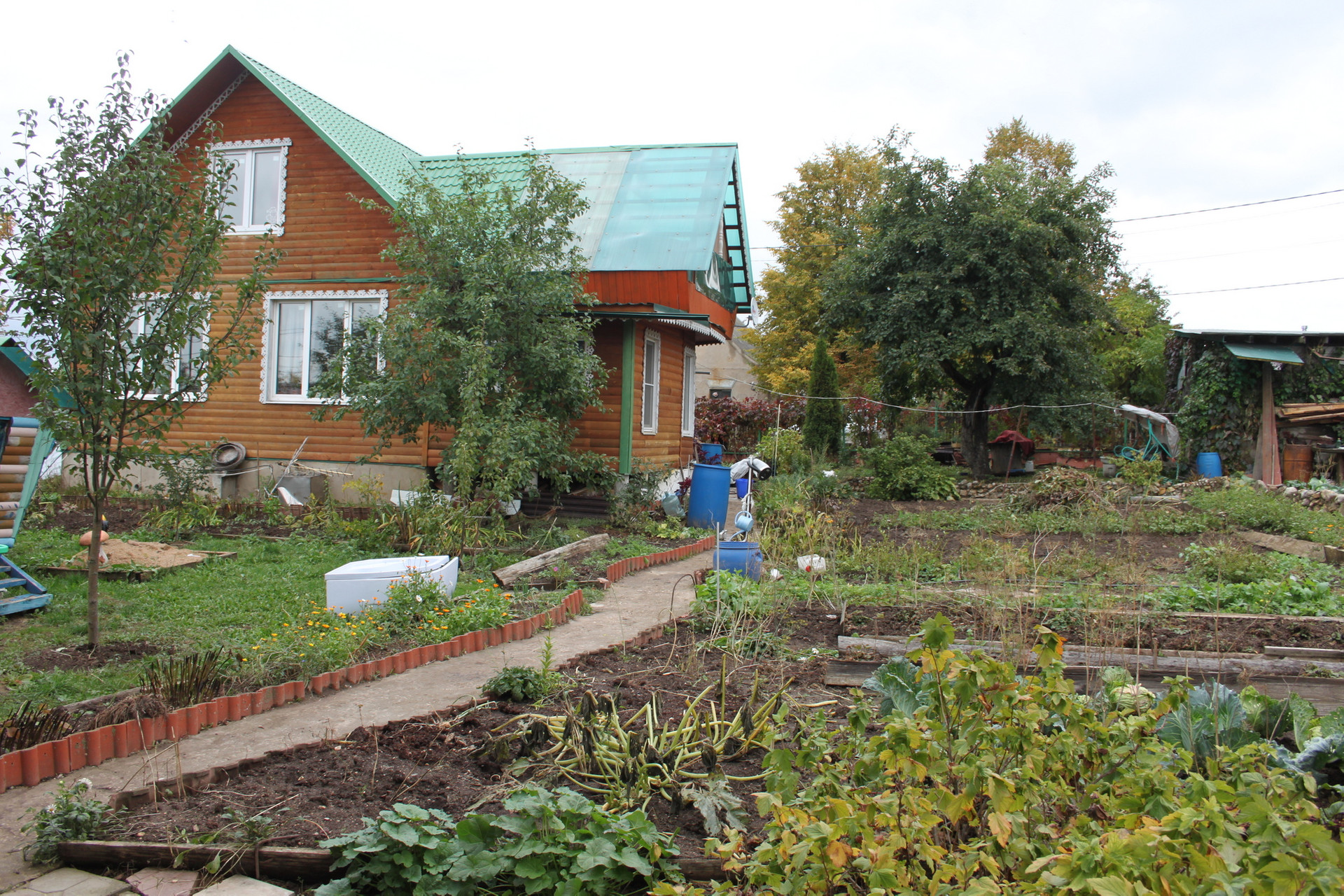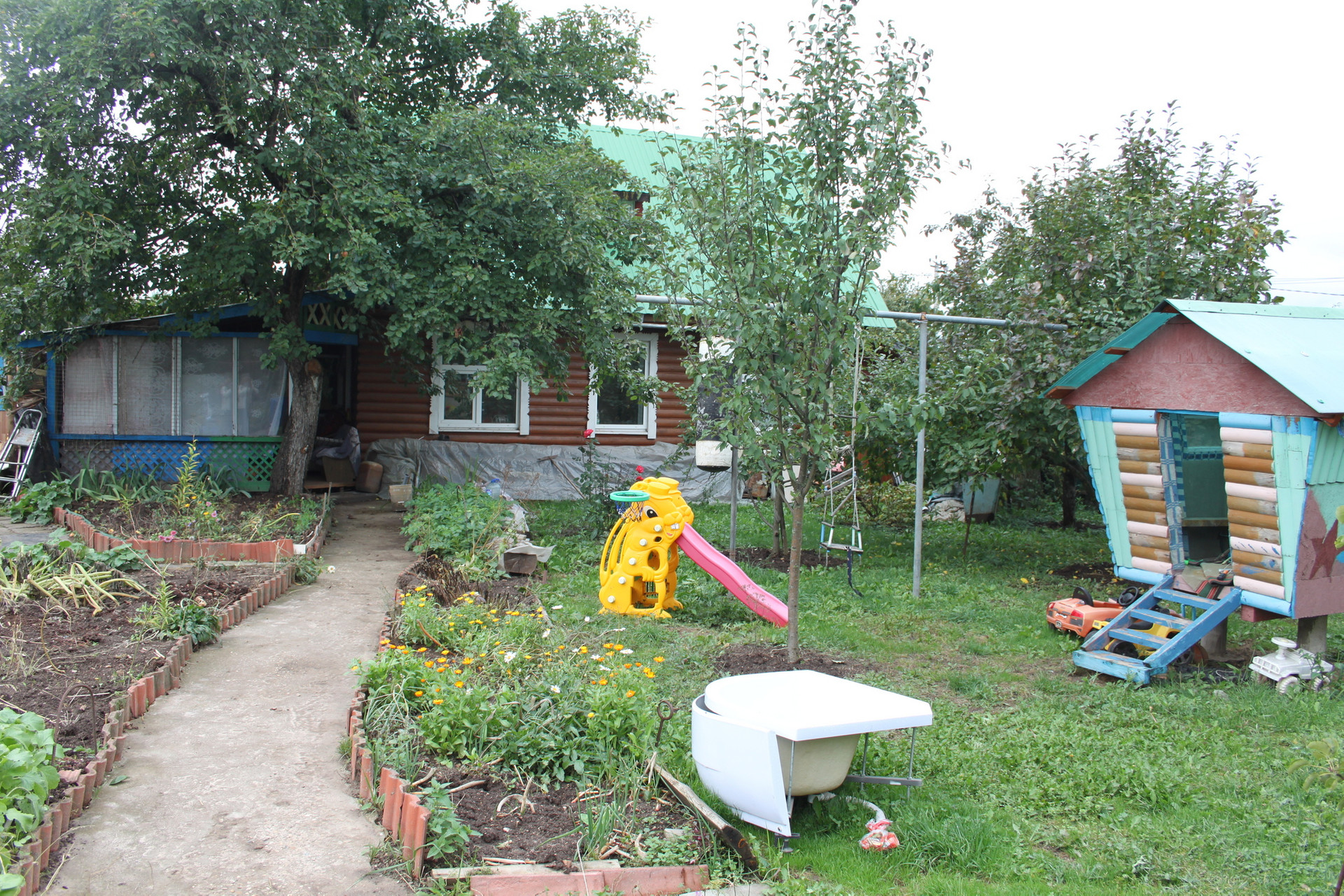 Участок – 12 соток ИЖС, благоустроен: яблоневый сад, клубничные грядки, малинник, огород, 2 теплицы, детская площадка.