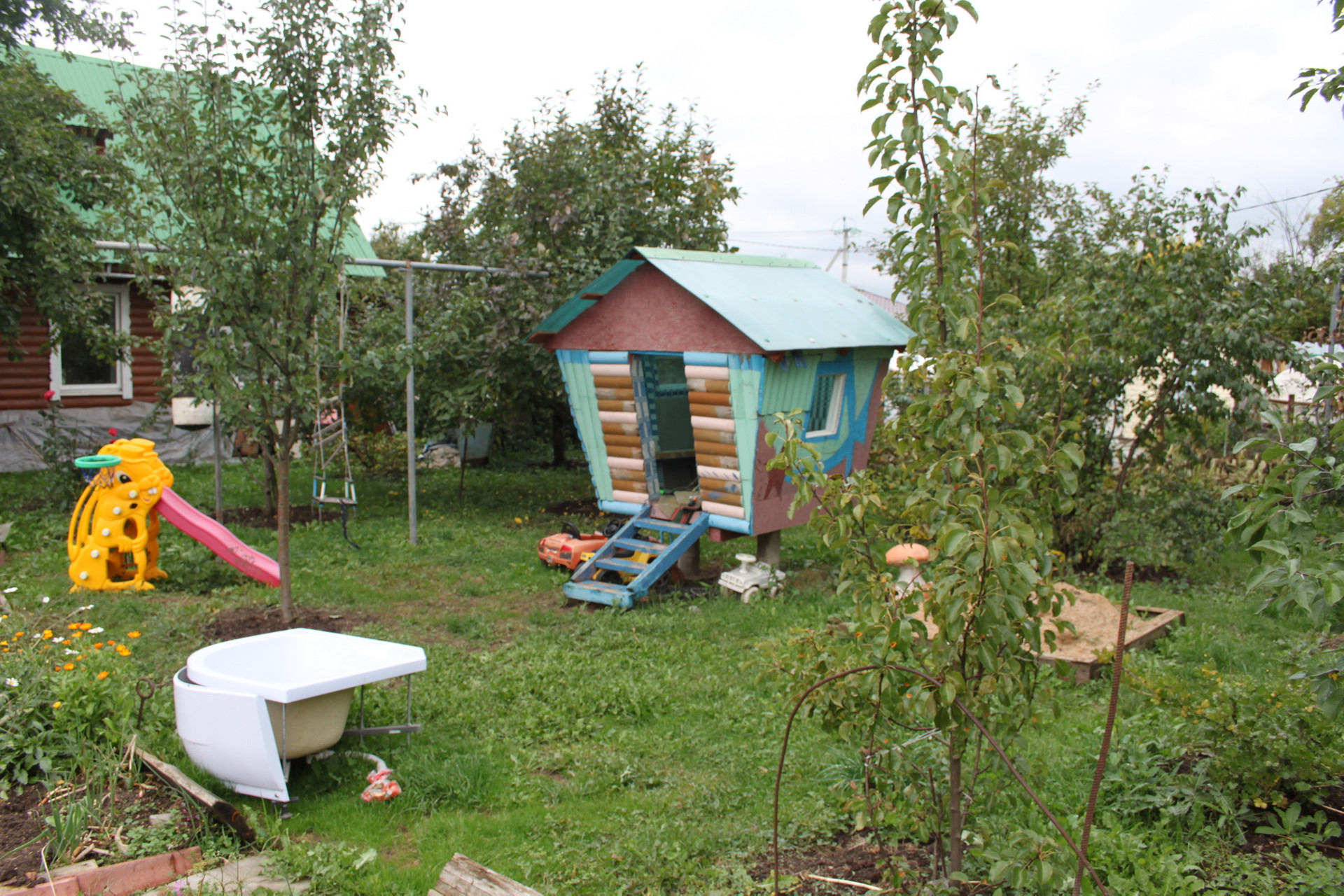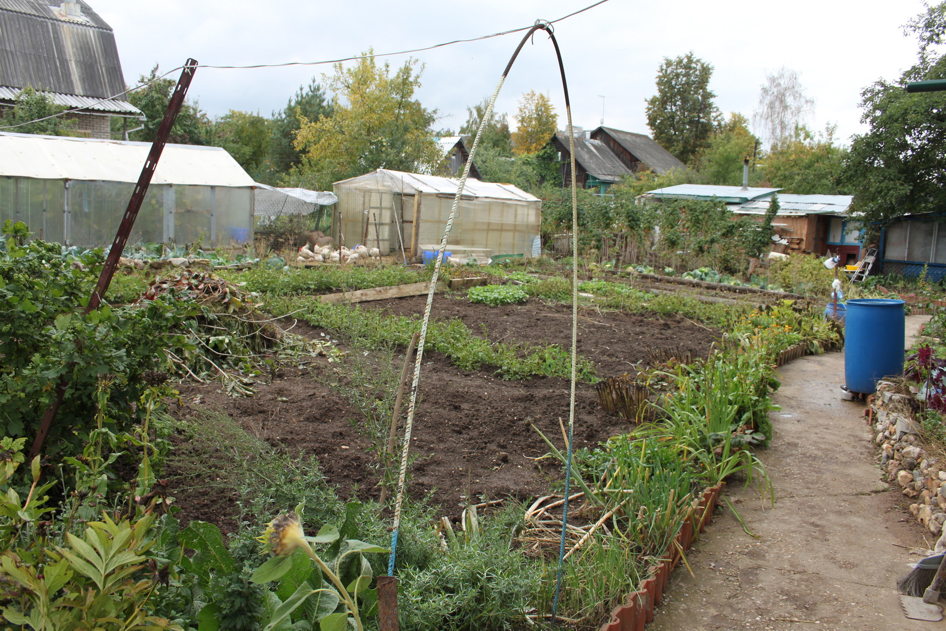 Постройки на участке: крытое основание под гараж, небольшая баня, хоз. блок для инвентаря, курятник.