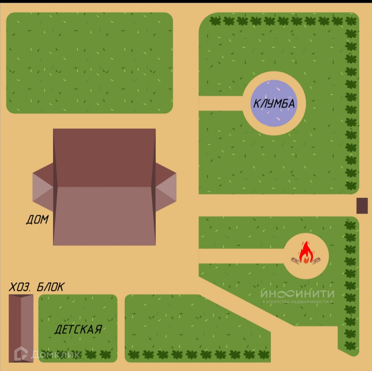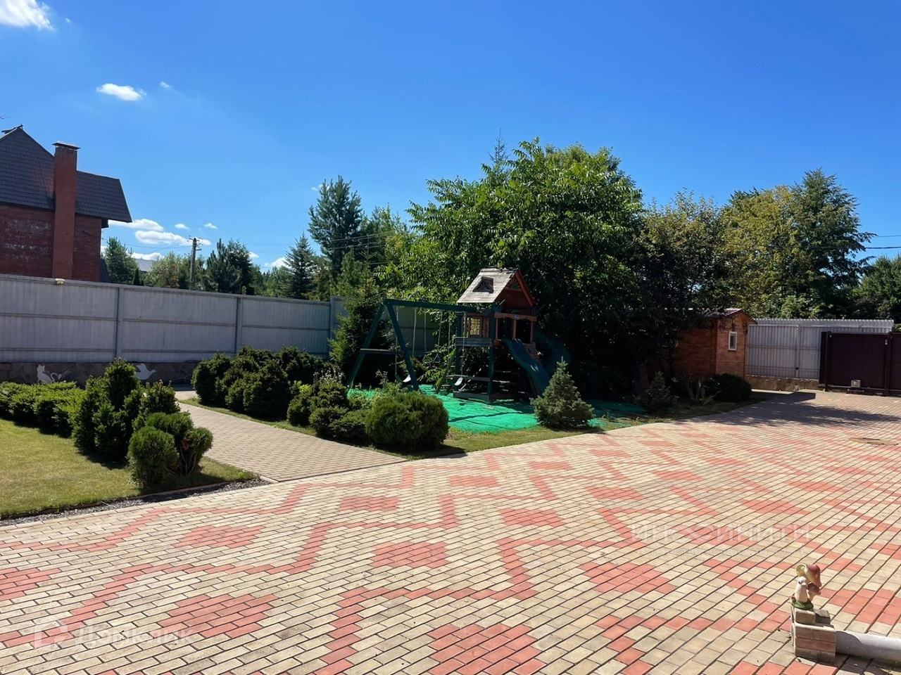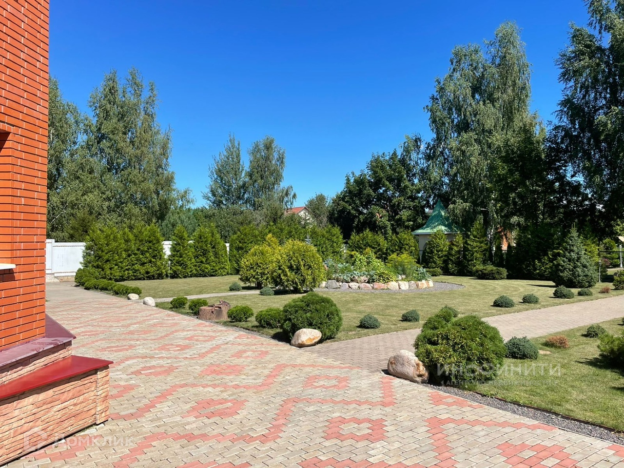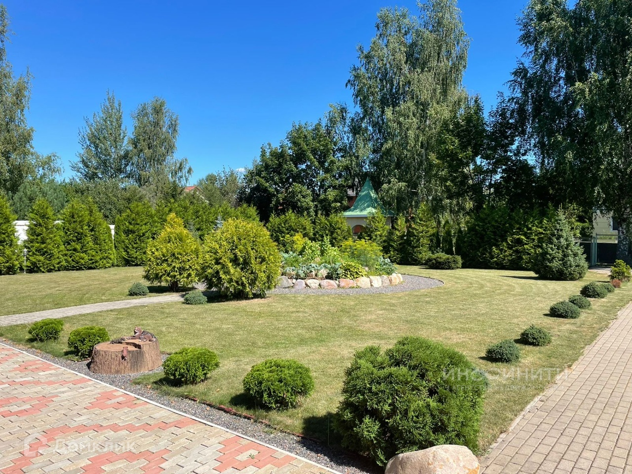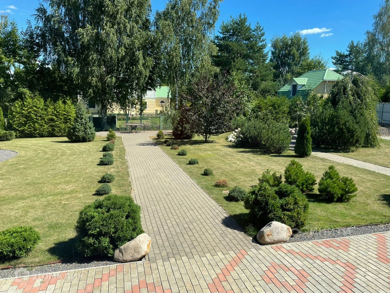 На участке выполнен ландшафтный дизайн, посажен английский газон, установлено декоративное освещение, розетки, проведена система полива, дорожки вымощены плиткой,