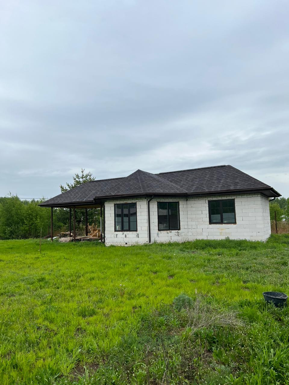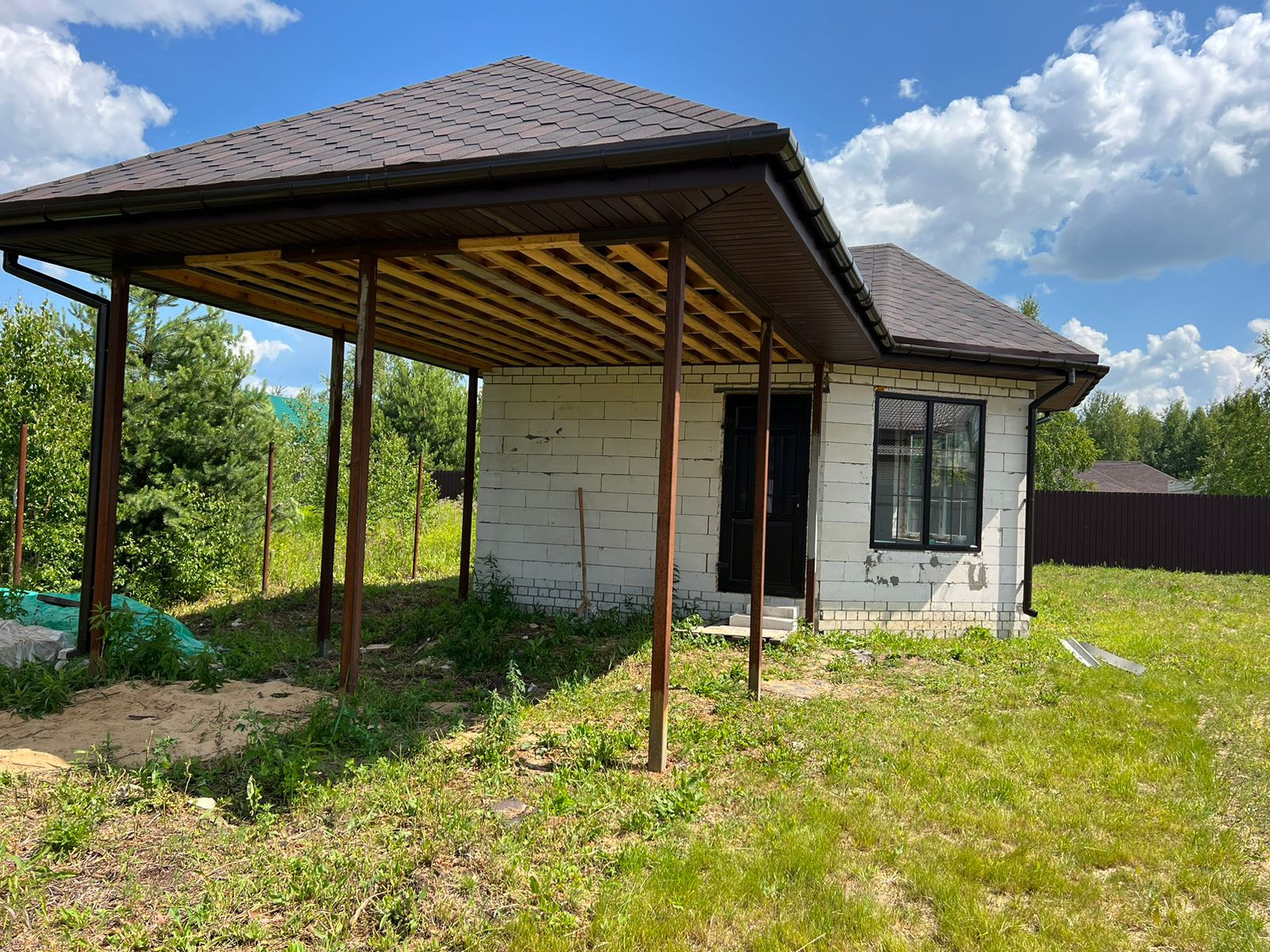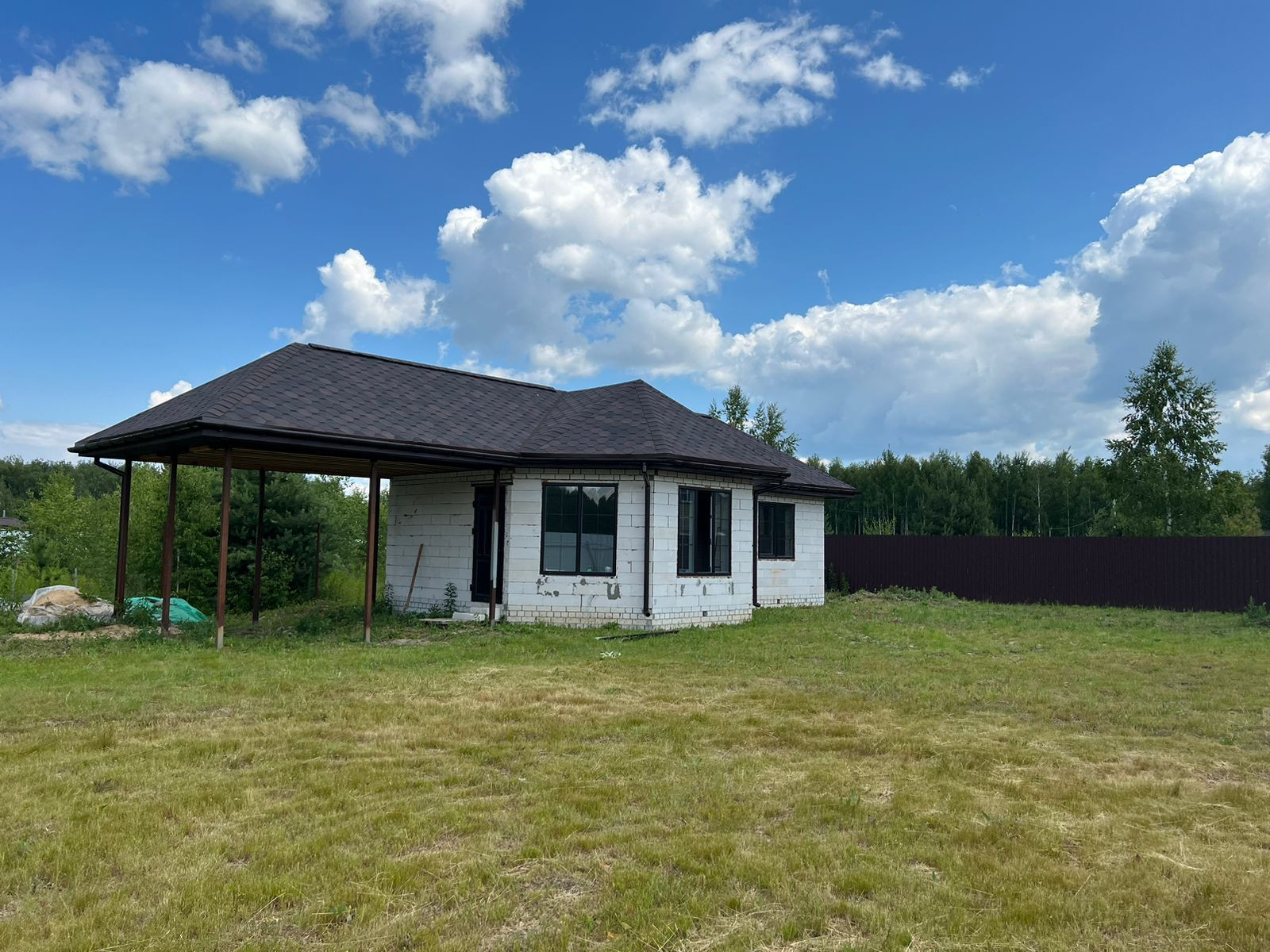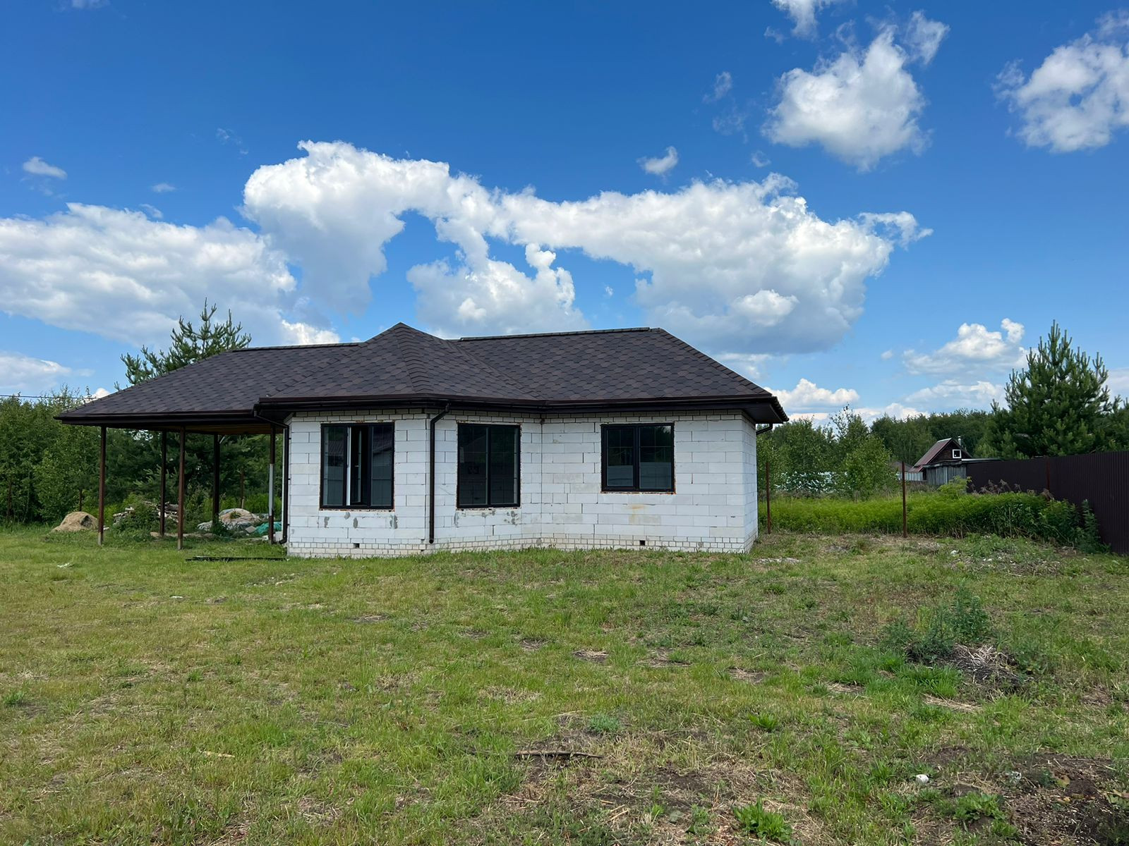 Дом одноэтажный из газосиликатных блоков на бетонном ленточном фундаменте, крыша из мягкой кровли, чердачные перекрытия дома и терассы деревянные, отеплённые. Дом без внутренней отделки, окна - пластиковые стеклопакеты, полы бетонные. В доме электричество, вода - скважина, канализация - септик. Магистральный газ проходит по границе участка.