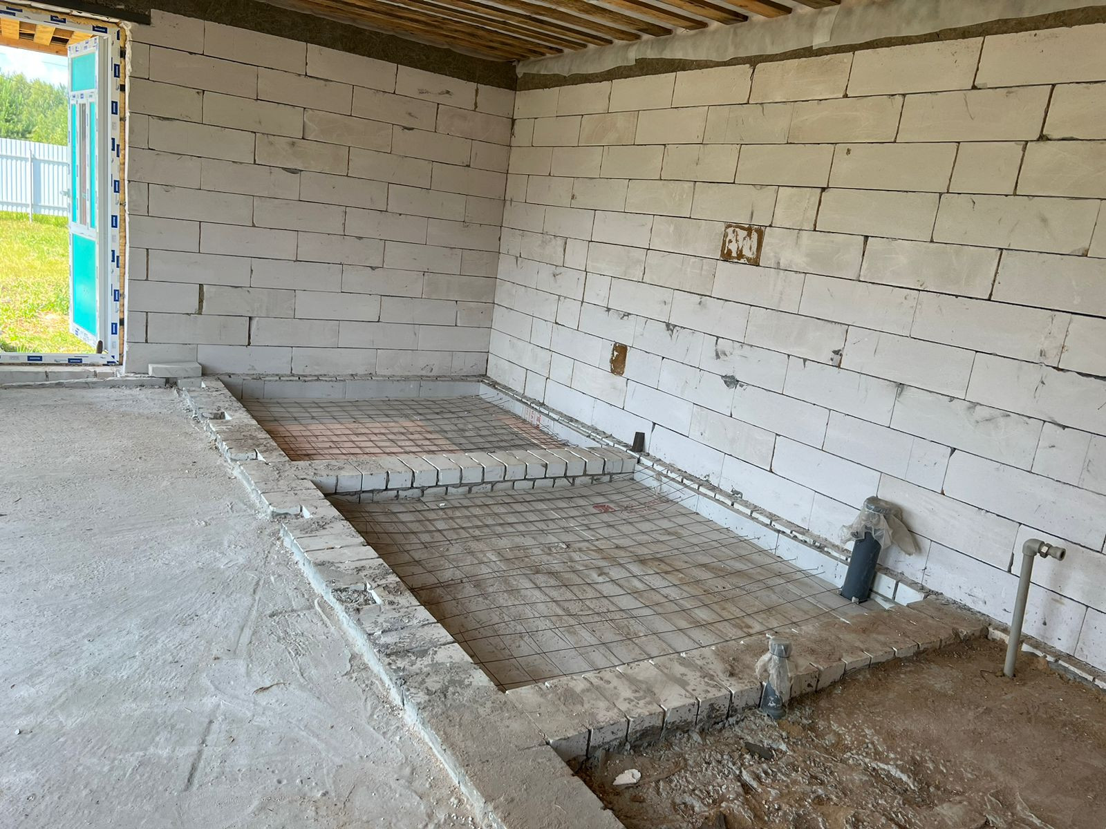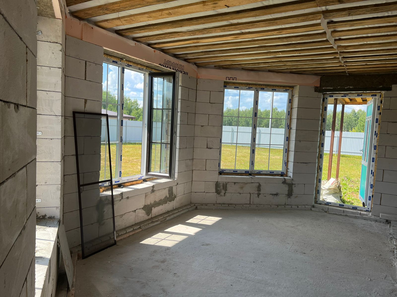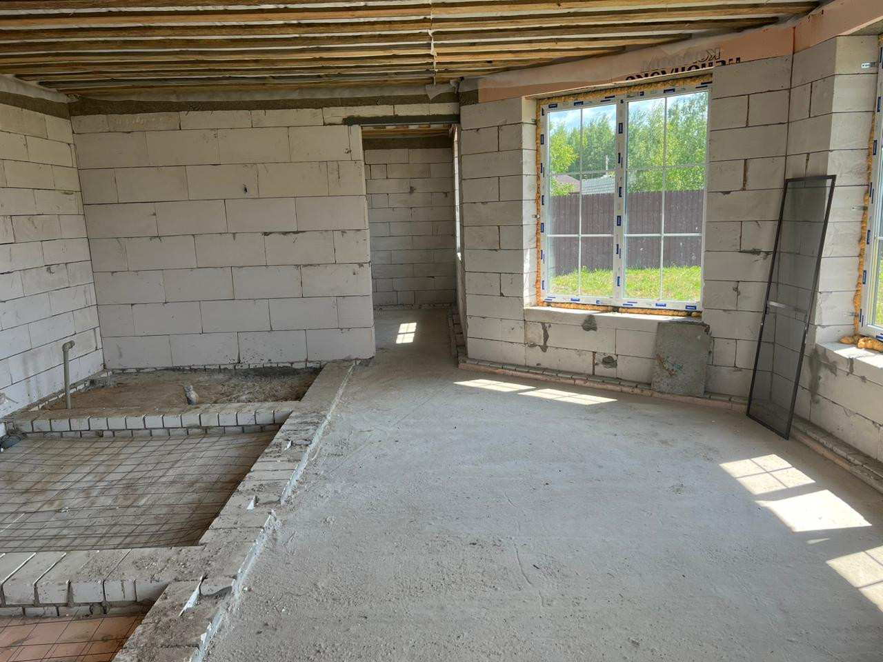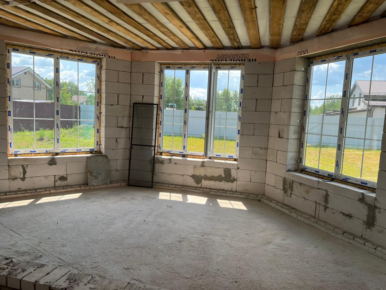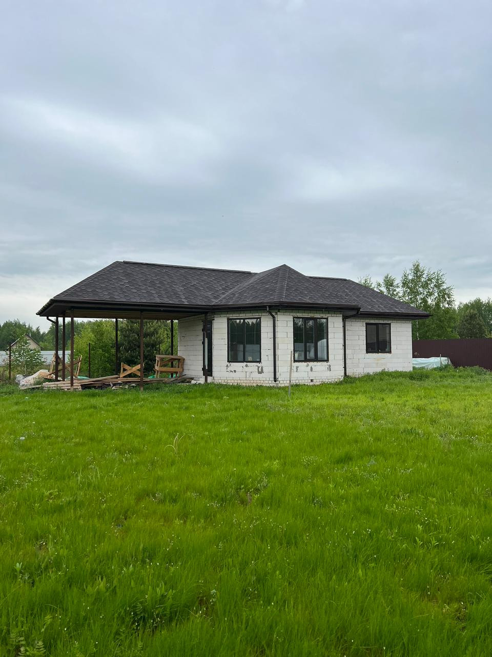Дом одноэтажный из газосиликатных блоков на бетонном ленточном фундаменте, крыша из мягкой кровли, чердачные перекрытия дома и терассы деревянные, отеплённые. Дом без внутренней отделки, окна - пластиковые стеклопакеты, полы бетонные. В доме электричество, вода - скважина, канализация - септик. Магистральный газ проходит по границе участка.