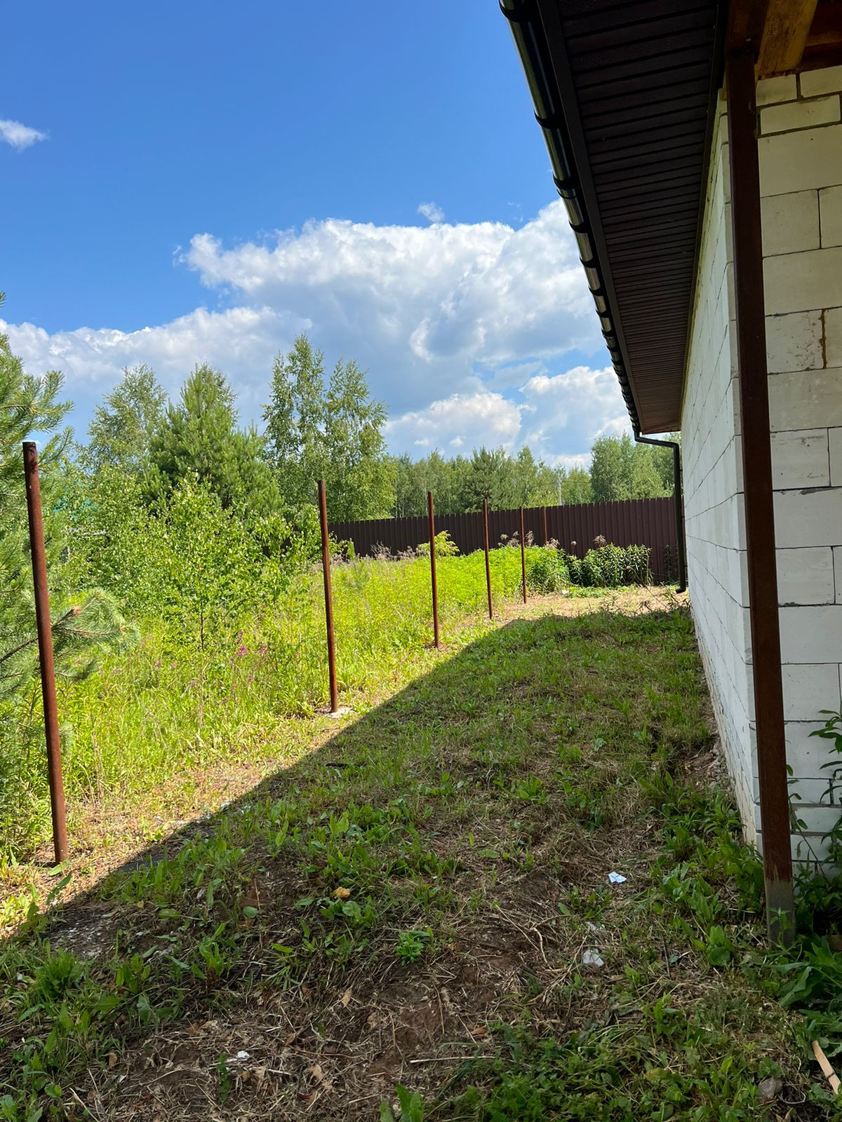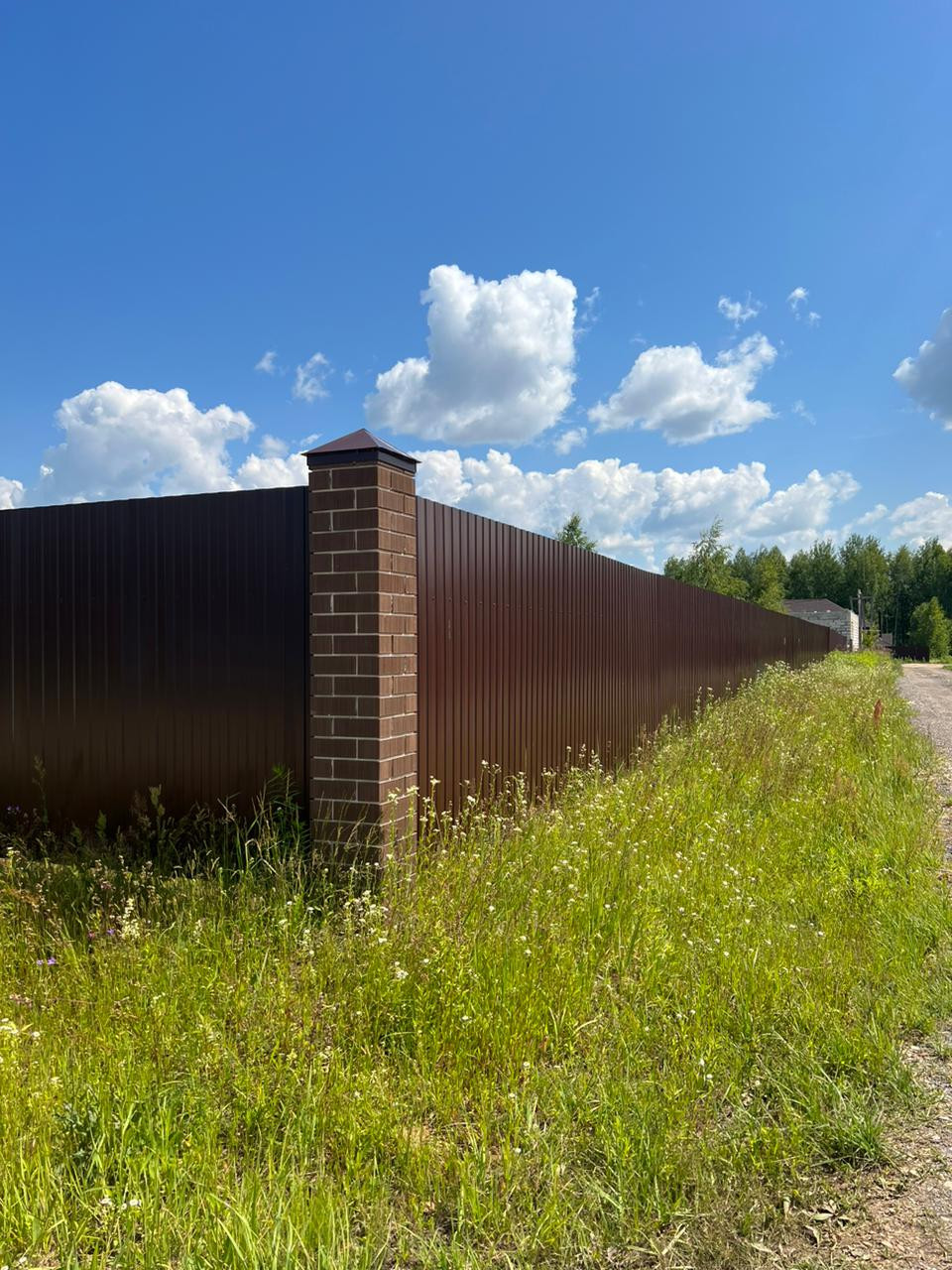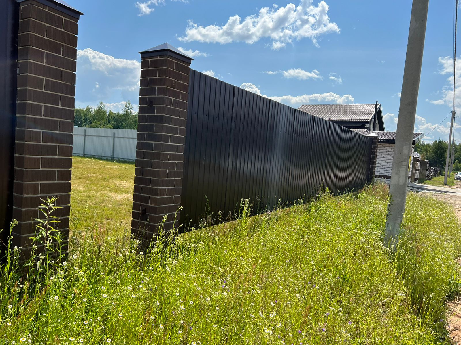 Участок огорожен металлическим забором с кирпичными столбами.