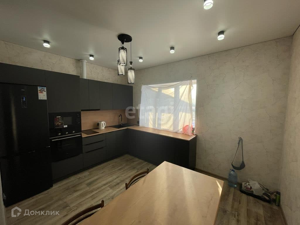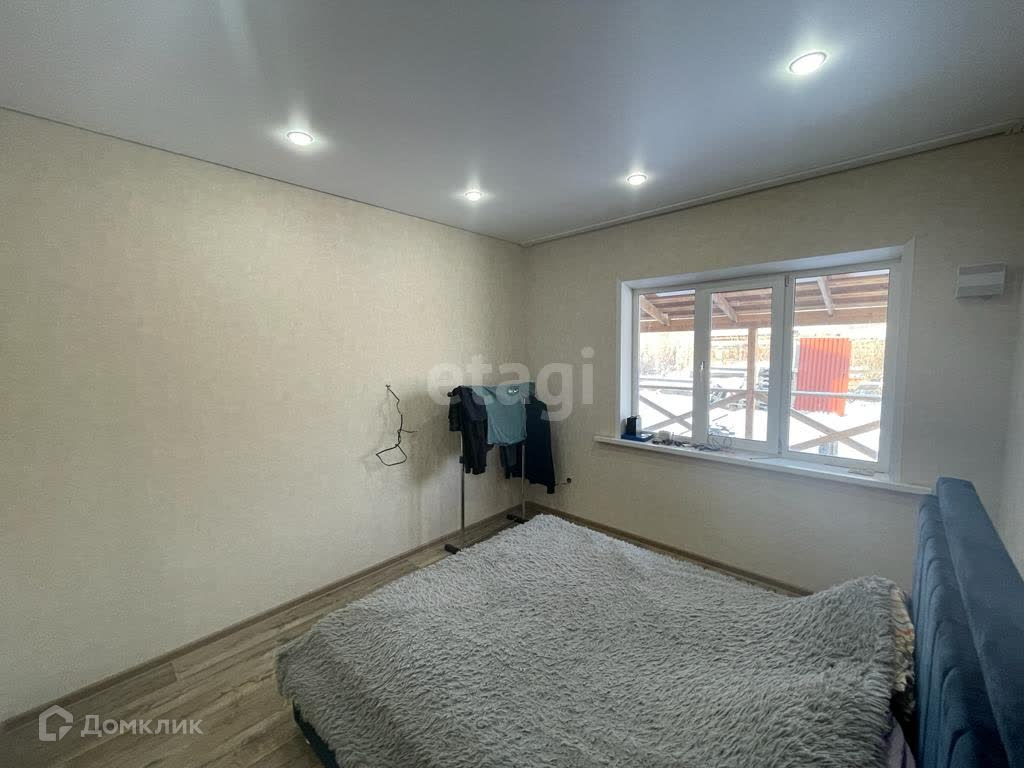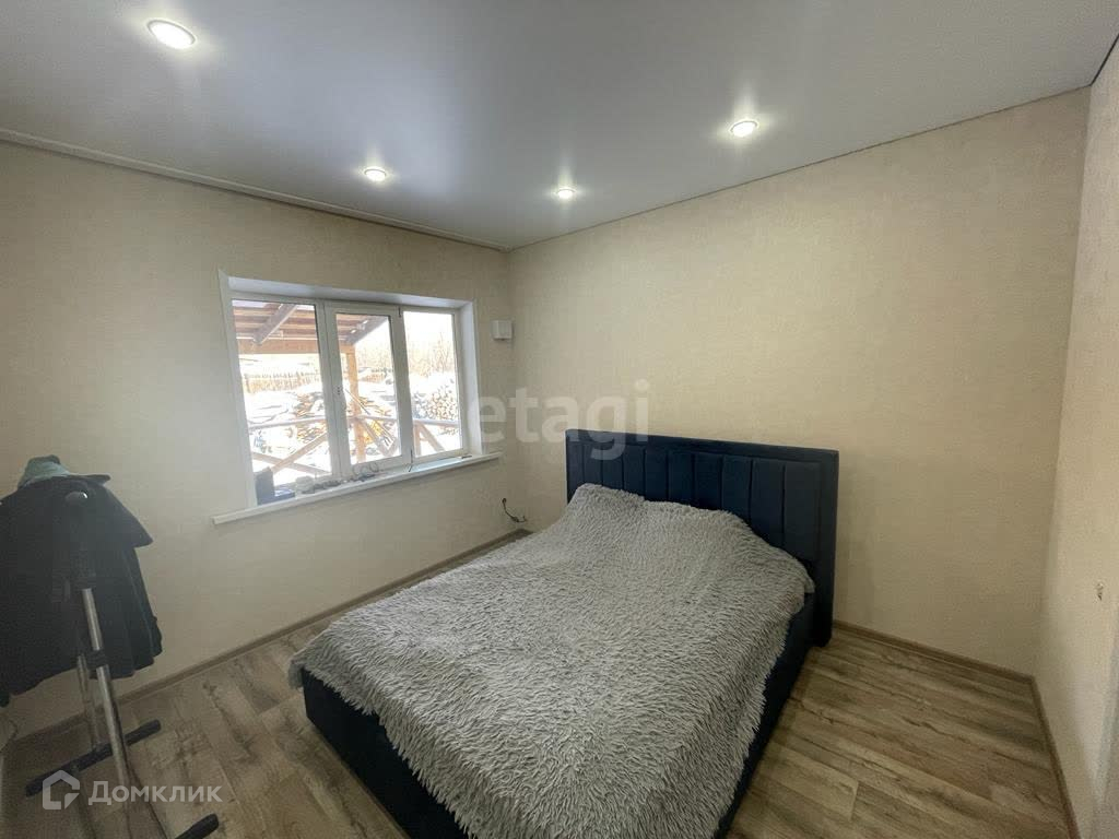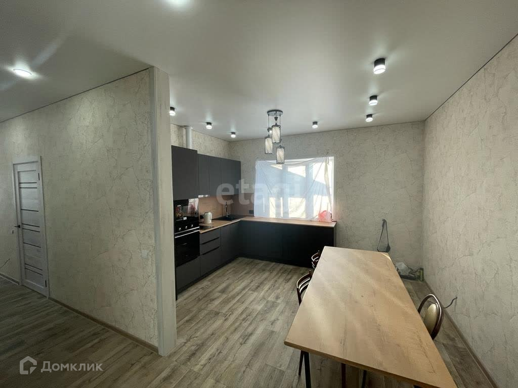 Дом площадью 100 м2, из них 95 м2-жилых. Планировка в доме удобная: кухня-гостиная и две спальни, совмещенный санузел, крытая терраса. В доме установлены натяжные потолки, пол устелен линолеумом. Фундамент: утепленная монолитная плита. крыша утеплена опилками. Отопление: электрическое. Во всем доме теплые полы. В гостиной французское окно.