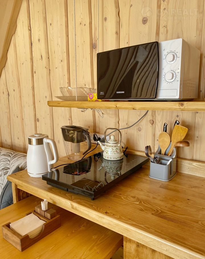 • Современная бытовая техника (индукционная плита, микроволновая печь, духовой мини-шкаф, холодильник, стиральная машинка)