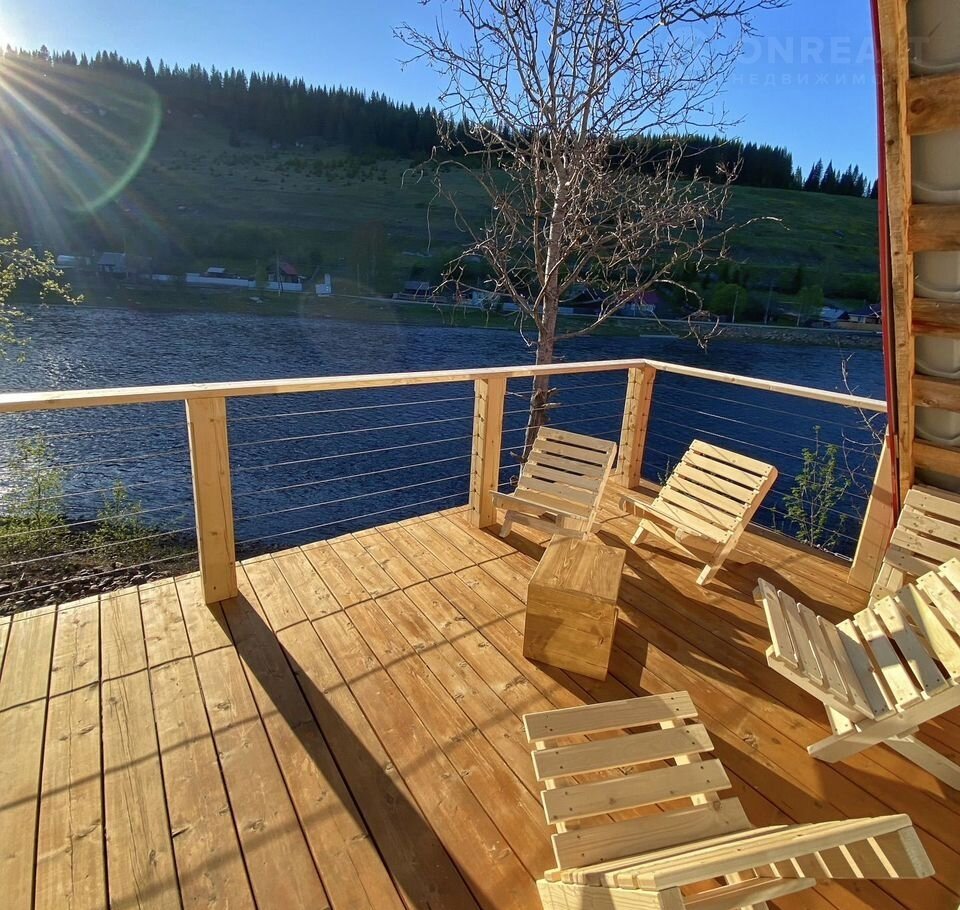 На втором этаже: зона отдыха совмещенная с кухней, спальные места и большая терраса с шикарным видом на реку и скалы. Всего 3 спальных места (2 двуспальные кровати и двуспальный раскладной диван).