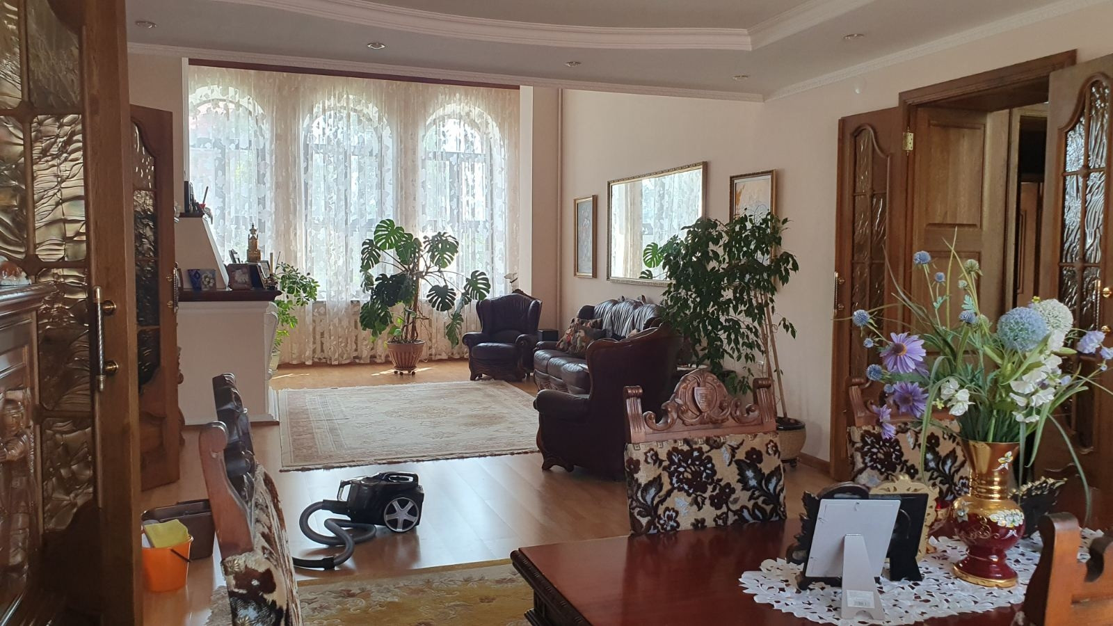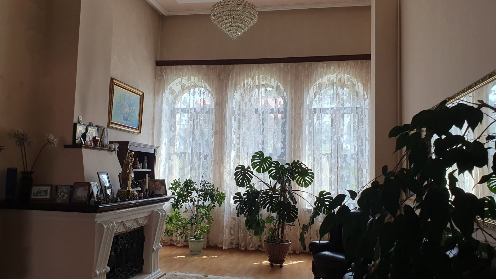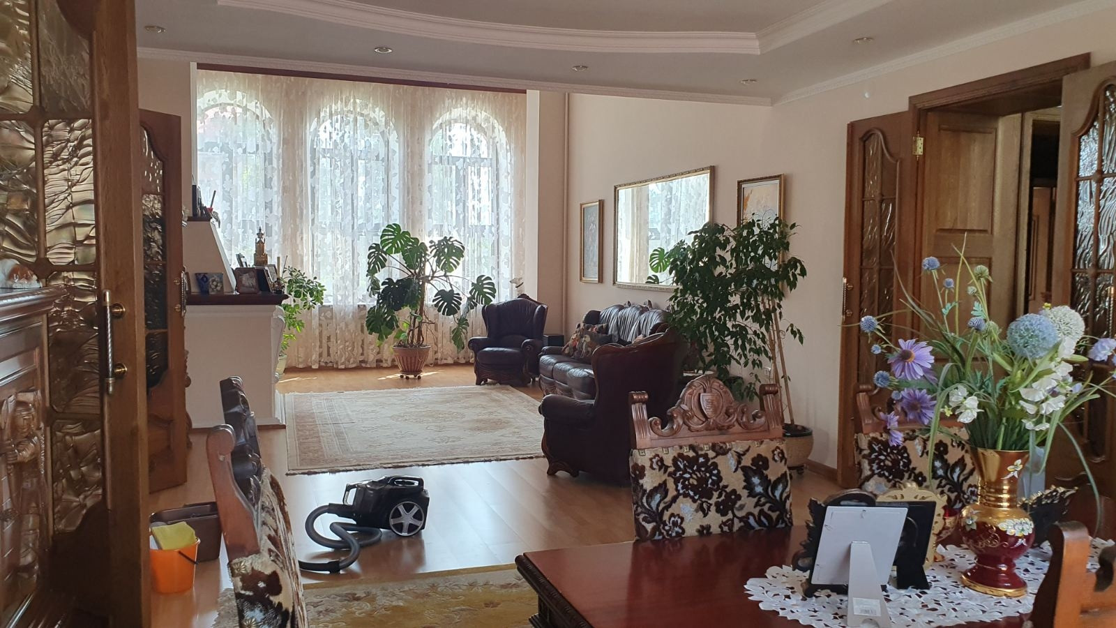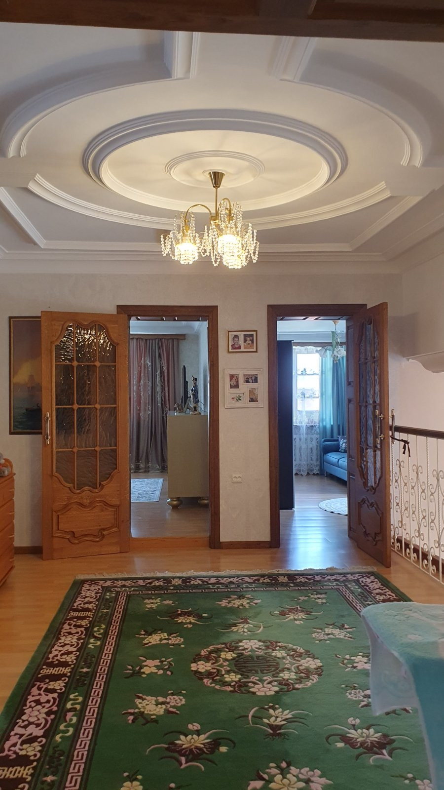 Во всем доме потолки разномерные, люстра в зале опускается автоматически, для удобства замены лампочек и влажной уборки, в бане и беседке установлены люстры-вентиляторы, все коммуникации центральные.