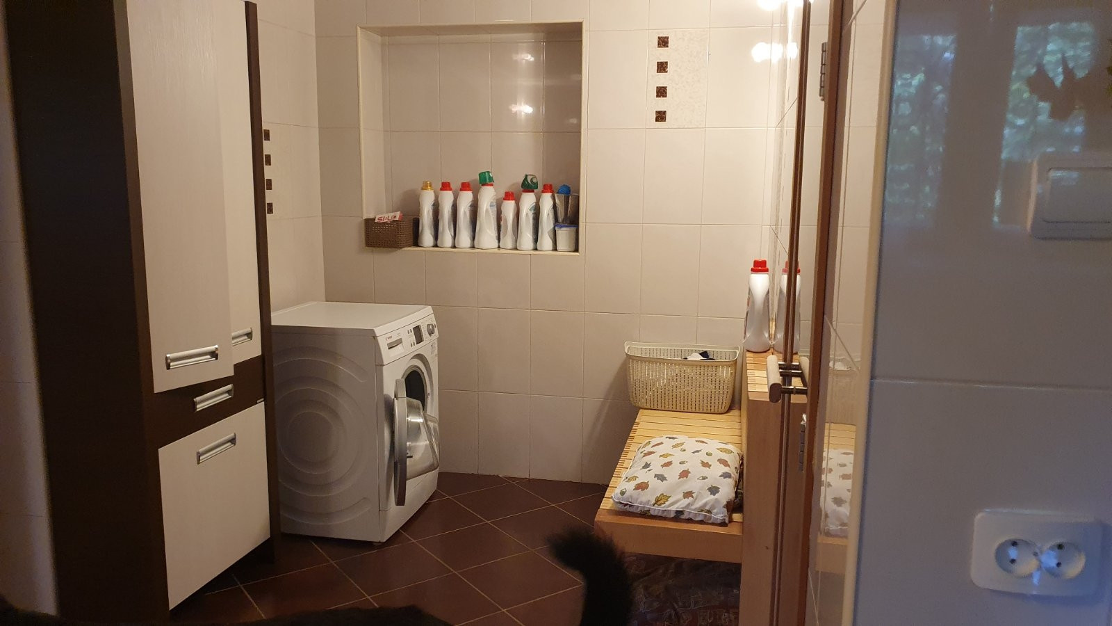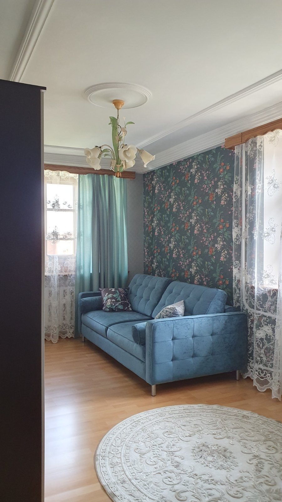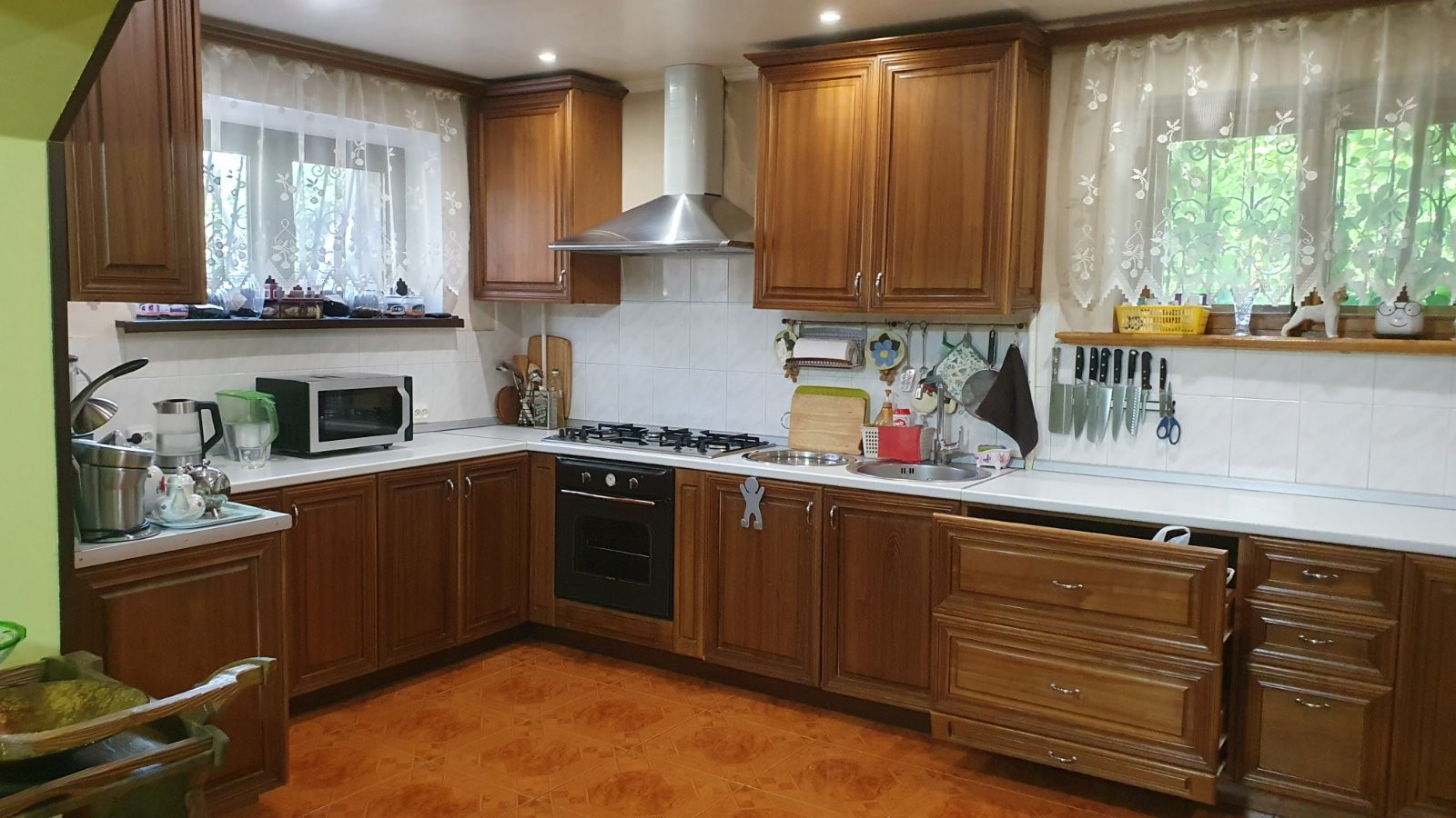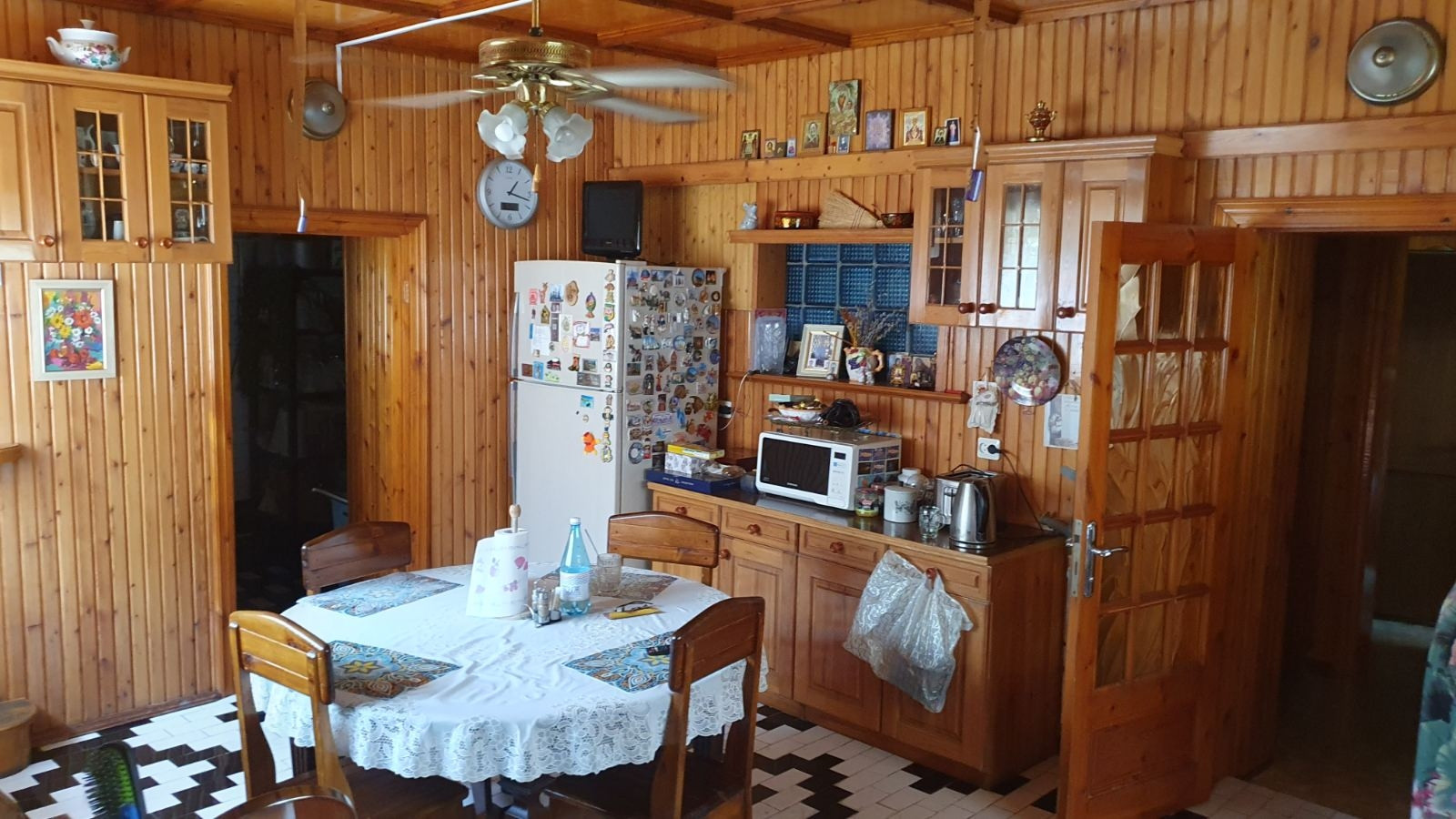 Во всем доме потолки разномерные, люстра в зале опускается автоматически, для удобства замены лампочек и влажной уборки, в бане и беседке установлены люстры-вентиляторы, все коммуникации центральные.