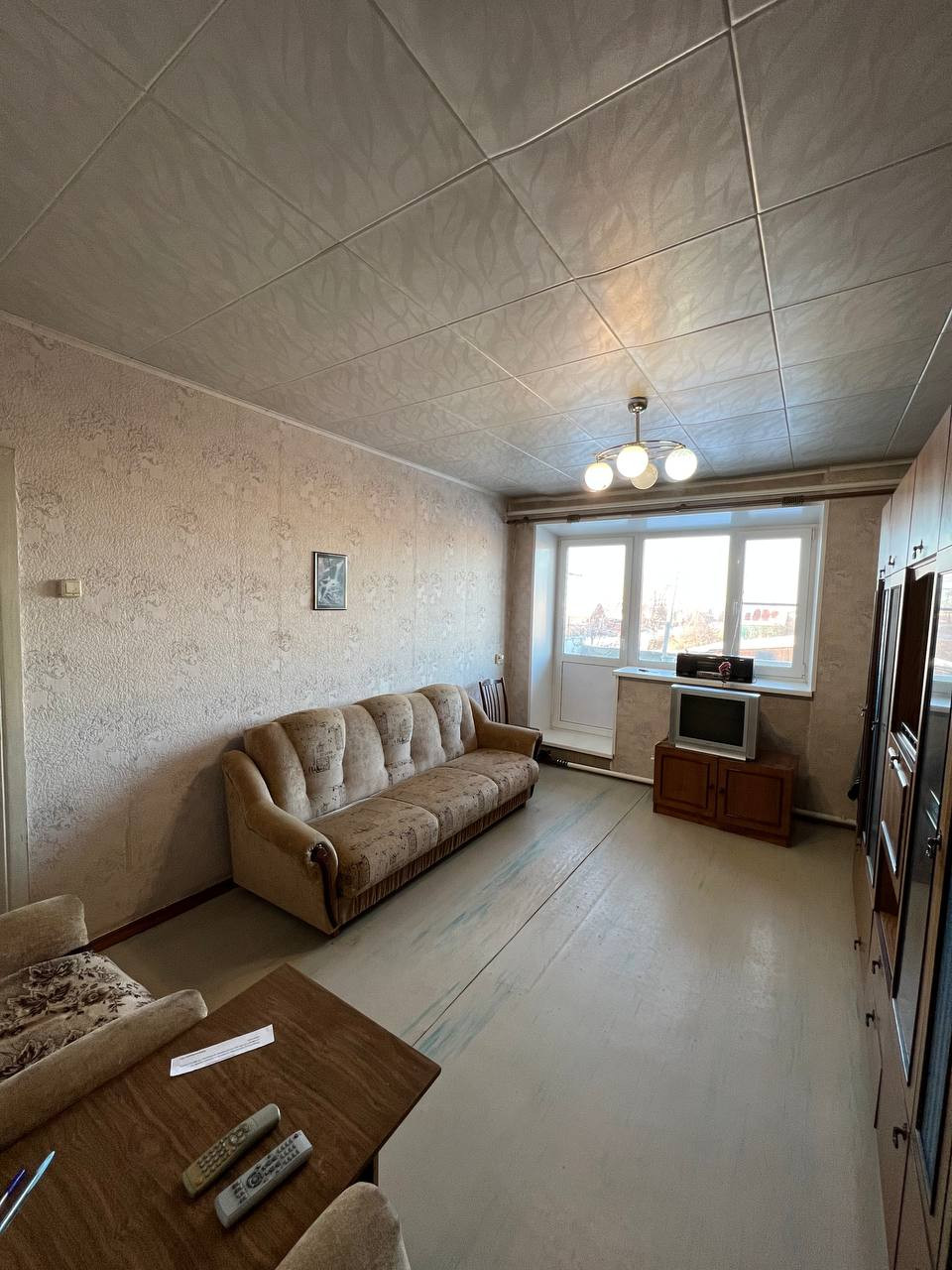 В большой комнате 17кв.м. - очень просторно, мягкая мебель - диван, 2 кресла, столик, шкаф, тумба с телевизором и еще много места.
