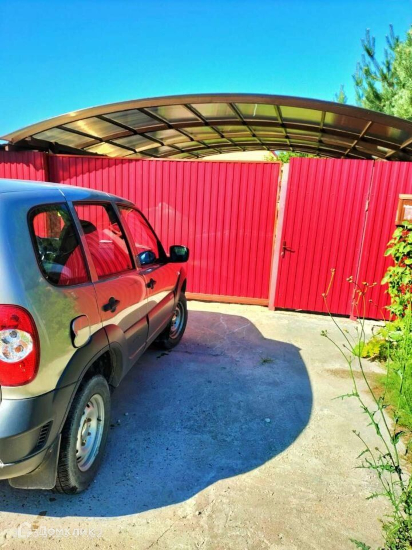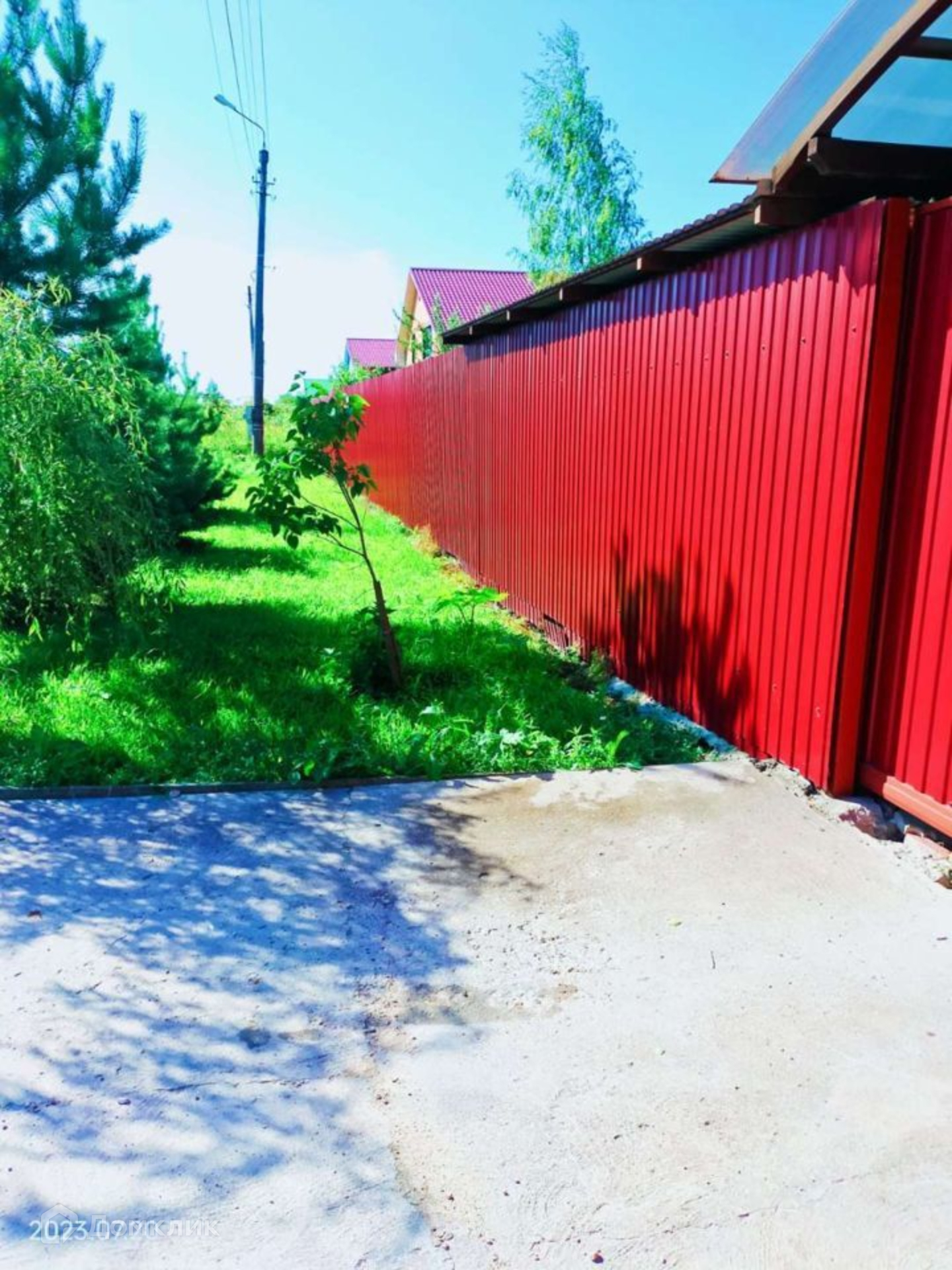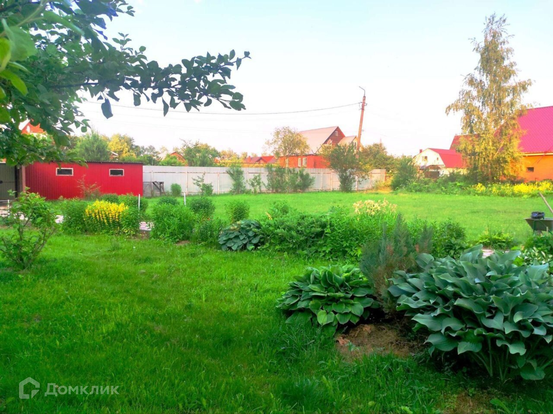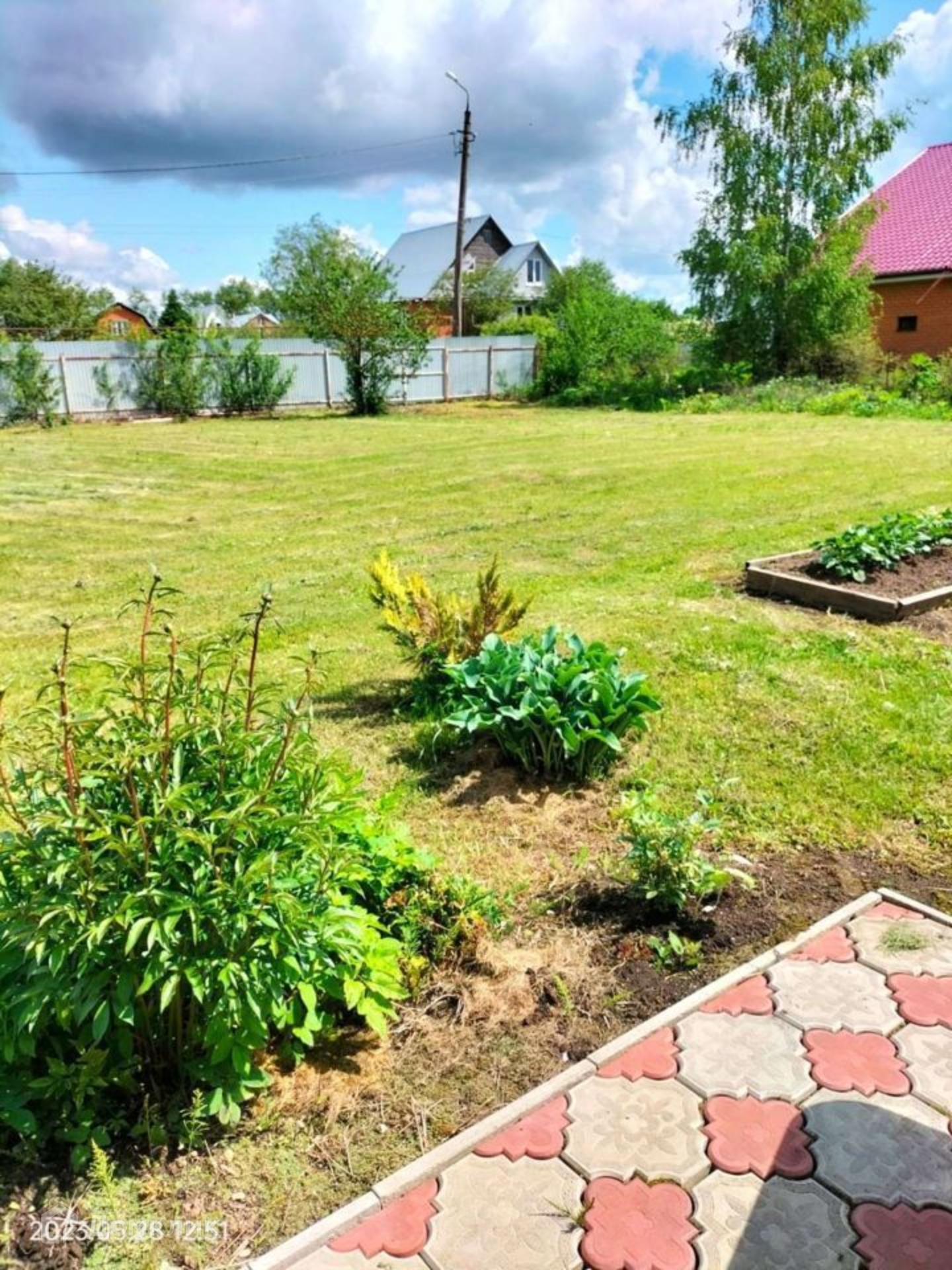 Участок ровный, ухоженный правильной формы, с двух сторон забор из профлиста, от соседей сетка рабица. Есть въездные ворота, оборудована крытая стоянка для машины. На участке оборудованы плиточные дорожки, посажены цветы, плодовые деревья, есть теплица и грядки.