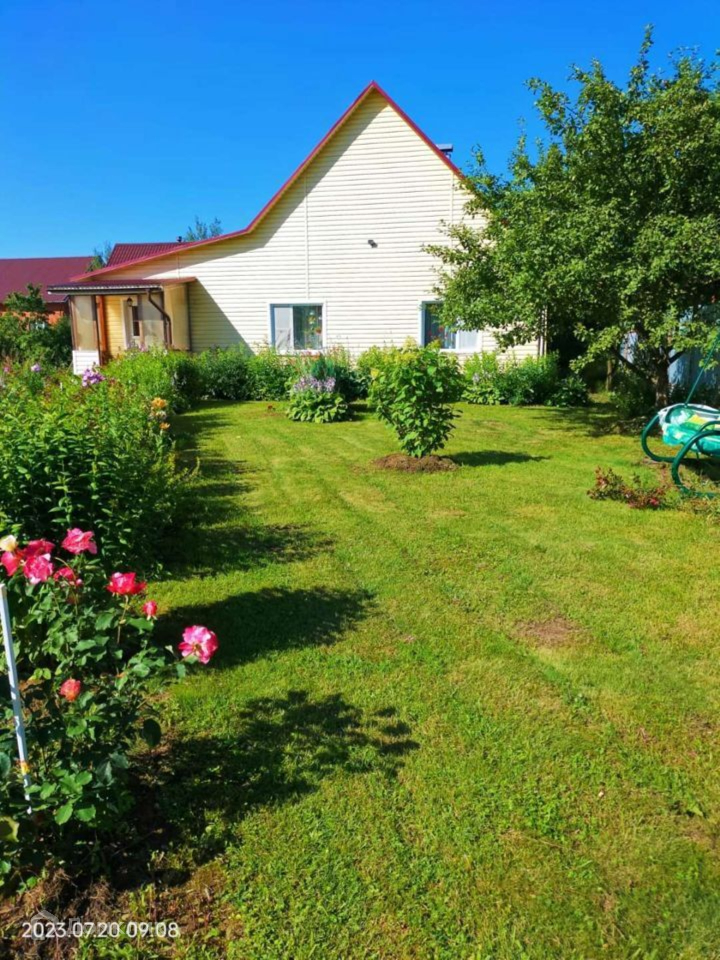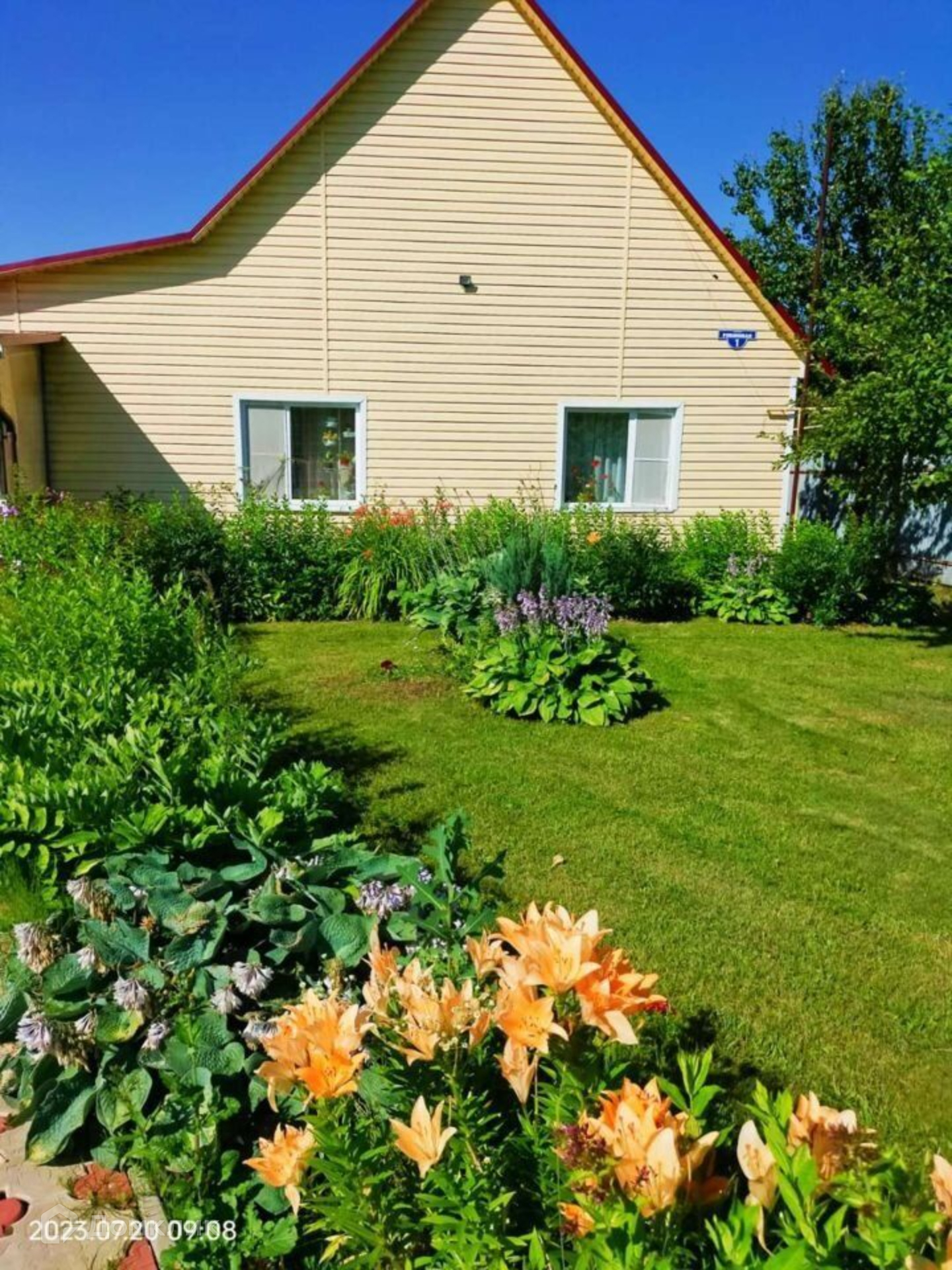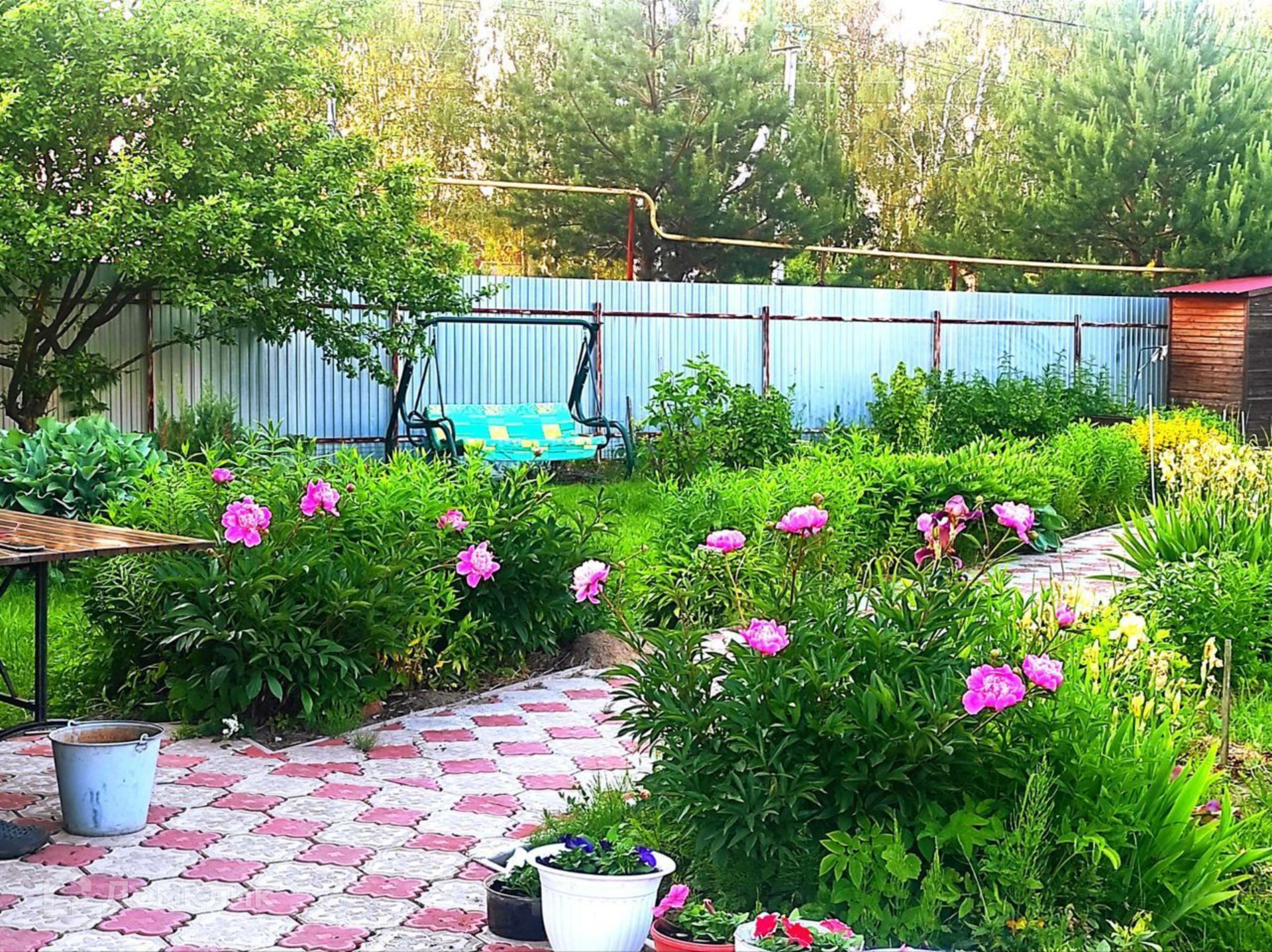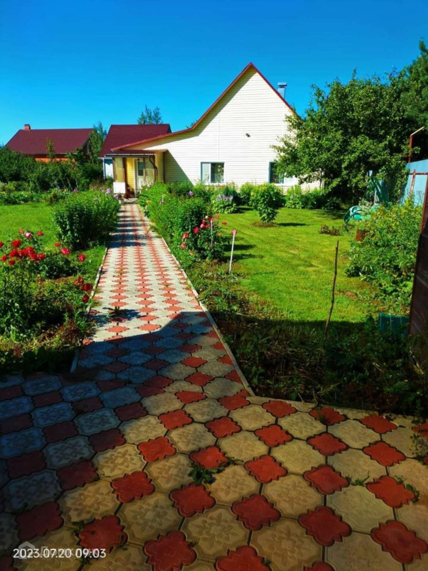Участок ровный, ухоженный правильной формы, с двух сторон забор из профлиста, от соседей сетка рабица. Есть въездные ворота, оборудована крытая стоянка для машины. На участке оборудованы плиточные дорожки, посажены цветы, плодовые деревья, есть теплица и грядки.