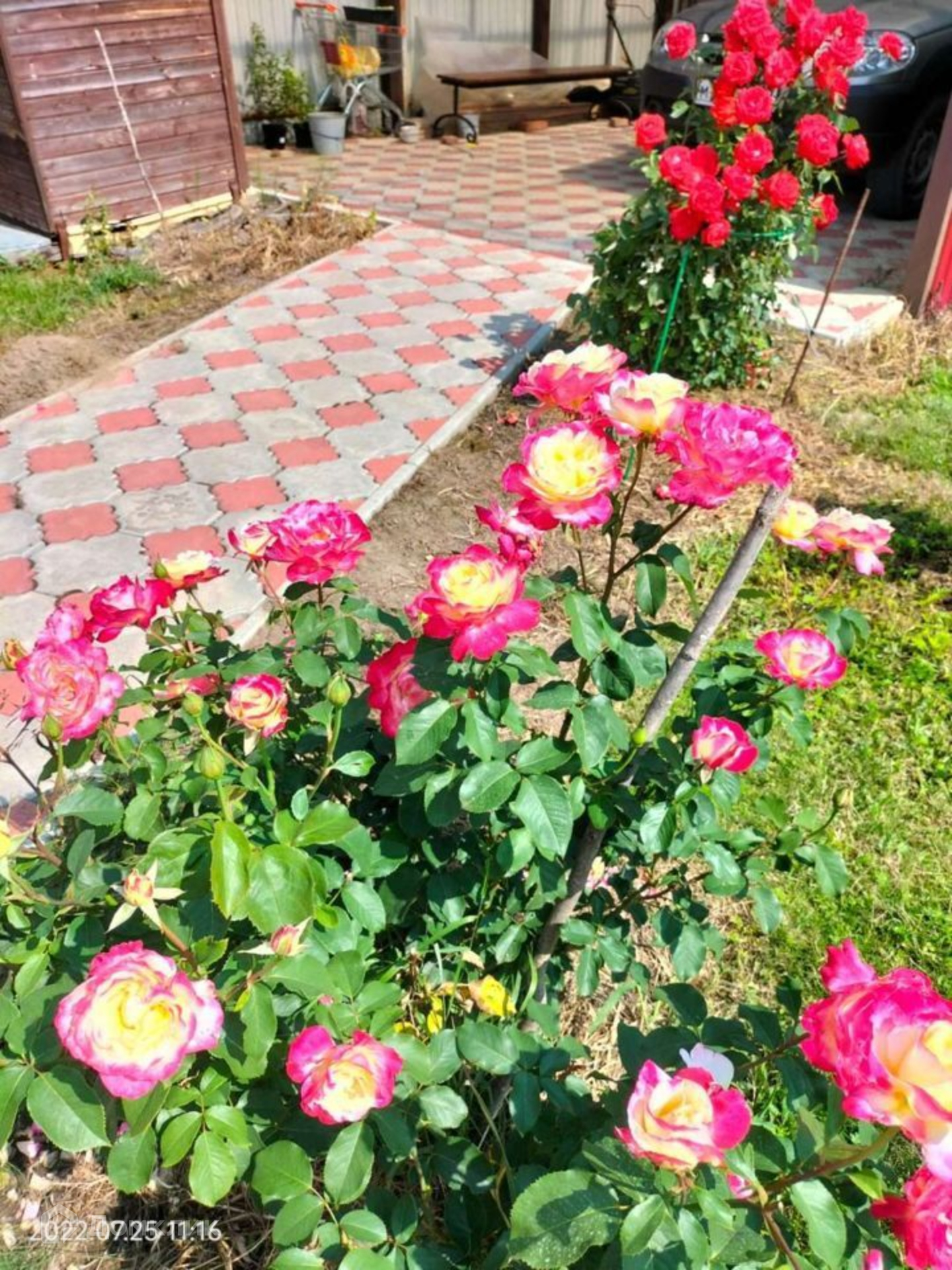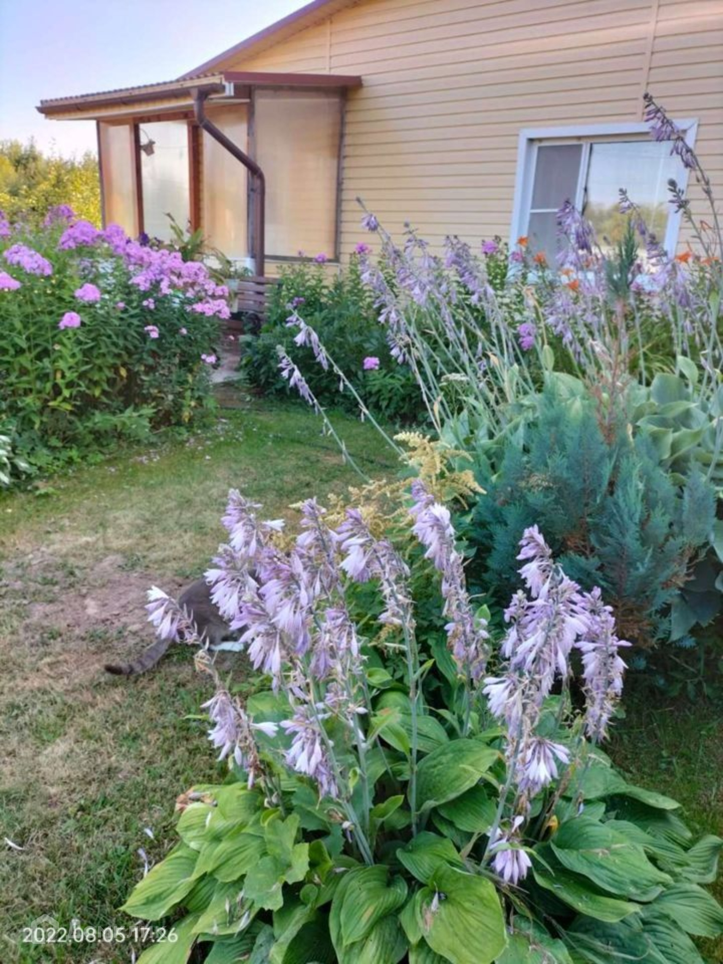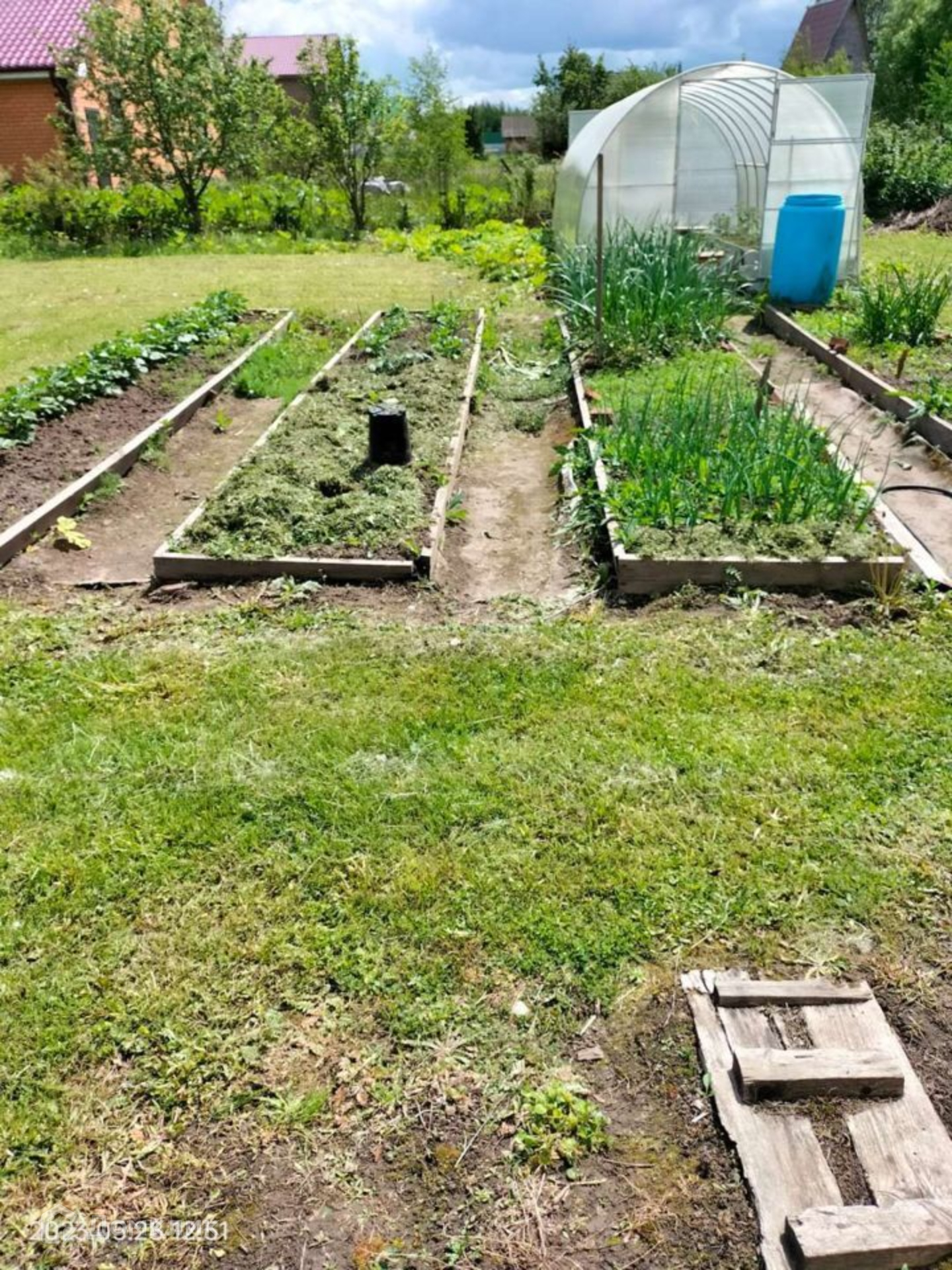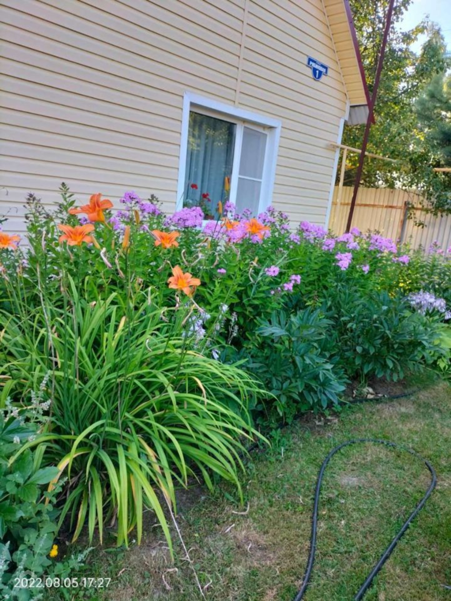 Участок ровный, ухоженный правильной формы, с двух сторон забор из профлиста, от соседей сетка рабица. Есть въездные ворота, оборудована крытая стоянка для машины. На участке оборудованы плиточные дорожки, посажены цветы, плодовые деревья, есть теплица и грядки.