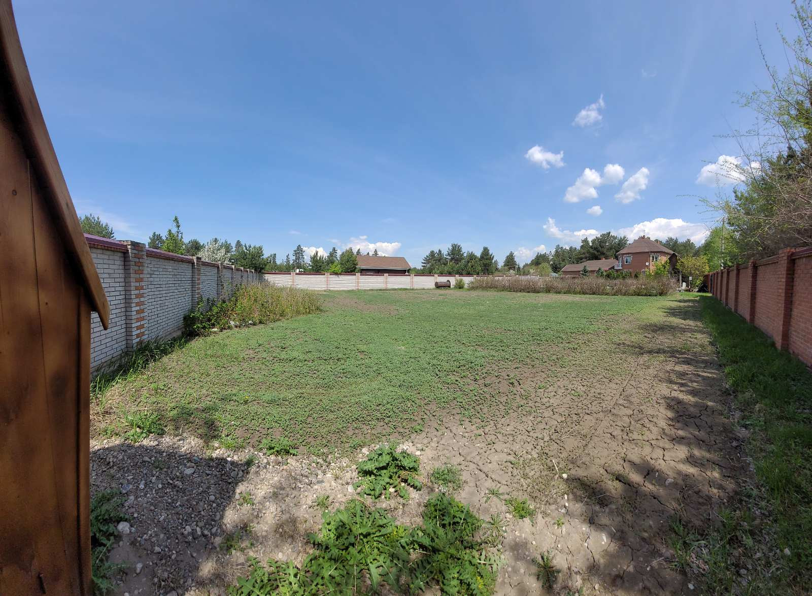 Участок огорожен кирпичным забором, ворота кованные металлические.