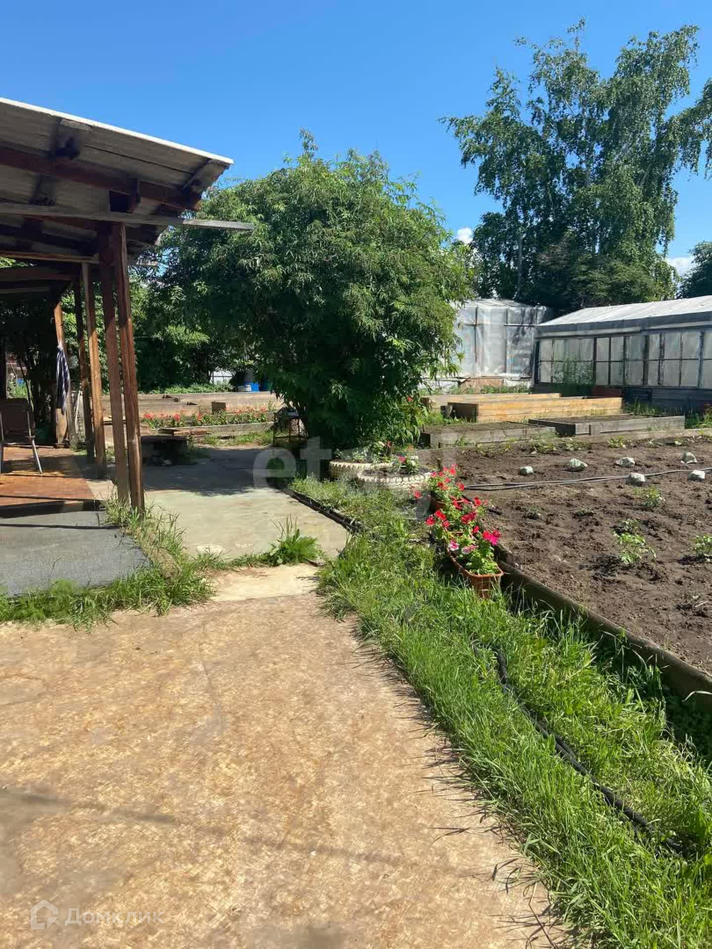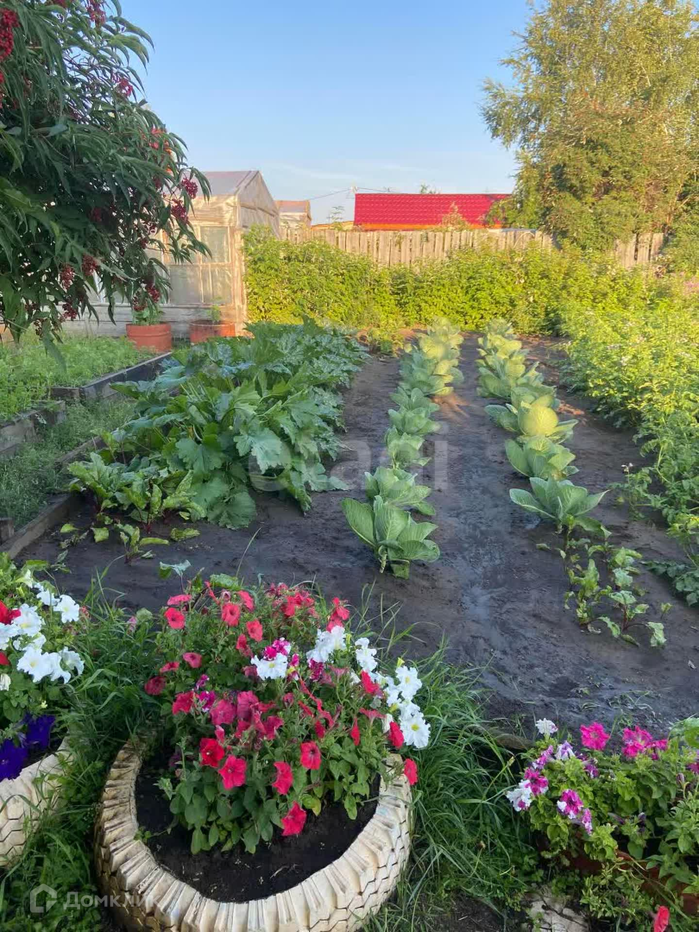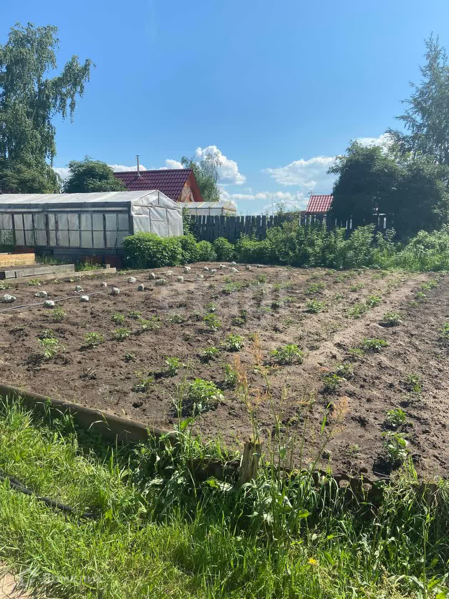 На участке имеется маленький домик, летняя кухня, две теплицы, 11 грядок, курятник, бытовые постройки.