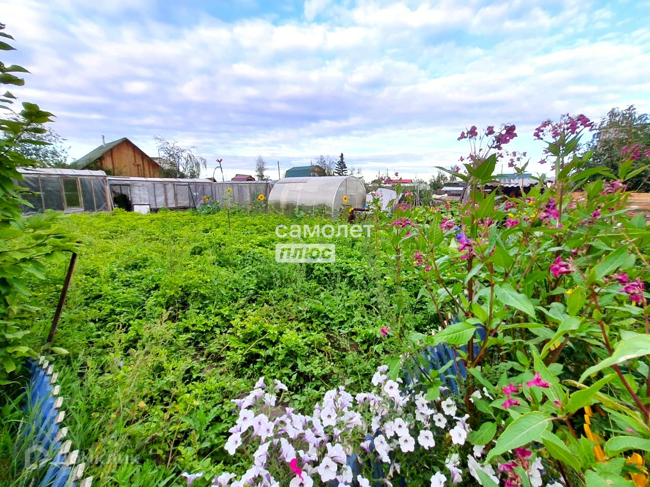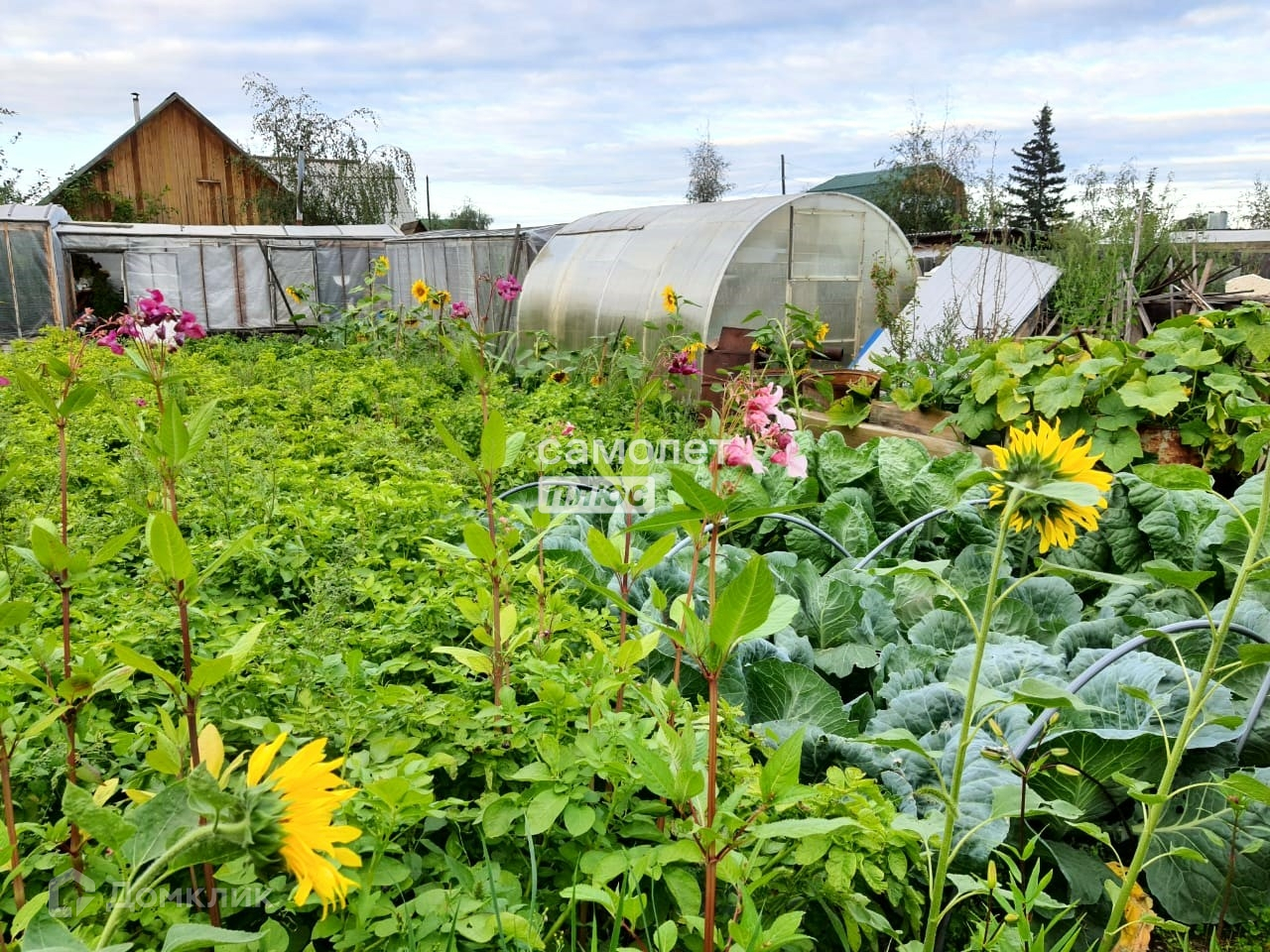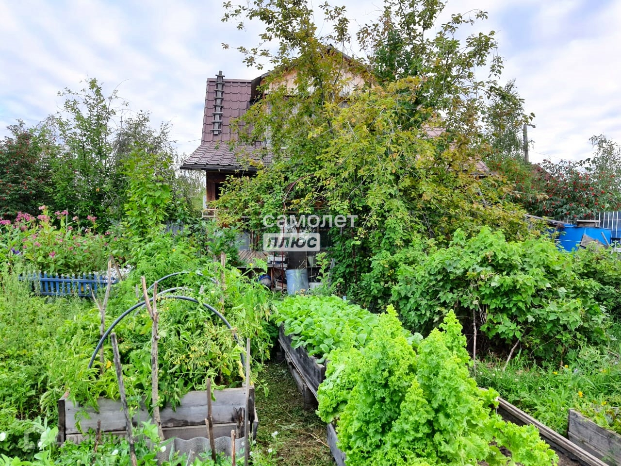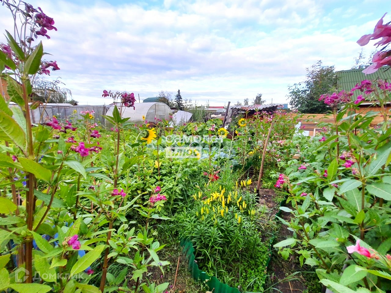 Черемуха 2 куста, сирень 2 куста, черная смородина 4 куста, малина, жимолость, клумбы под цветы, много грядок, огород .