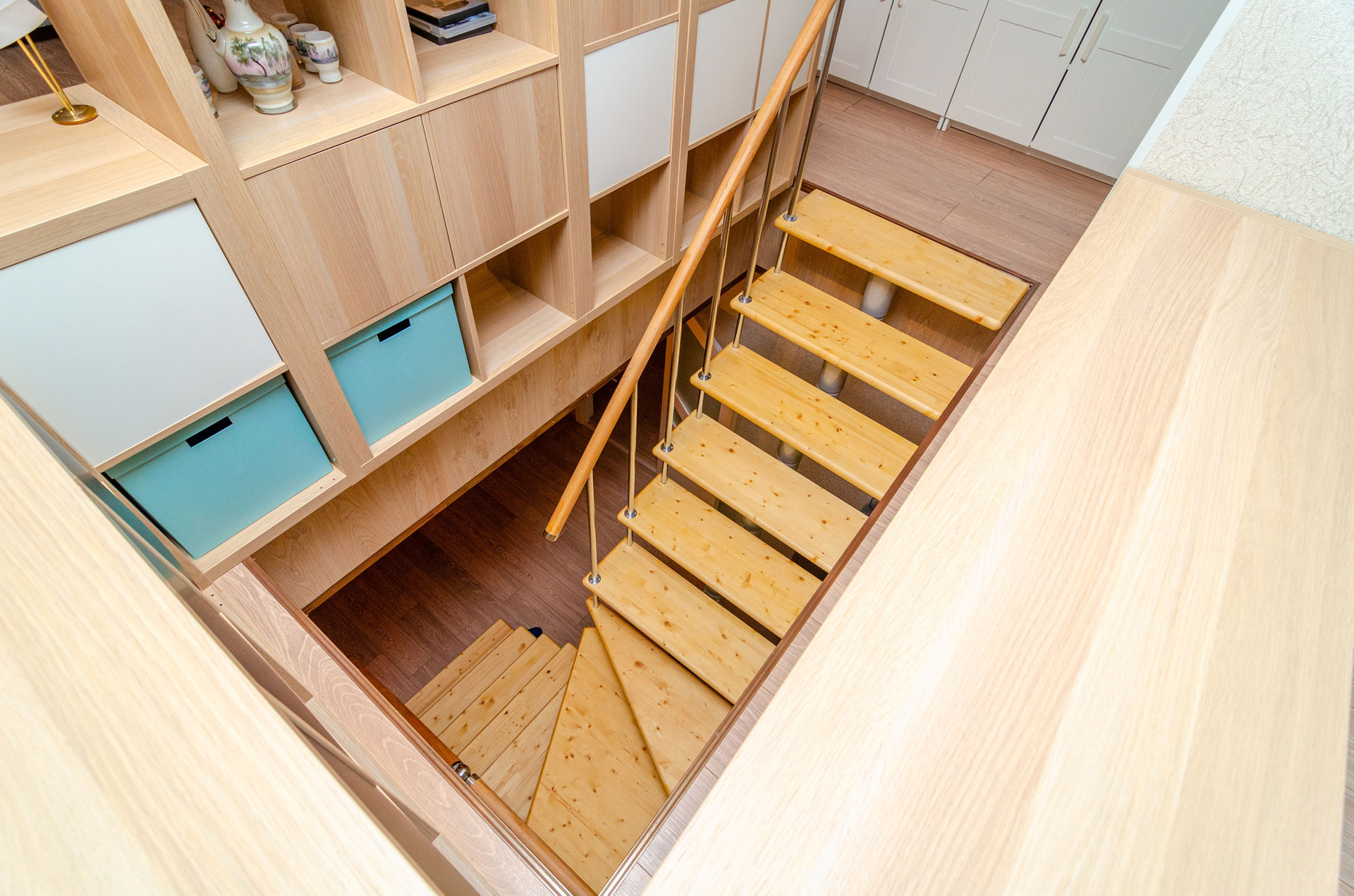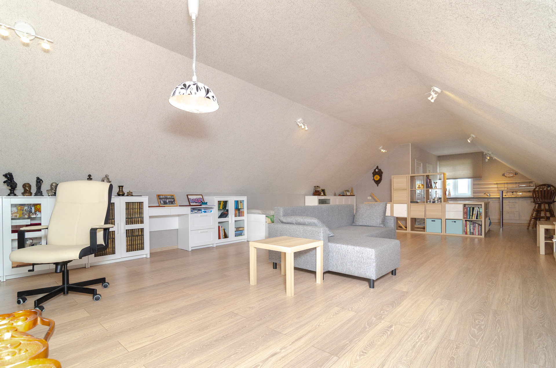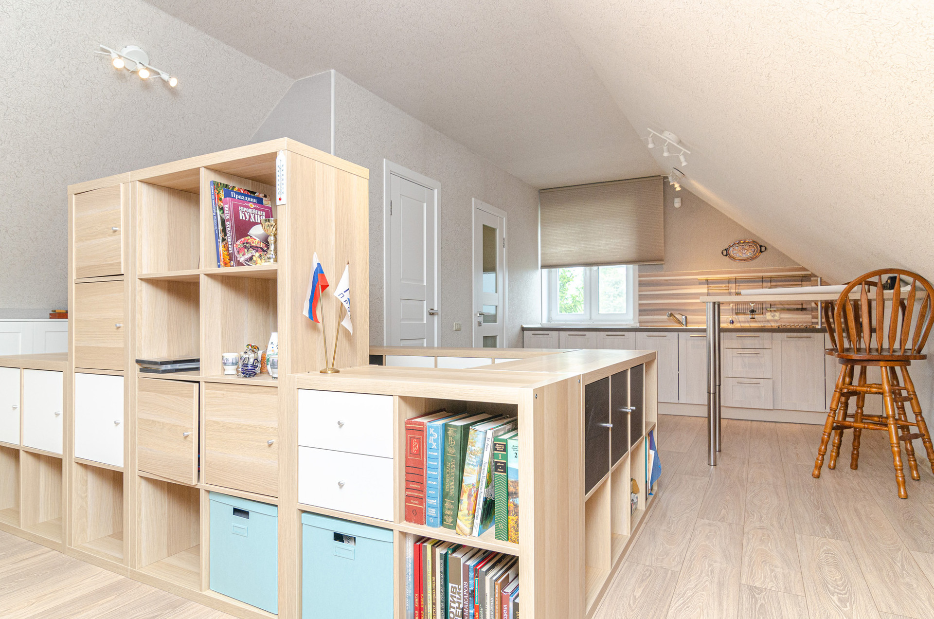 Студия. На этаже спальня, кухня, санузел и кладовая. Жилое пространство зонировано лестницей.