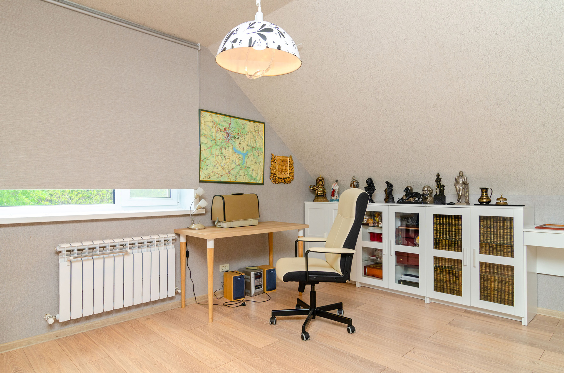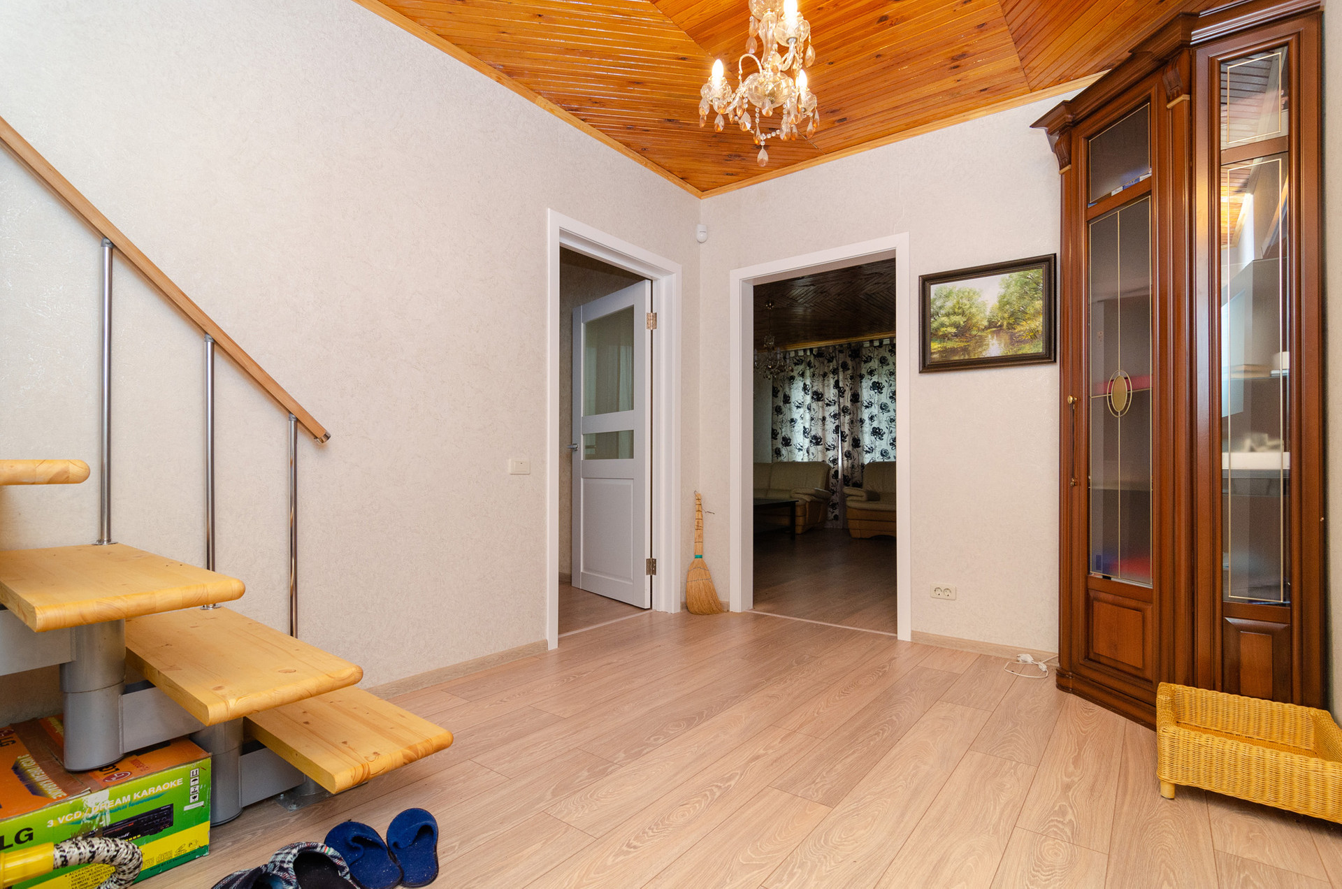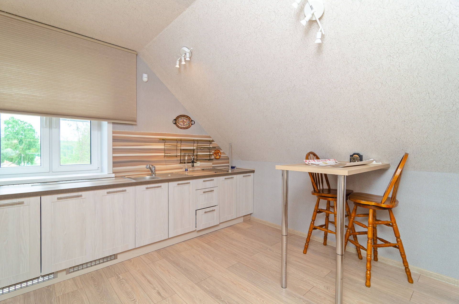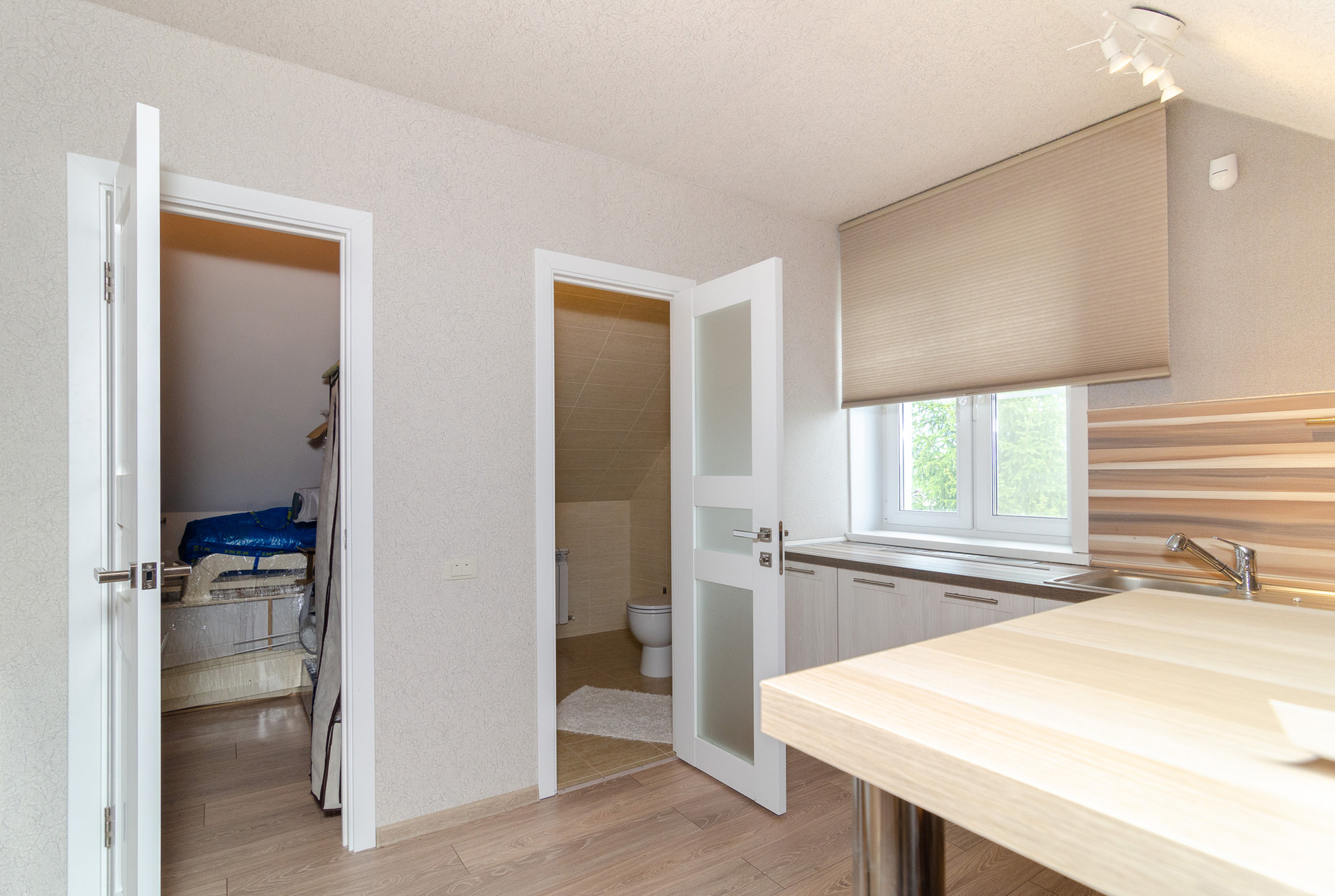 Студия. На этаже спальня, кухня, санузел и кладовая. Жилое пространство зонировано лестницей.