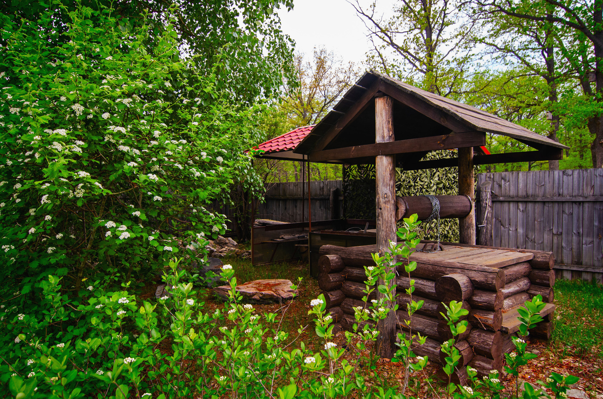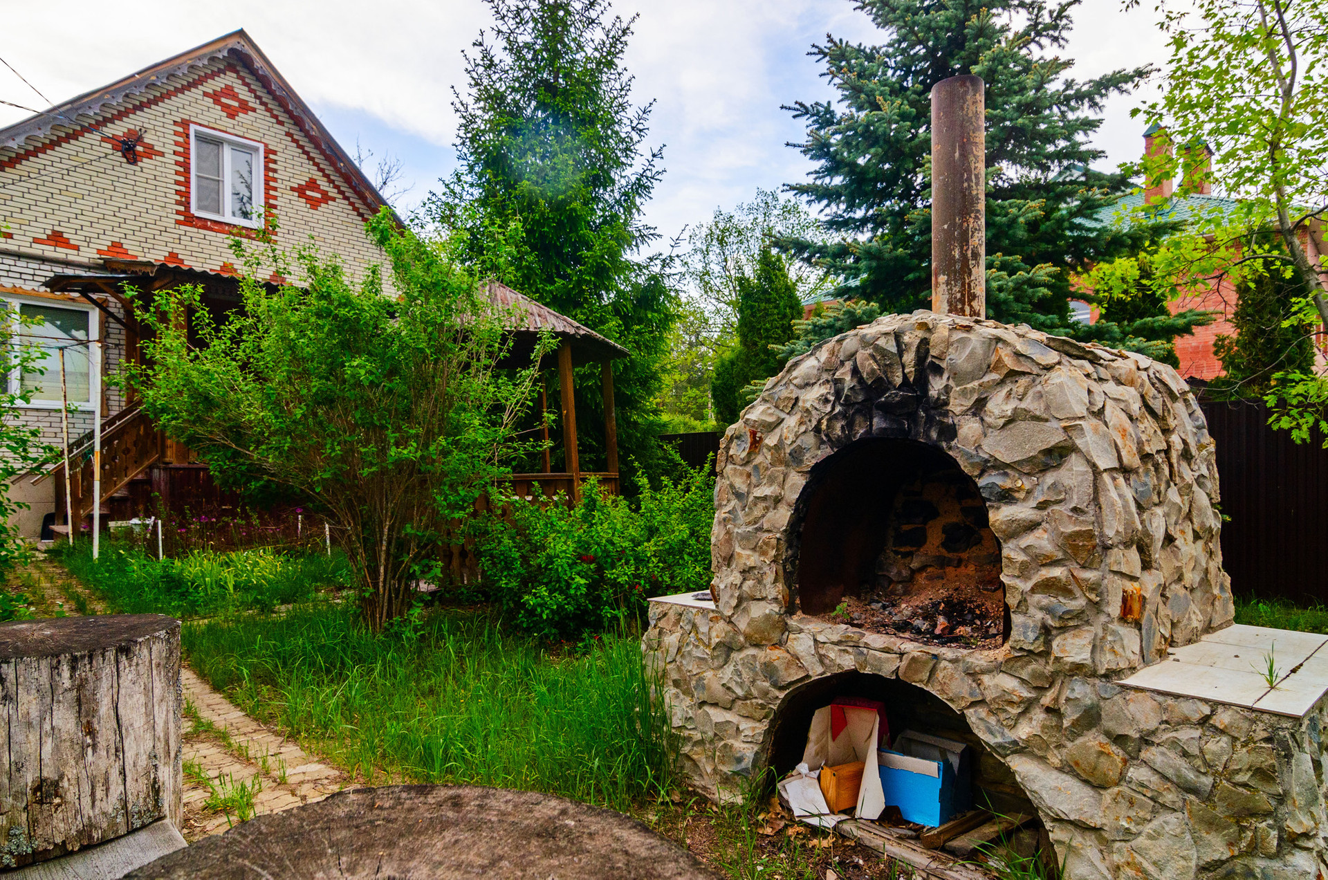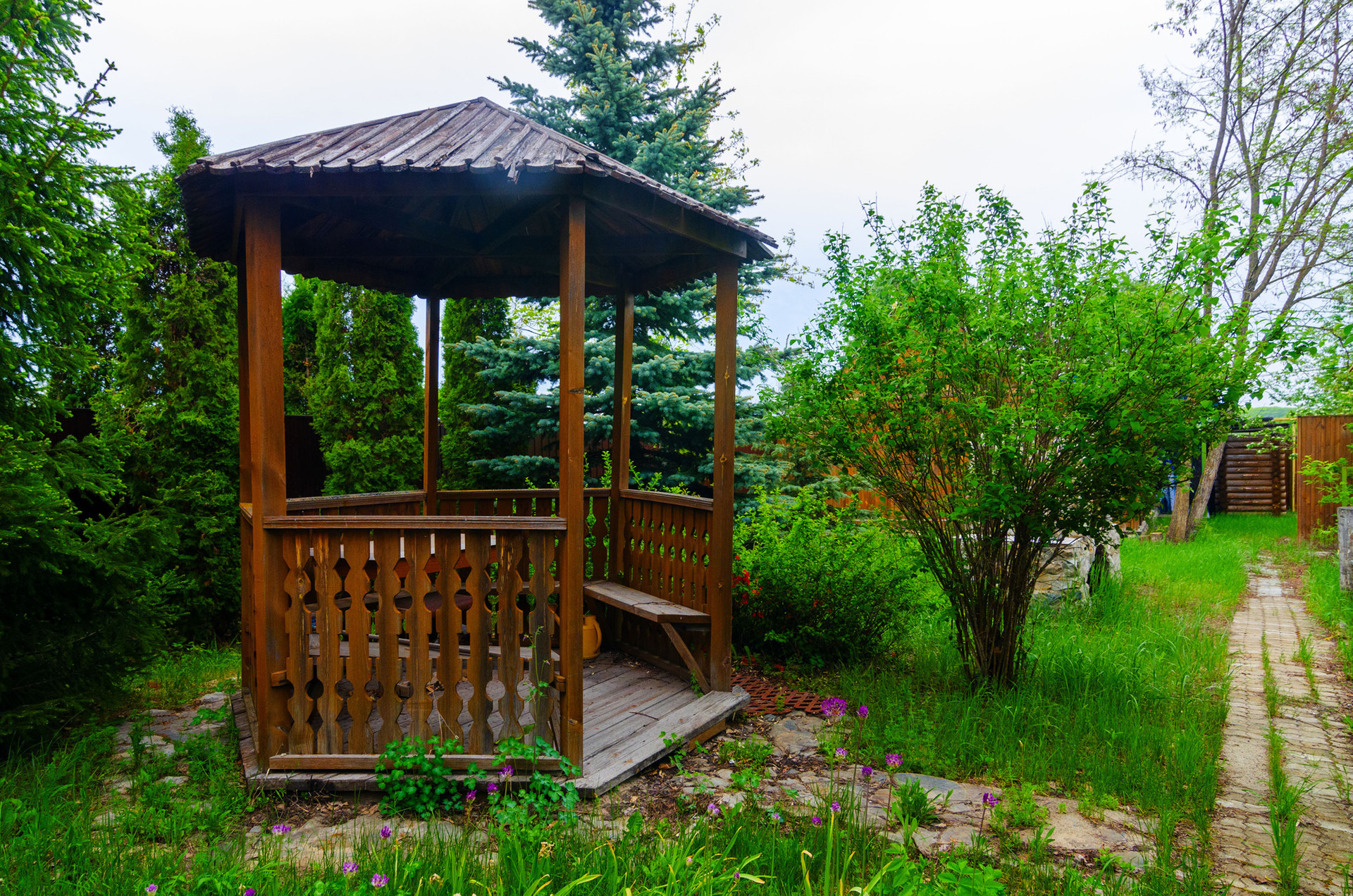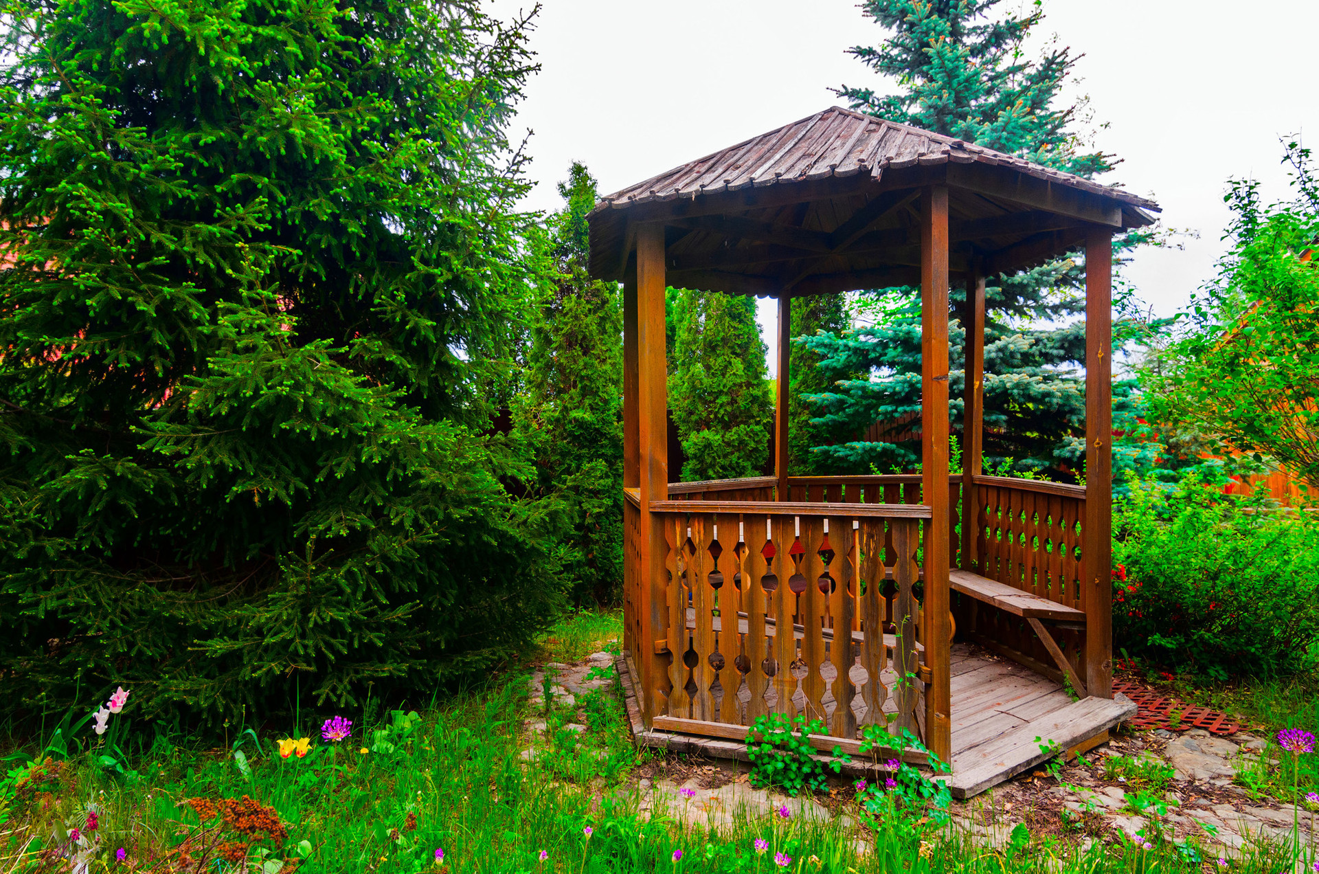 5-ти метровая голубая ель рядом с беседкой, окруженная туями, елями и аккуратными кустарниками, будет приятно наряжать под новый год и наполнять двор праздником.