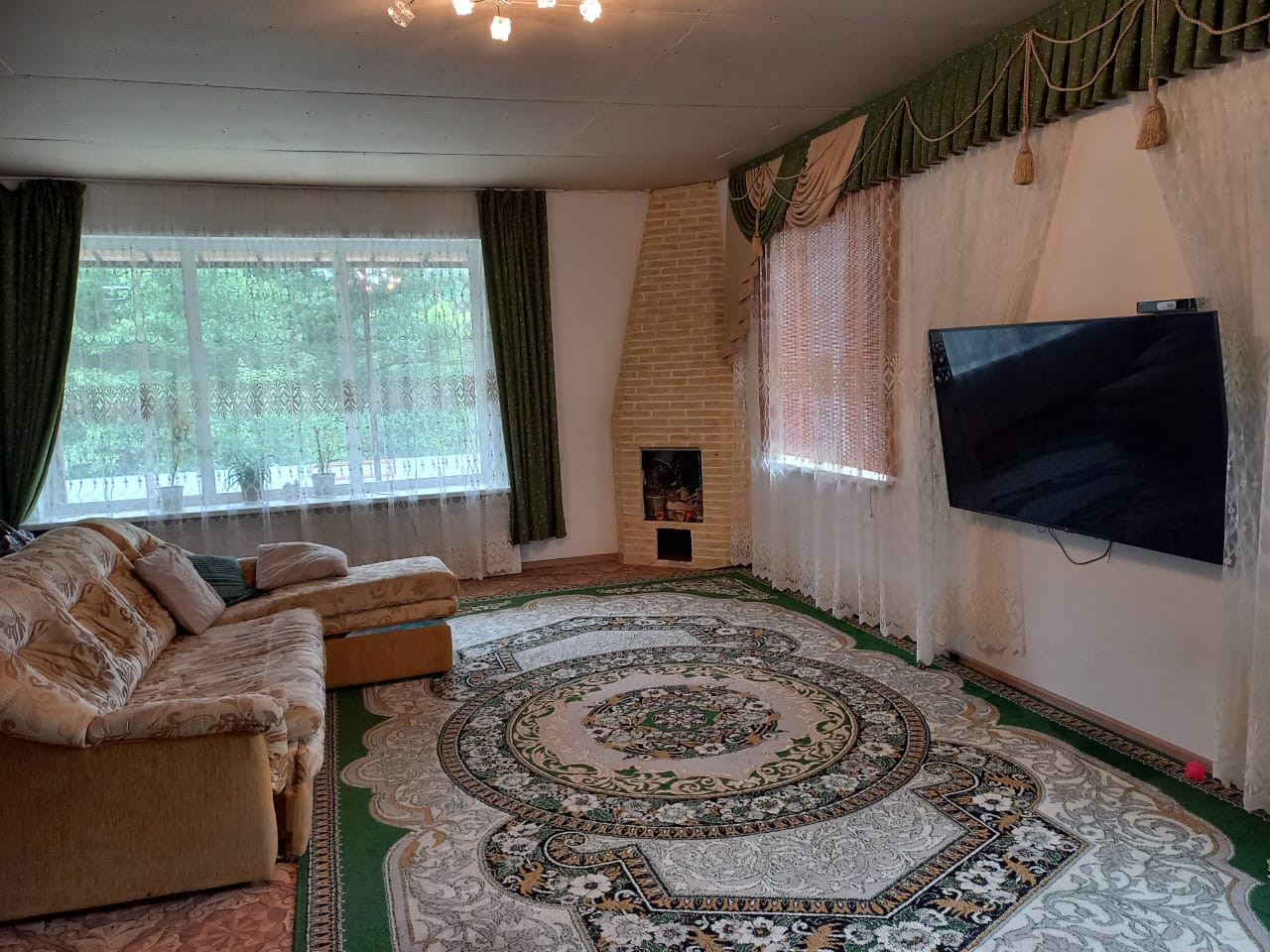 Просторная кухня-гостиная с большими окнами и декоративным камином.