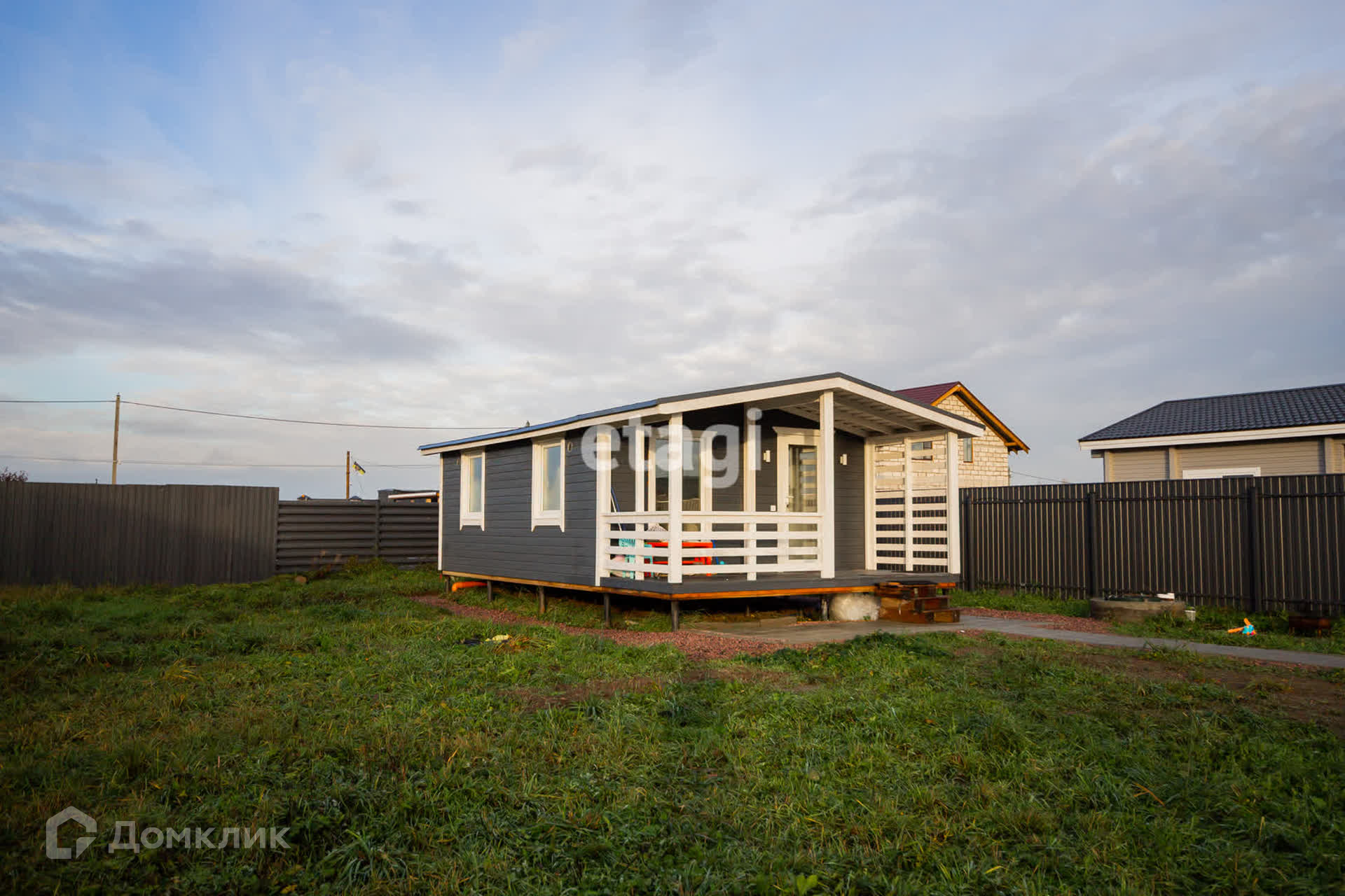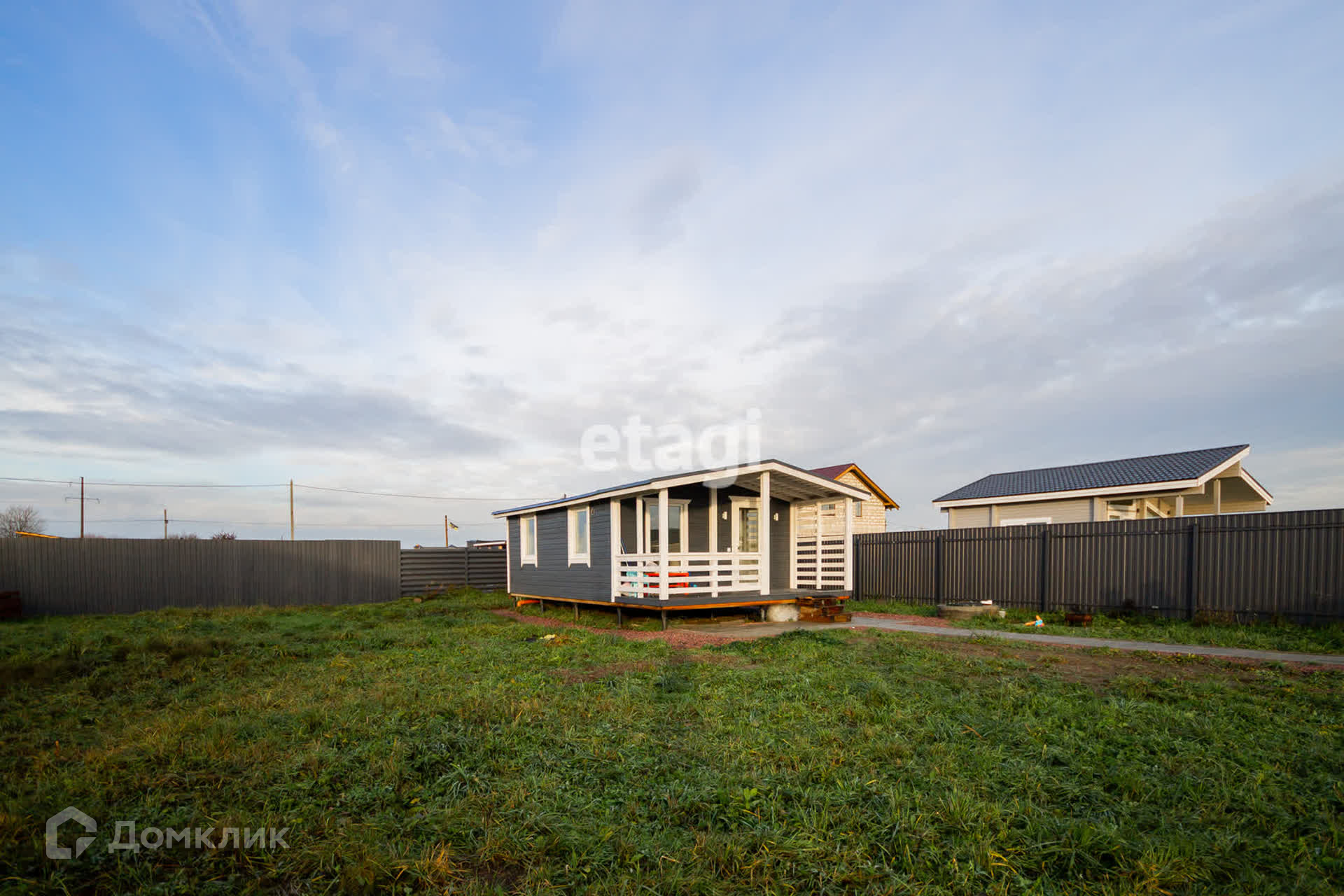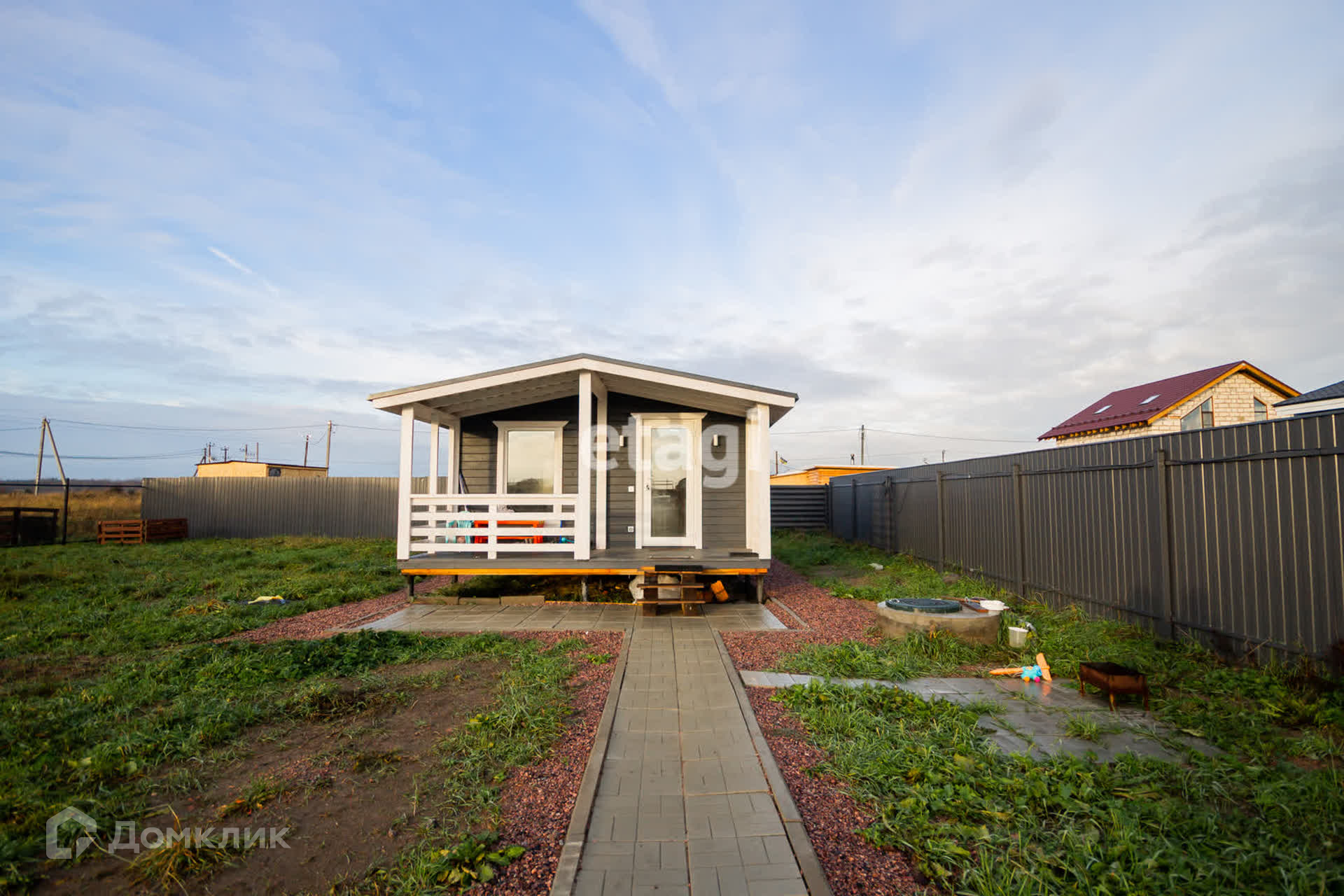 Участок обнесен забором, есть механические ворота, детская площадка, вымощенная дорожка от калитки до дома.