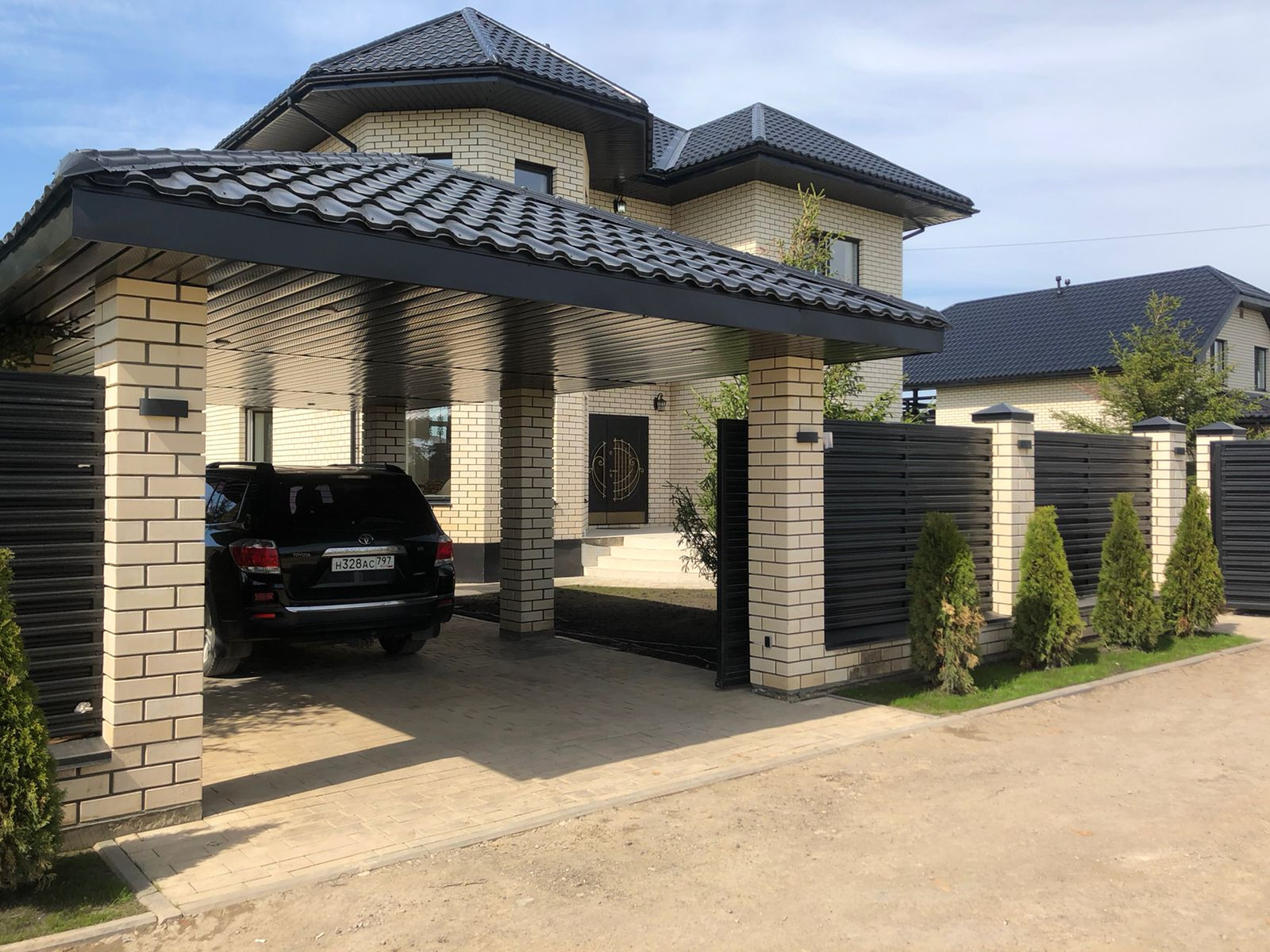Забор металлопрофиль по периметру. Крытое парковочное место. Рядом река Москва, лесной массив.