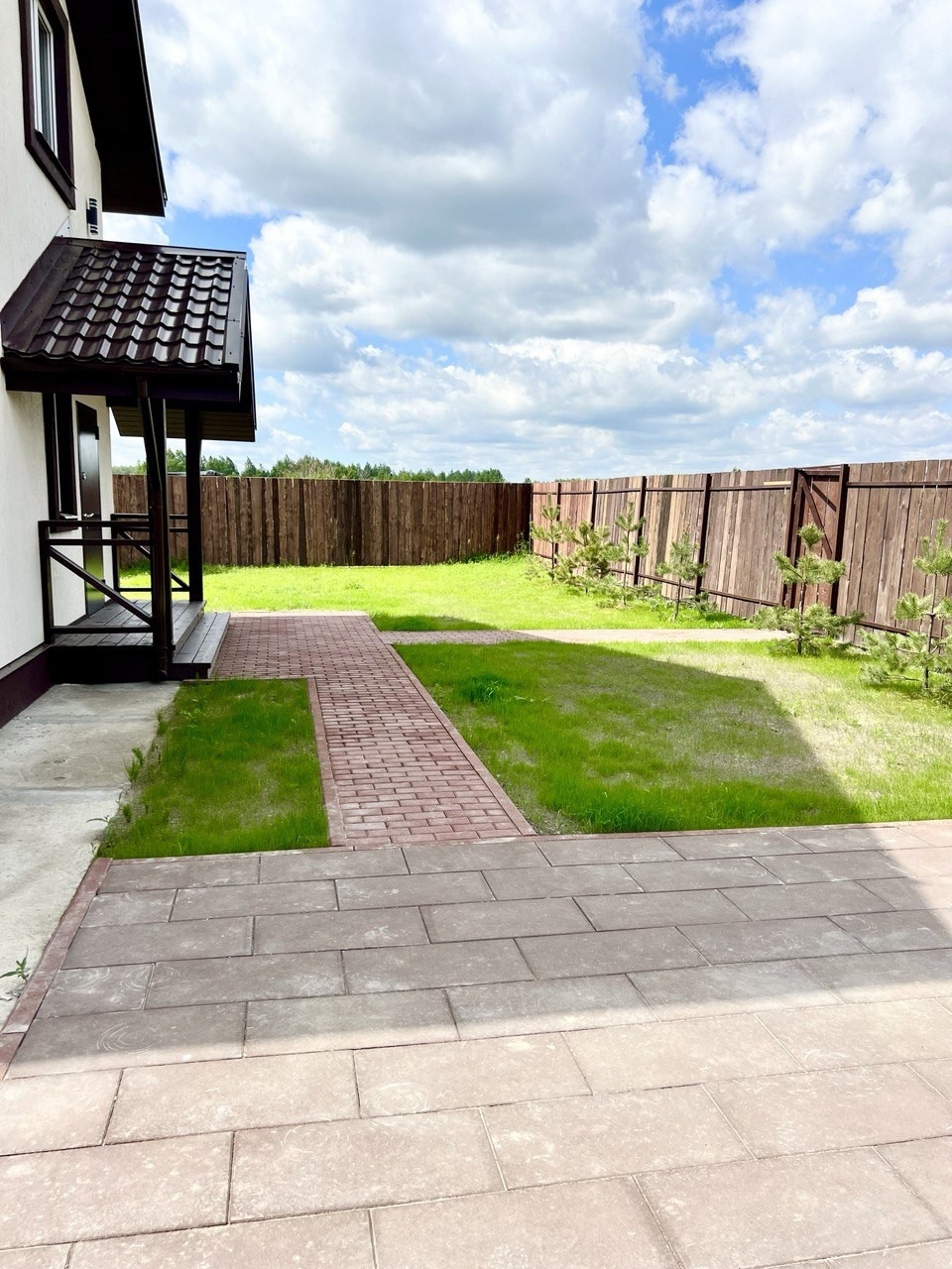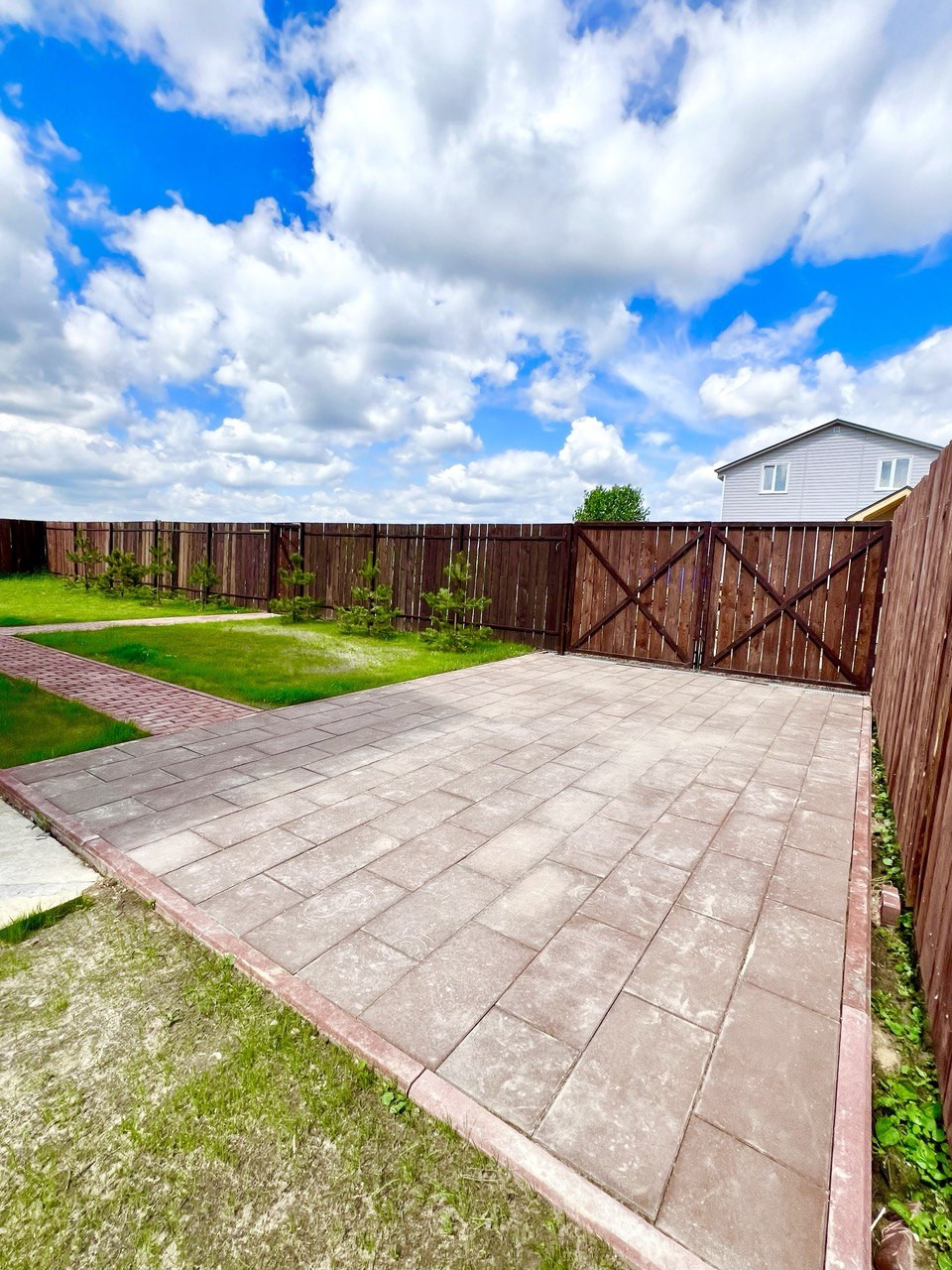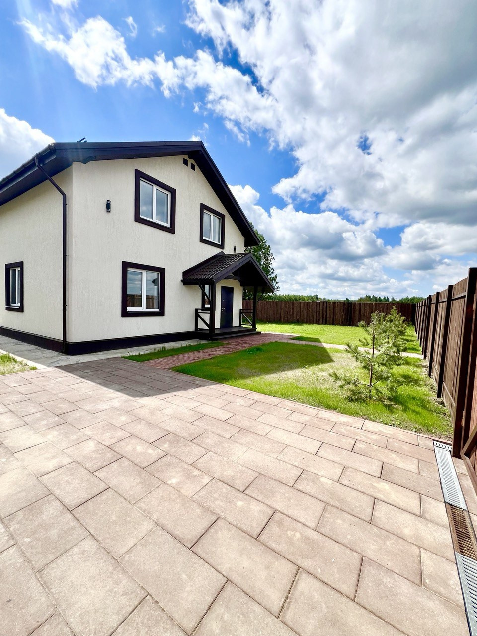 Зеленая территория участка оборудованна въездной площадкой и дорожкой к дому. Есть место для мангальной зоны. Аккуратные дорожки и место под парковку выложены тротуарной плиткой. Вокруг дома отмостка. По периметру участка забор с распашными воротами из обрезной доски. Вокруг участка сделан дренаж.