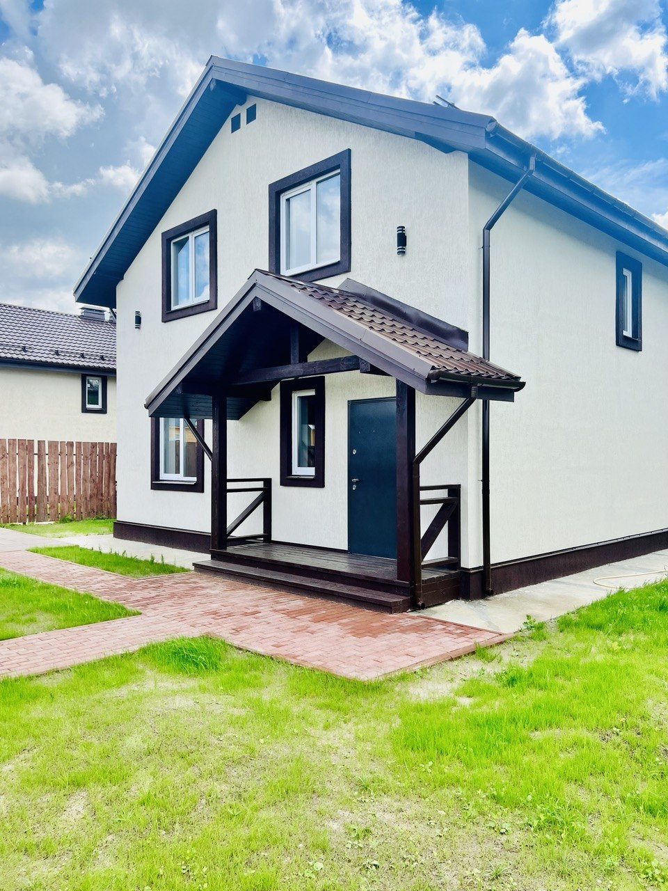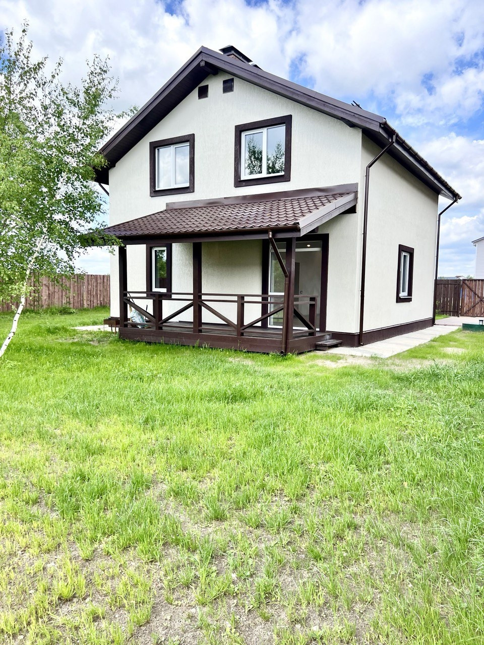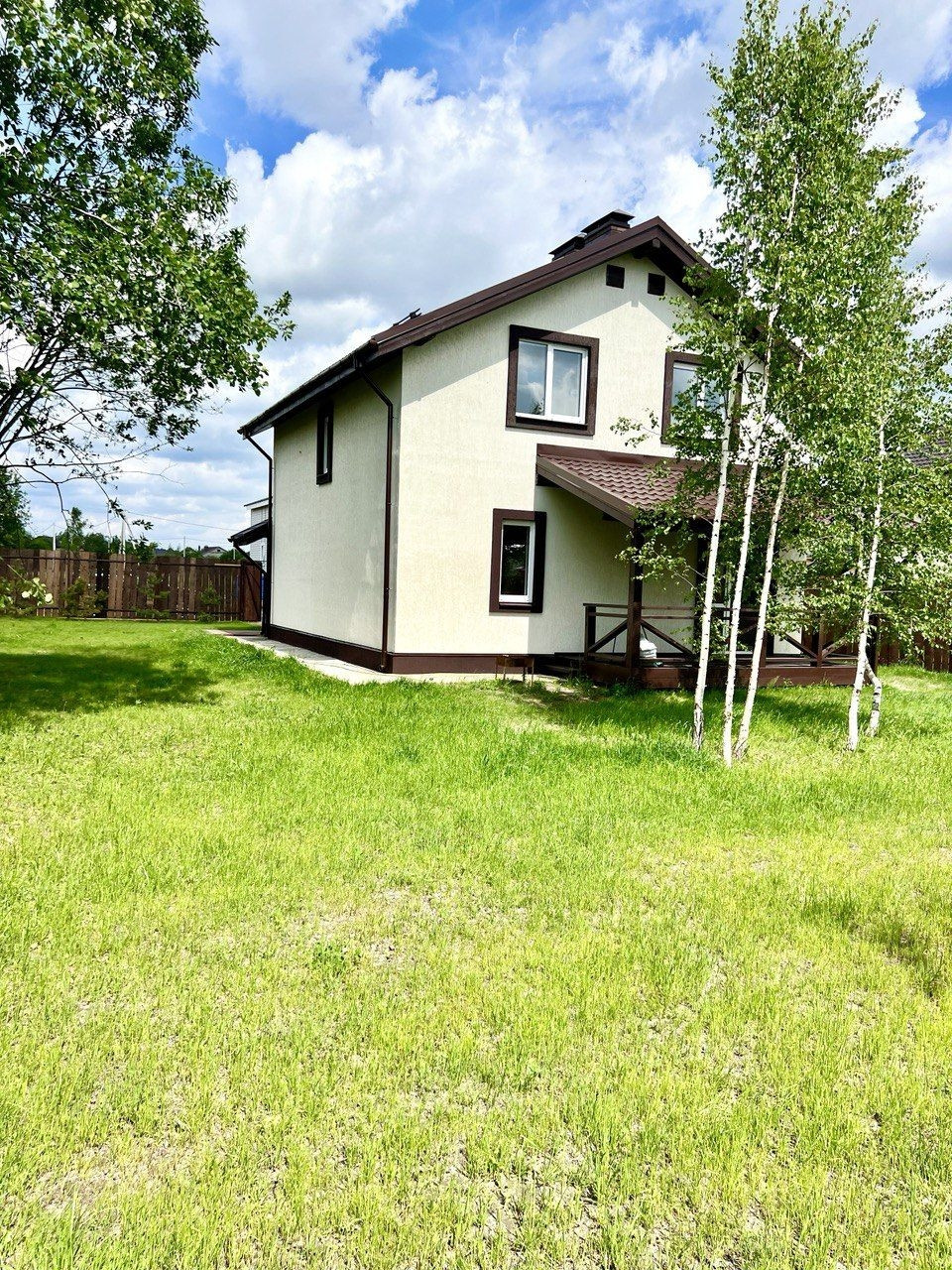 Зеленая территория участка оборудованна въездной площадкой и дорожкой к дому. Есть место для мангальной зоны. Аккуратные дорожки и место под парковку выложены тротуарной плиткой. Вокруг дома отмостка. По периметру участка забор с распашными воротами из обрезной доски. Вокруг участка сделан дренаж.