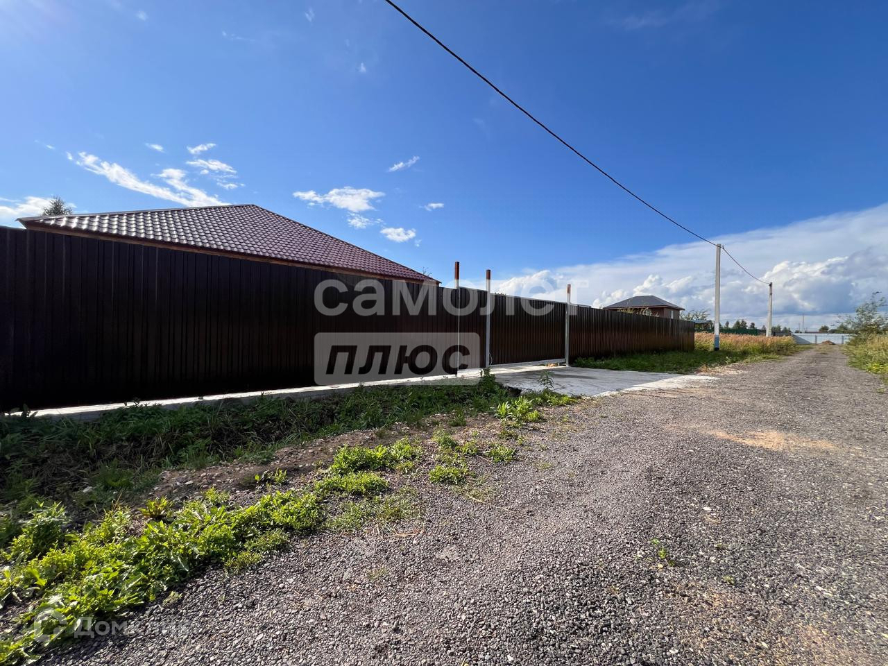 Участок ровной практически квадратной формы, огорожен забором из проф-настила с откатными воротами. Удобный въезд и парковка у дома забетонированы.