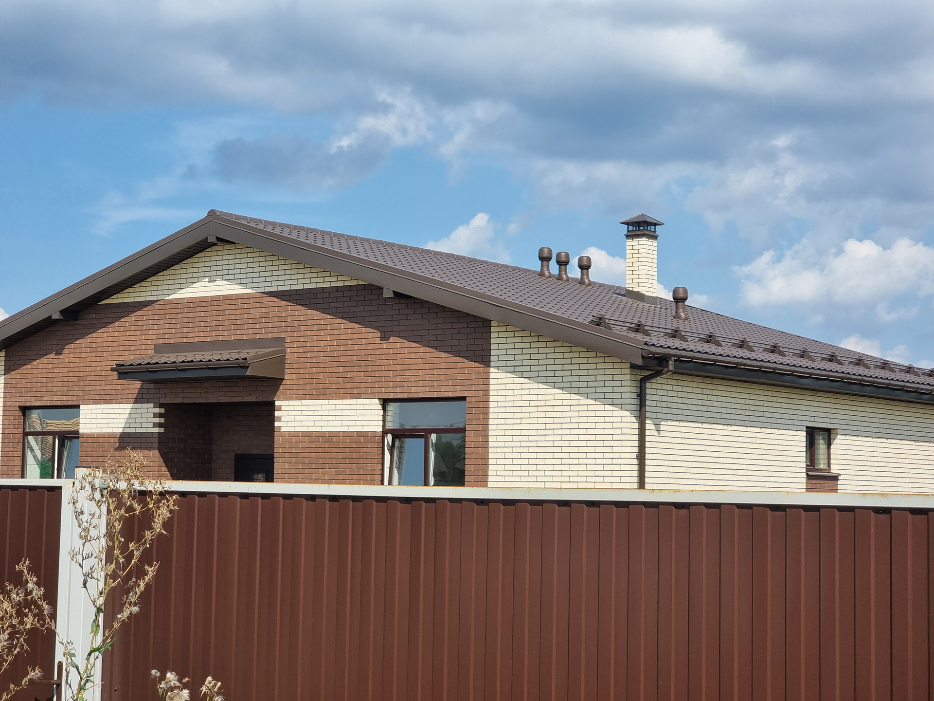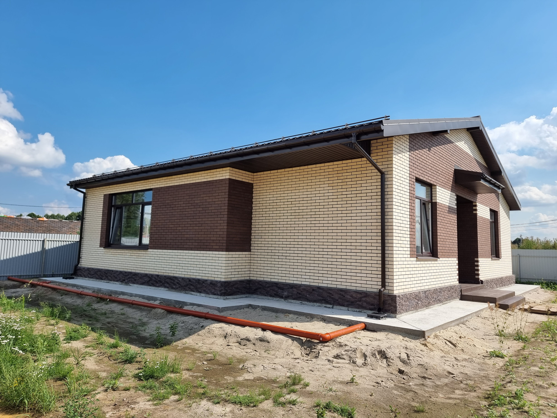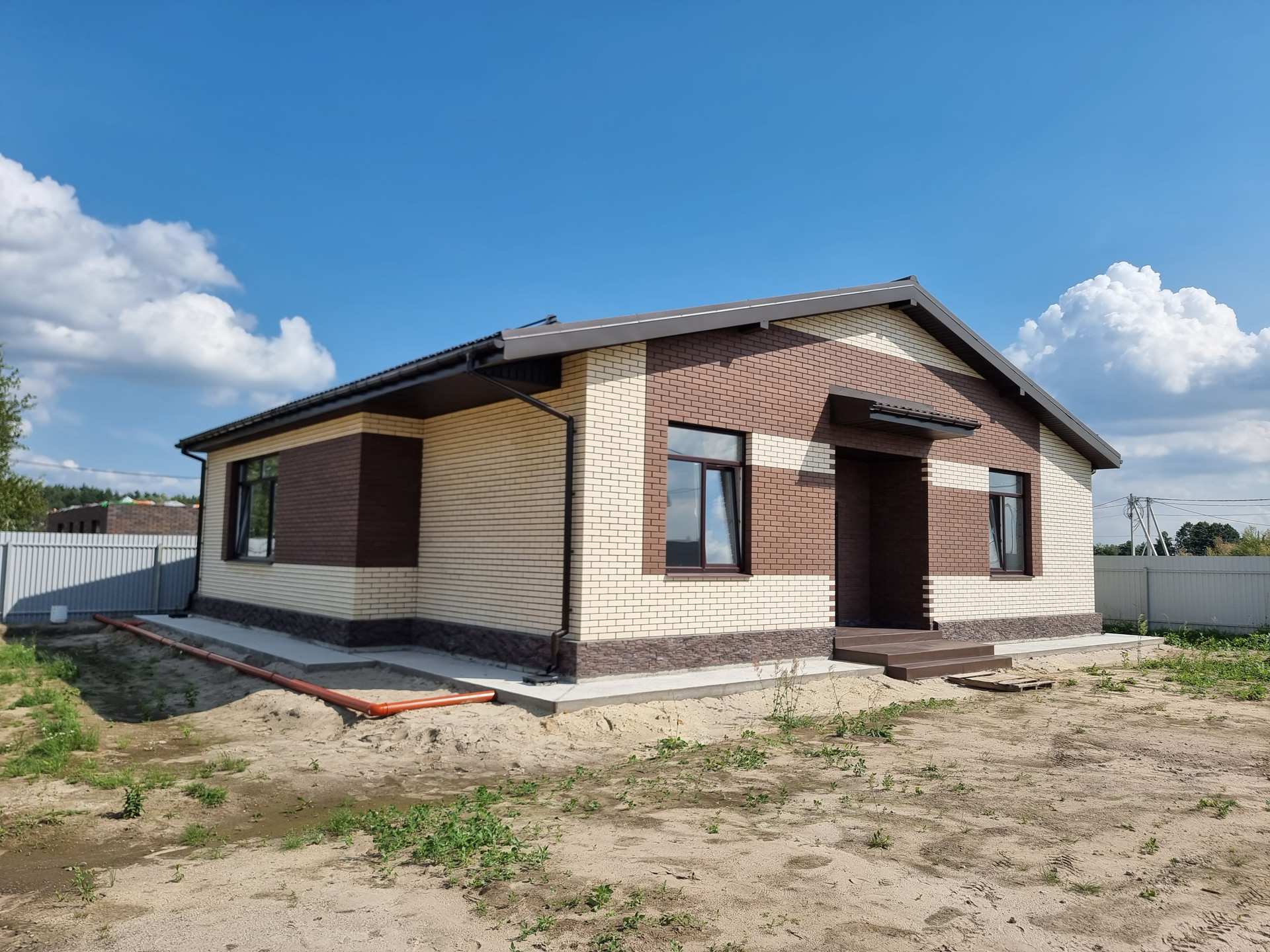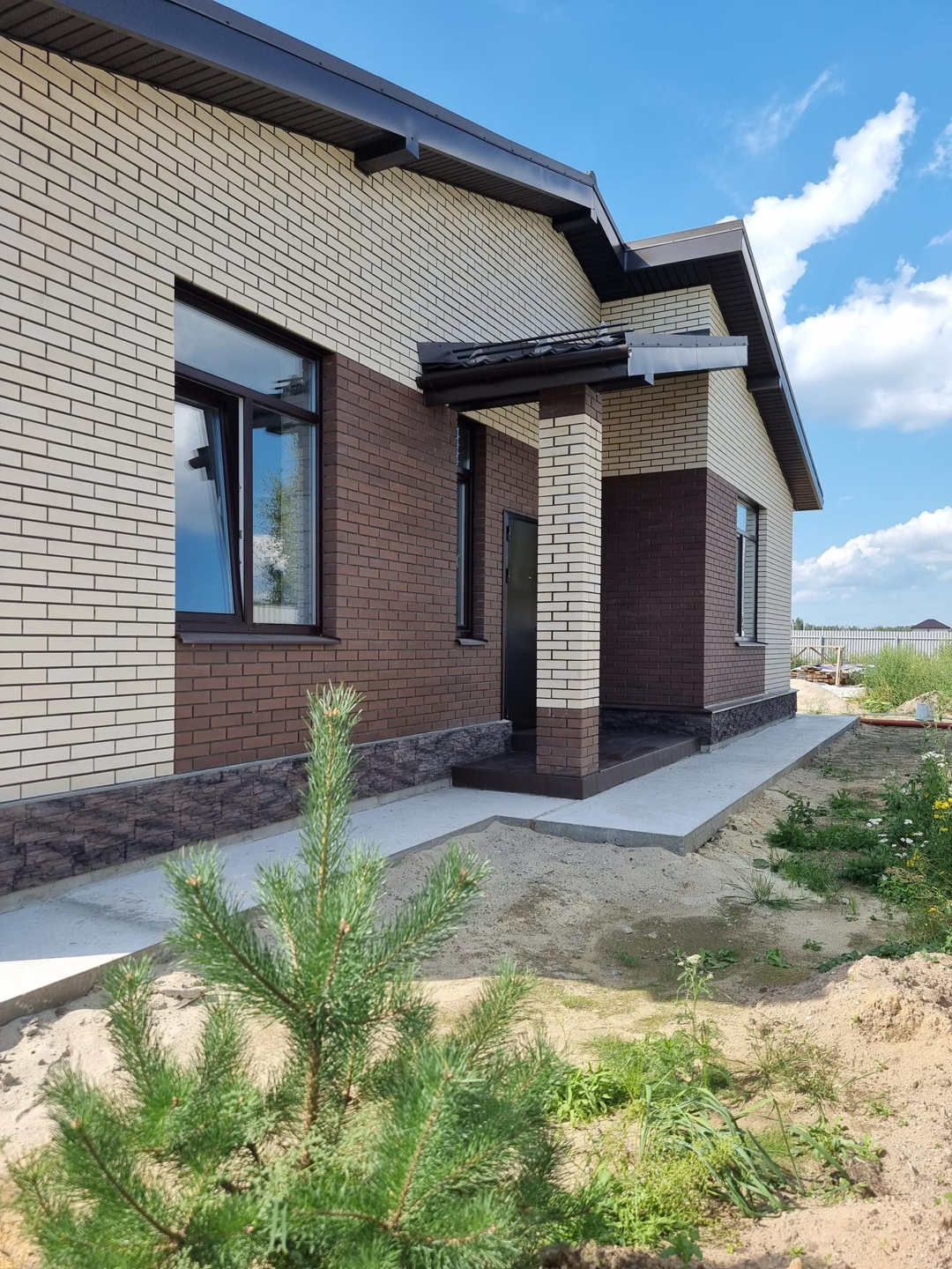 Фундамент тип: плита, м300 бетон на гравии, армирован 12 арматурой. Электричество 15 кВт. Стены: пеноблок "Бонолит" 600/375/250 D400, облицовка кирпич "Терех" Дюна+Мокка. Крыша: металлочерепица, утепление 200 технониколь.