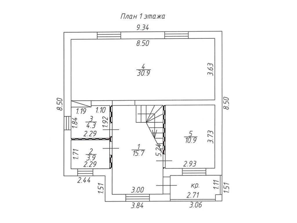 1 этаж: прихожая, кухня-гостиная 31м2, спальня 11м2, котельная, санузел.