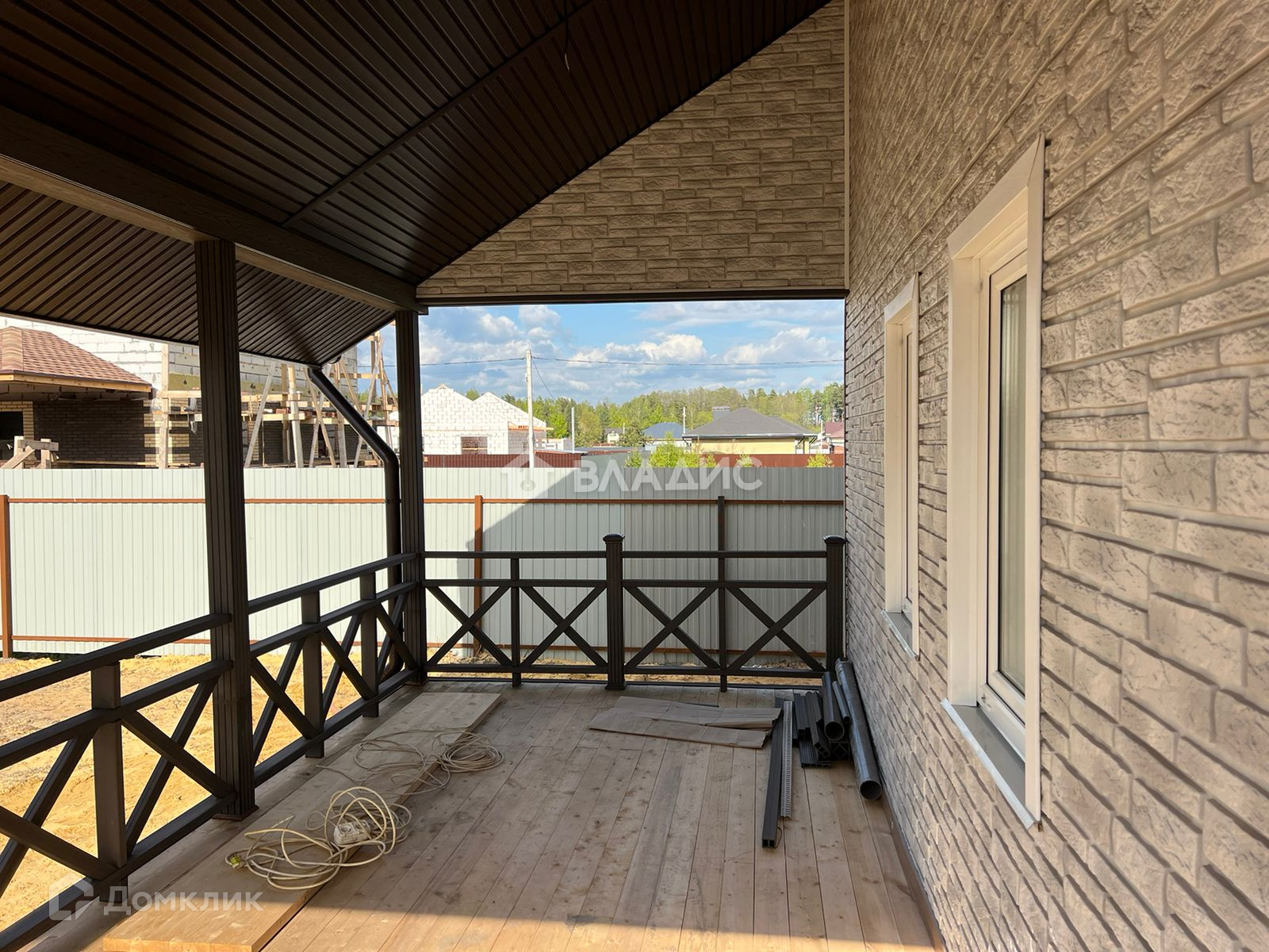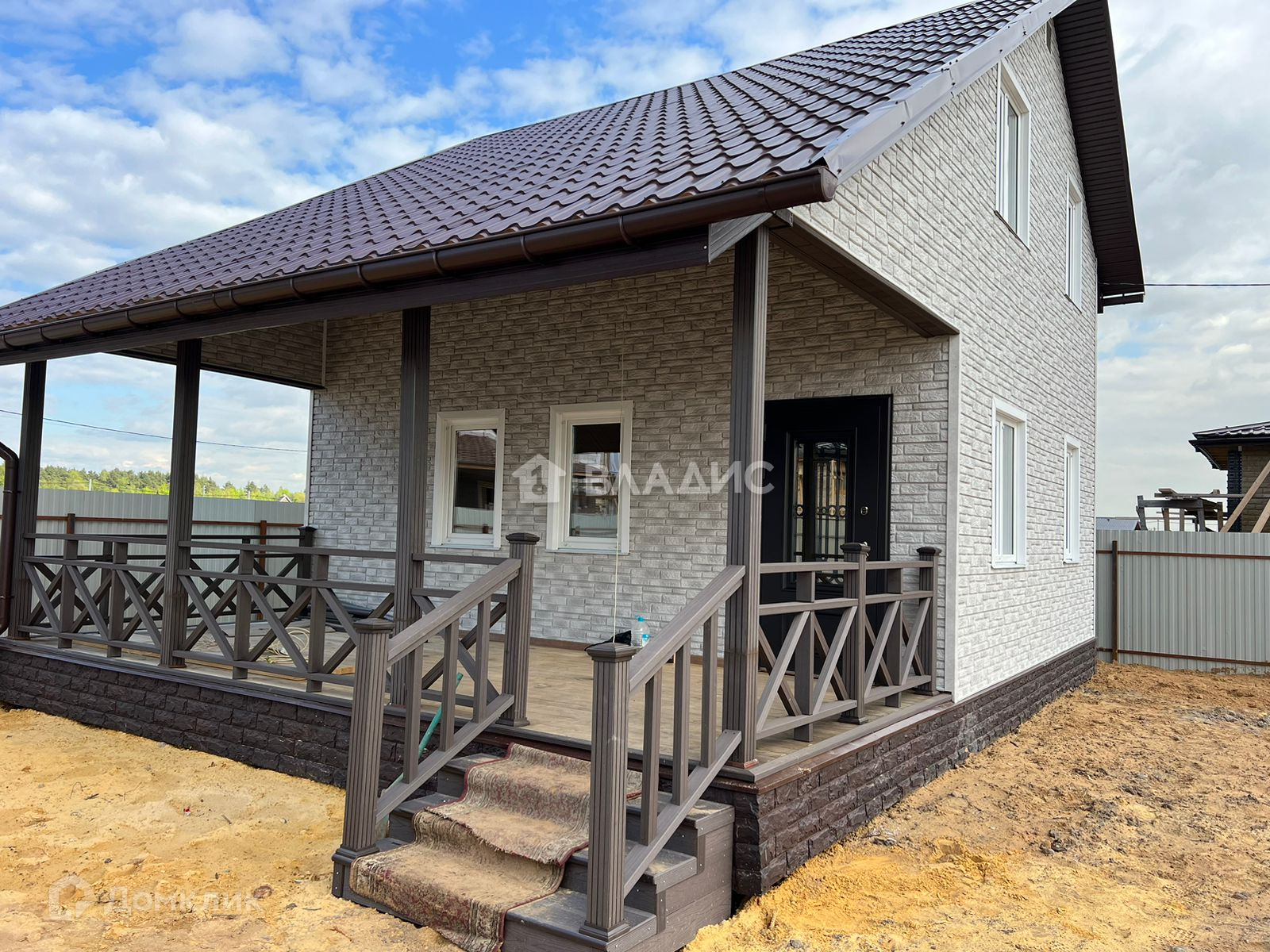 Построен из дерева на свайном фундаменте, снаружи обшит сайдингом, имитирующим кирпичную кладку.Установлены пластиковые стеклопакеты, крыша - металлочерепица.