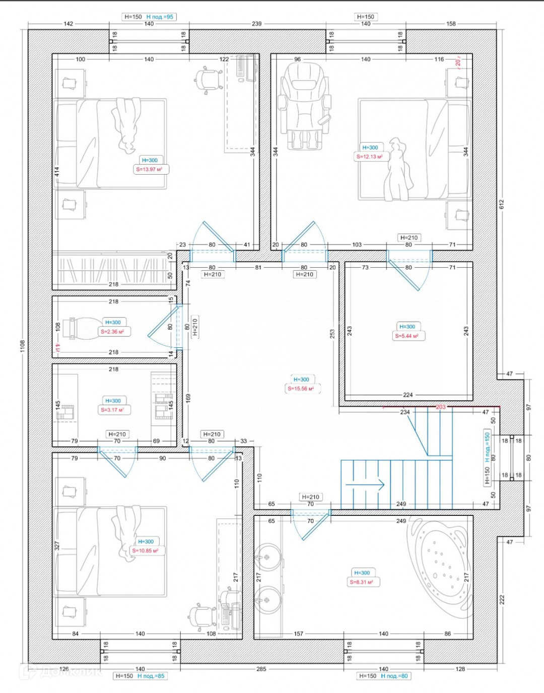 ·       2 ЭТАЖ – 3 спальни + гардеробные в них, отдельный туалет и большая ванная комната.