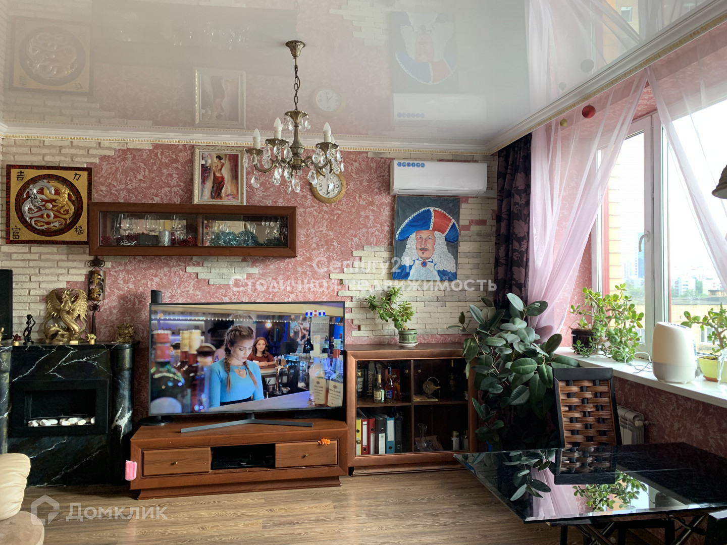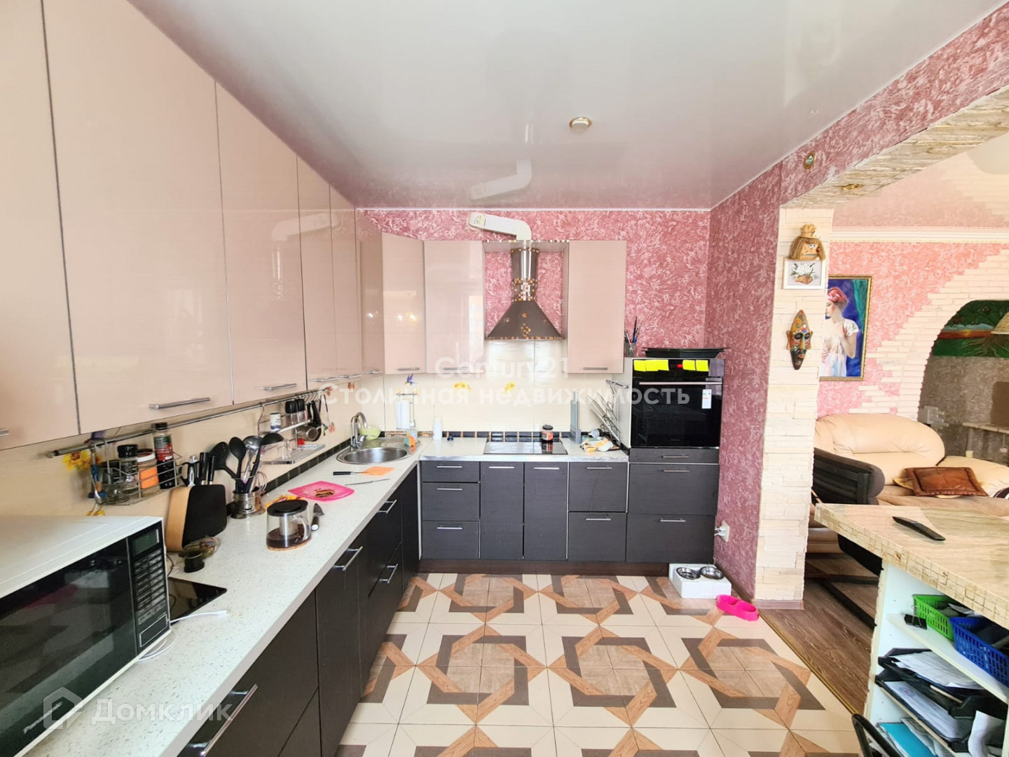 Гостиная совмещена с кухней (общая площадь 31м.кв.) В гостиной установлен кондиционер и биокамин (основа из мрамора). Кухня cо встроенной техникой: стеклокерамическая варочная панель Whirlpool, духовой шкаф Samsung с сенсорной панелью и выдвижными противнями, посудомоечная машина Bosh, большая барная стойка из натурального камня.