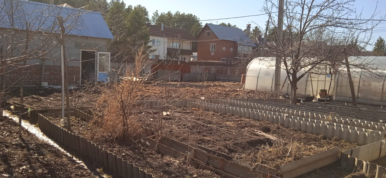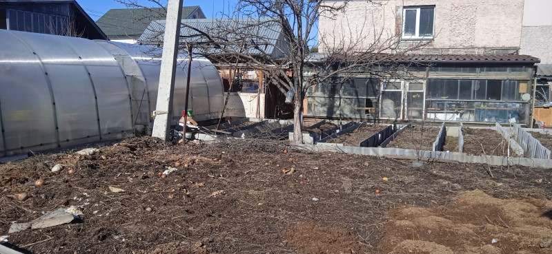 Участок разработан, ухожен, есть две теплицы, огорожен высоким забором из профлиста. Большое преимущество - это расположение дома на перекрёстке, установлены ворота, подъезд  к дому с двух сторон.