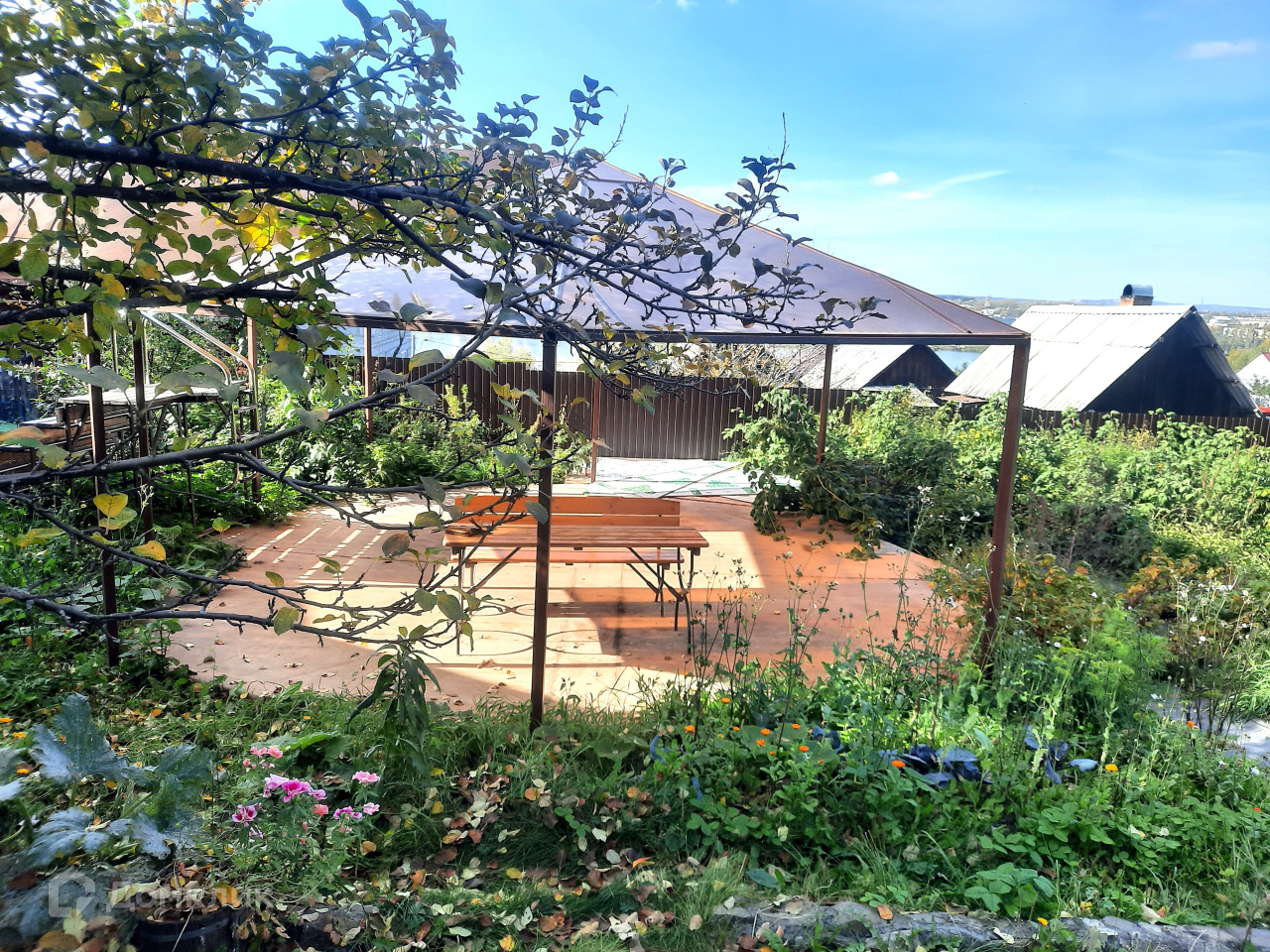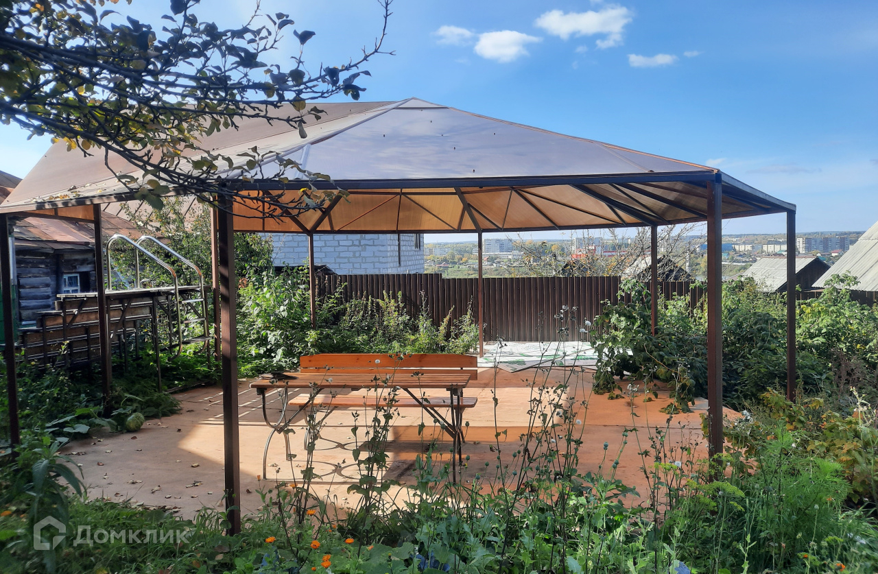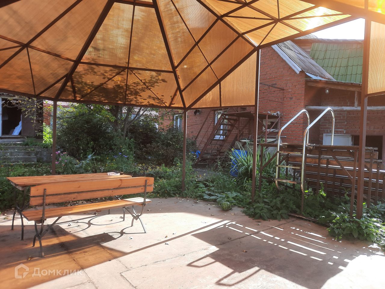 На просторном участке установлены сарай, баня, навес хозяйственный для автомобиля, и навес из поликарбоната на металлическом каркасе, который можно использовать как летнюю крышу для мобильного бассейна.