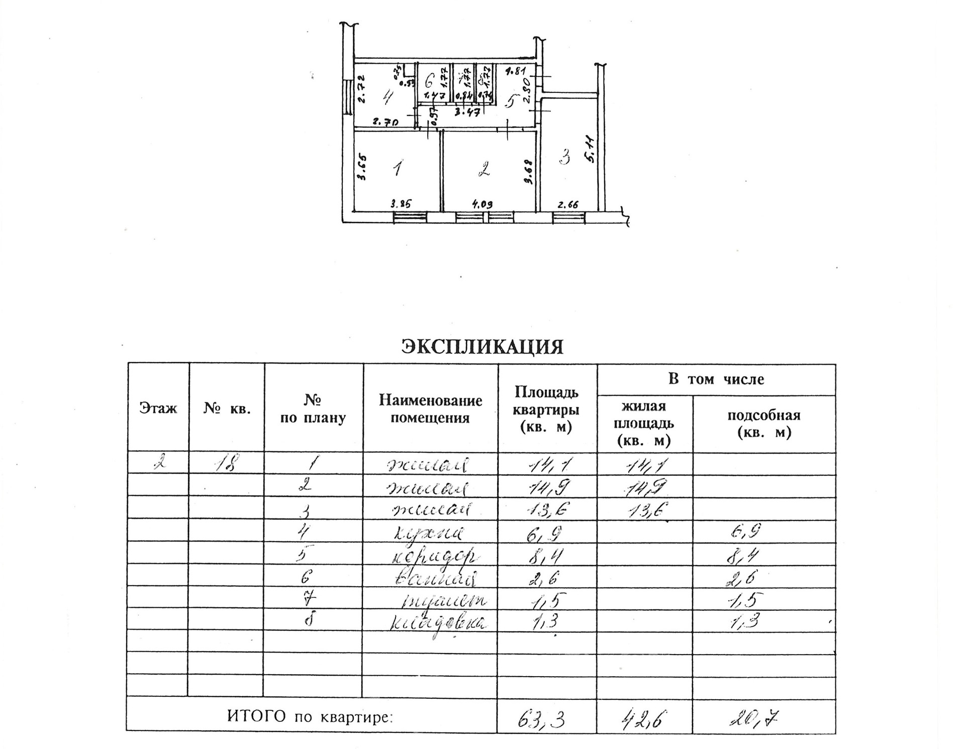 Общая площадь квартиры 63,3 кв.м., жилая 42,6 кв.м., кухня 6,9 кв.м.