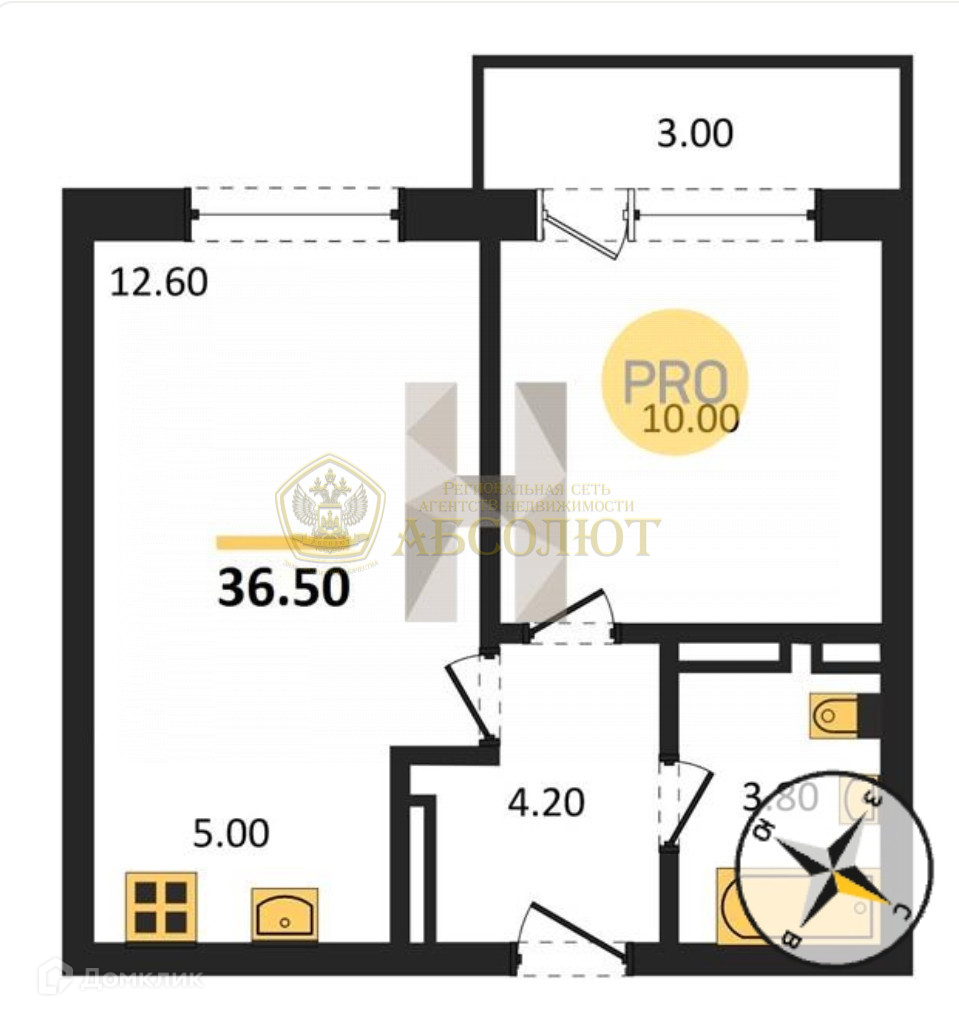 Общая площадь 36.5 м2
