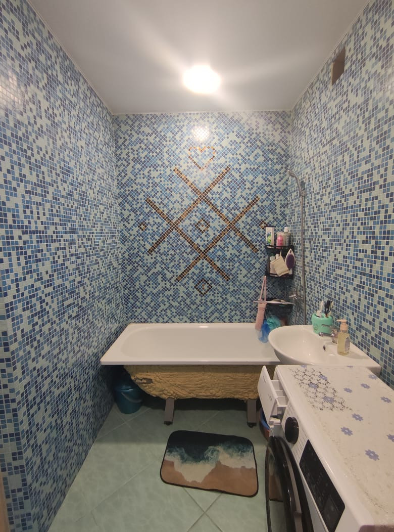 Санузел большой вместительный: стены- мозаика, пол-плитка, потолок- натяжной.